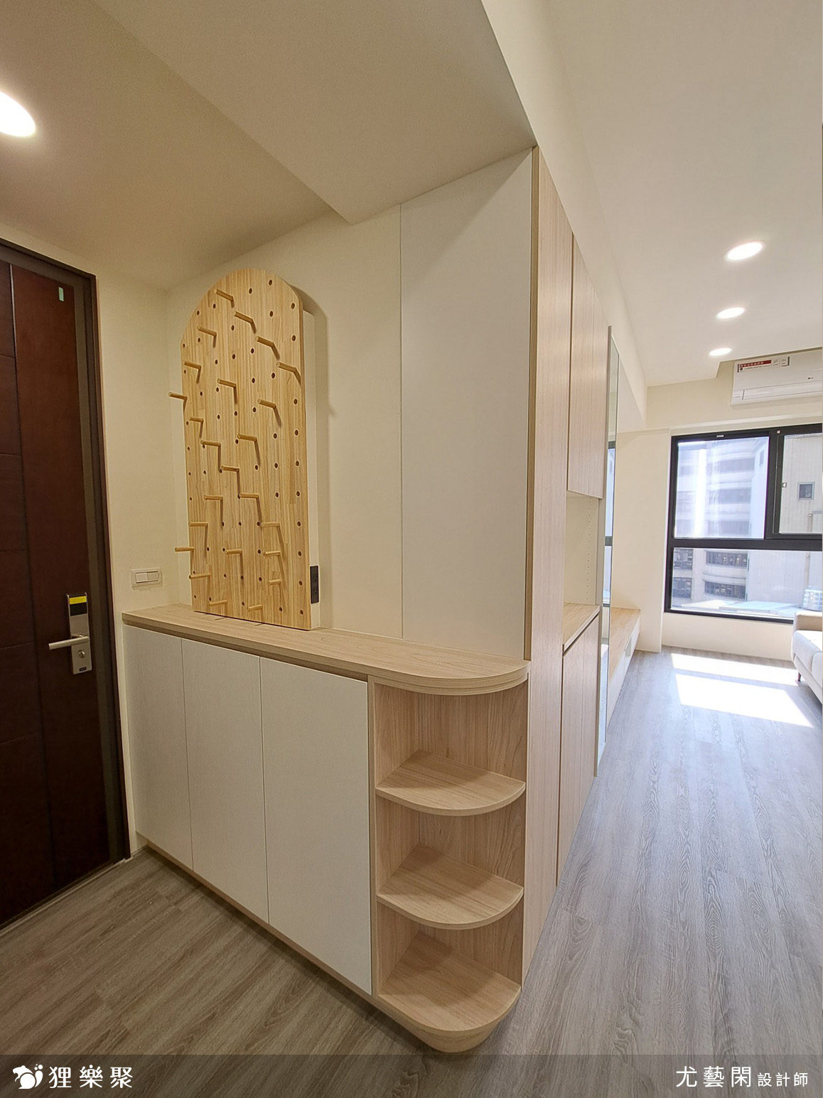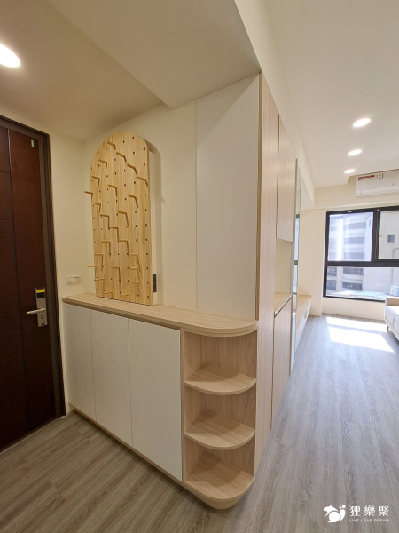 玄關進門到客廳皆配置了收納櫃,搭配傘具吊掛、置物平台、洞洞板等設計,讓屋主進出門不再手忙腳亂,滿足不同機能與各區域的儲物需求。由於屋主不希望動到牆面,因此設計師將所有線路以明管配線,並隱藏於櫃體後方,使空間看起來清爽美觀不壓迫。