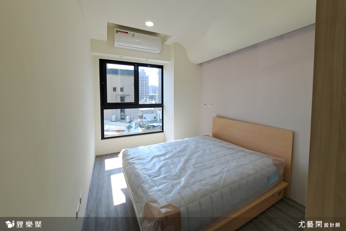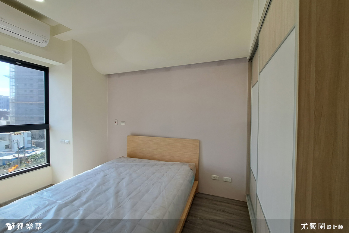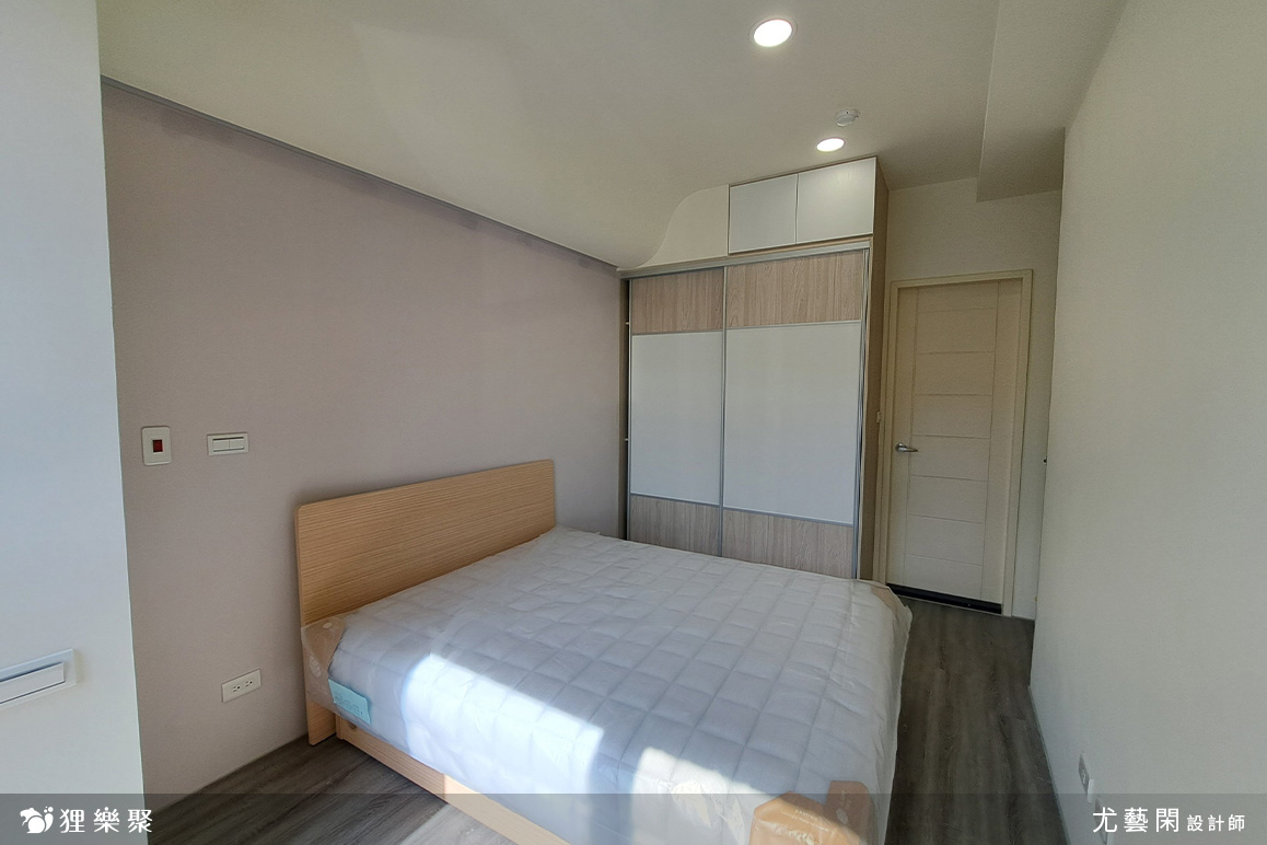 主臥床頭上方以曲面造型取代常見的弧型設計,藉此包覆床頭大樑,並加裝照明增添氛圍感。主臥除了大型的衣物收納櫃外,還搭配了木質調的家具,一方便能節省開支,也方便為不同時期需求進行更替。