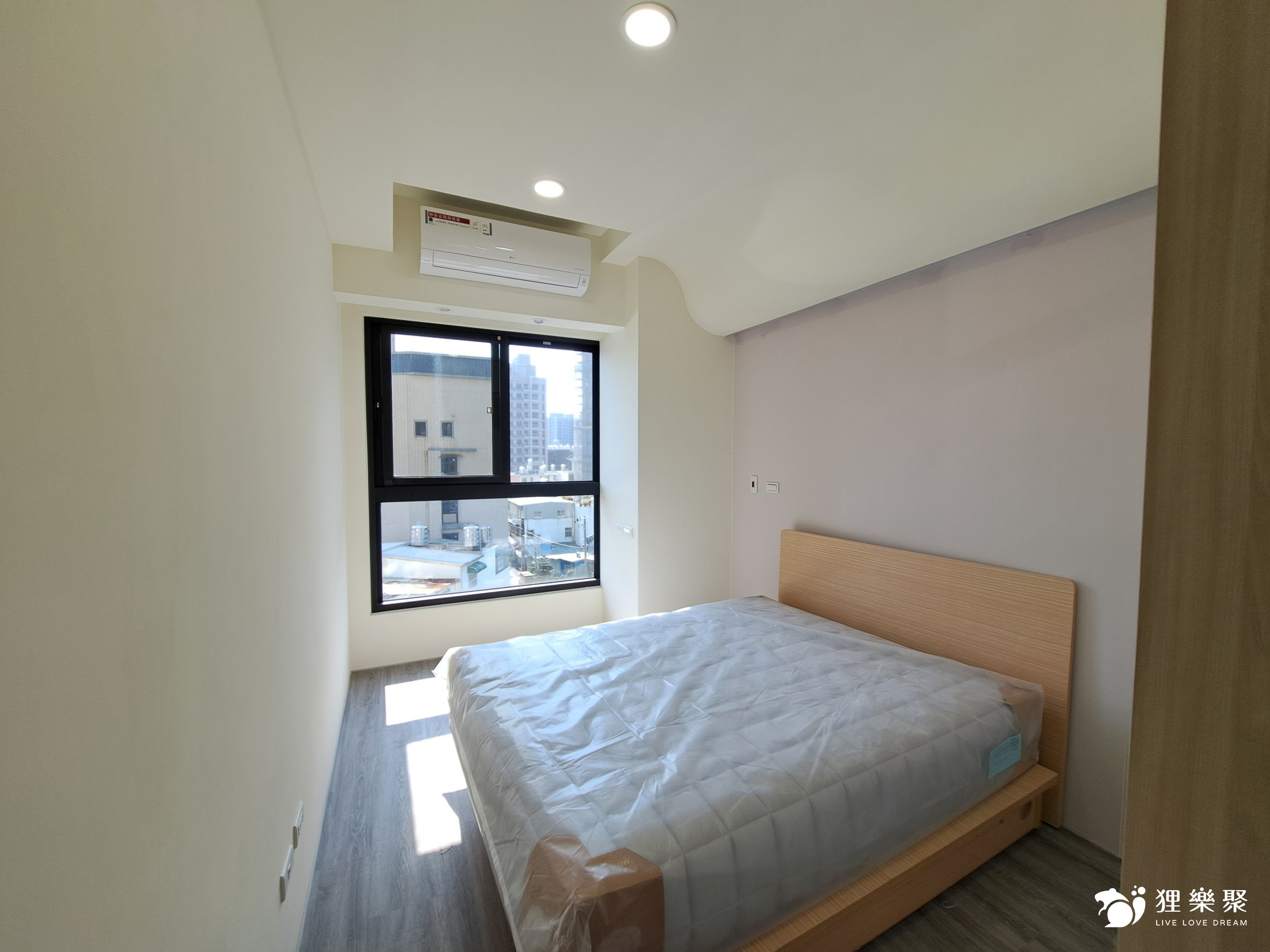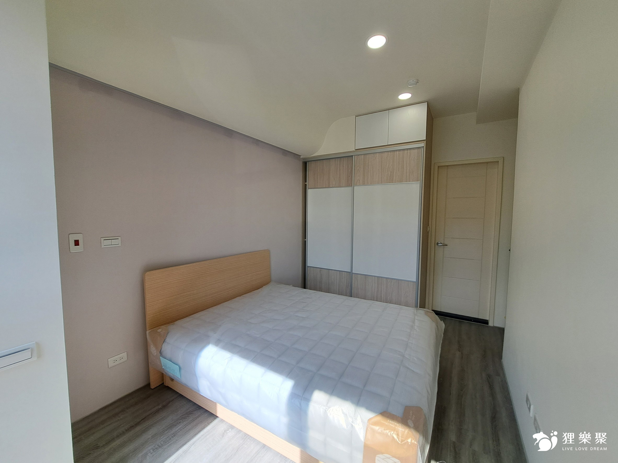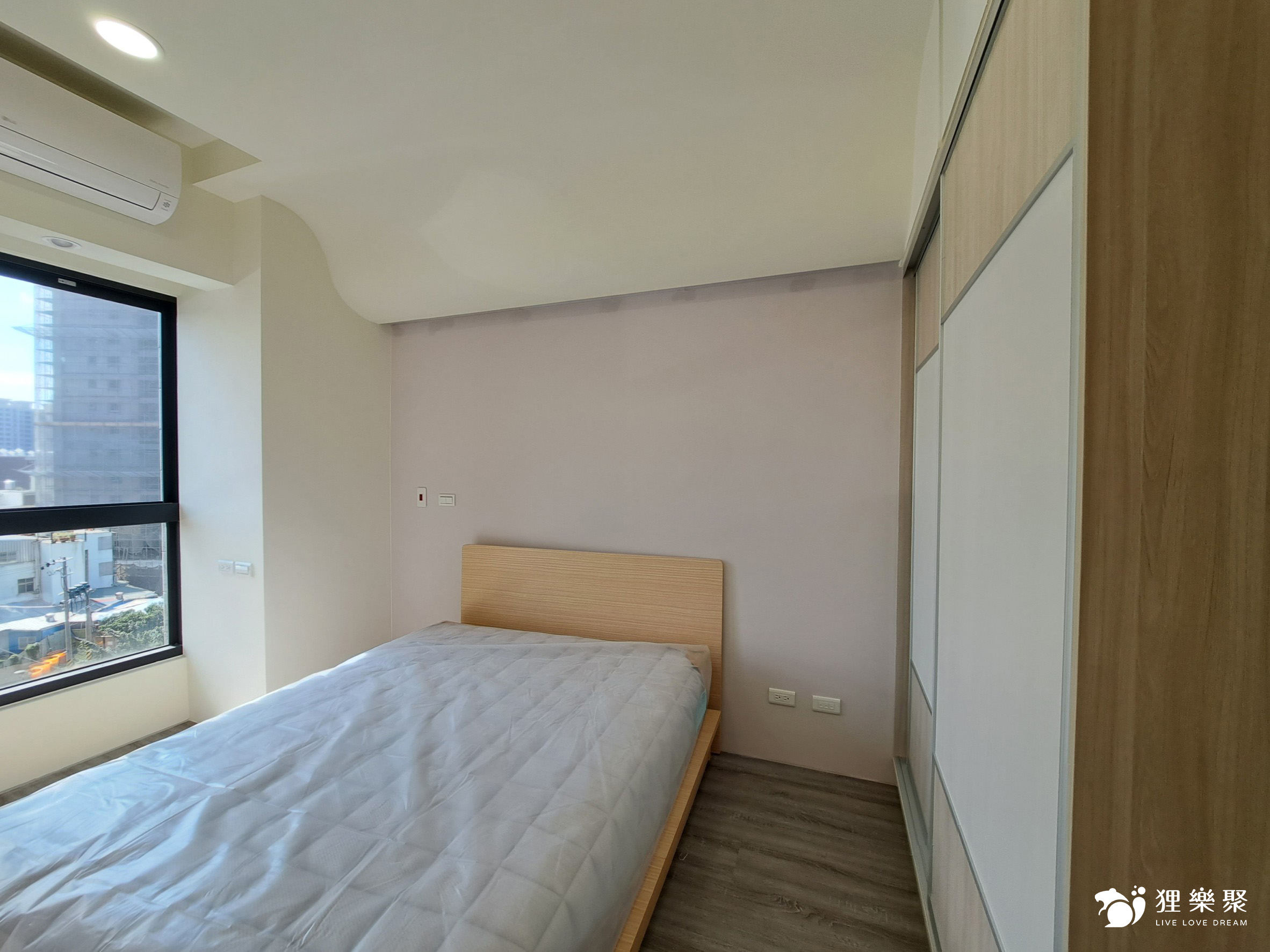 主臥床頭上方以曲面造型取代常見的弧型設計,藉此包覆床頭大樑,並加裝照明增添氛圍感。主臥除了大型的衣物收納櫃外,還搭配了木質調的家具,一方便能節省開支,也方便為不同時期需求進行更替。