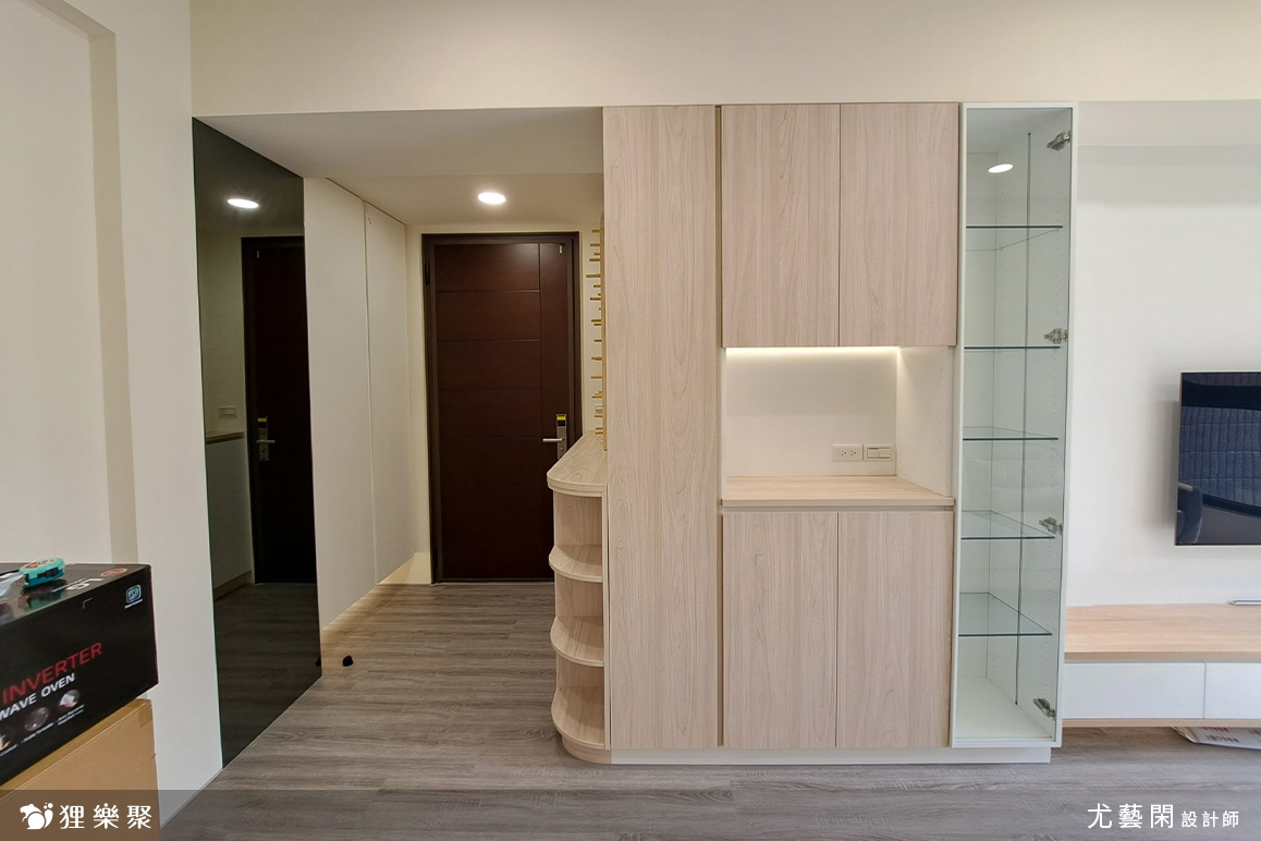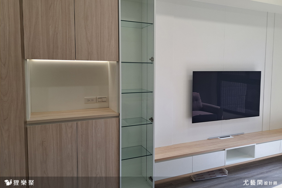 ▲ 玄關櫃連結電視牆收納櫃,並設有玻璃展示櫃