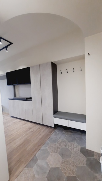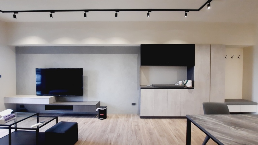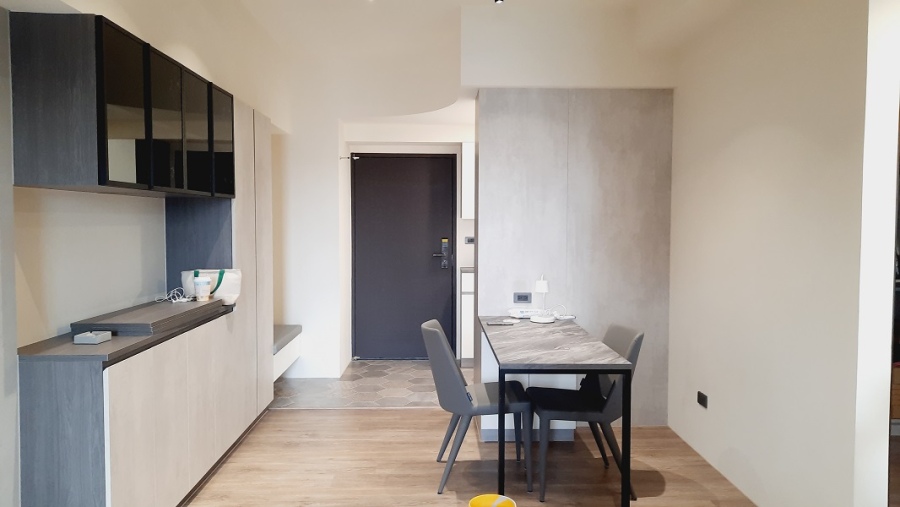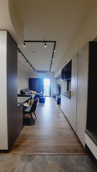 設計理念:利用櫥櫃的分隔定義各個區域,讓開放式空間在視野開闊之餘,也擁有各自獨立小空間,也因為使用系統櫃作為隔間牆使用,讓小坪數房型強化了收納性能。整體則配合屋主喜好,色系及配件上運用工業風特色,但又不過度,可適時配合家飾軟件讓整個空間可以靈活調配。
