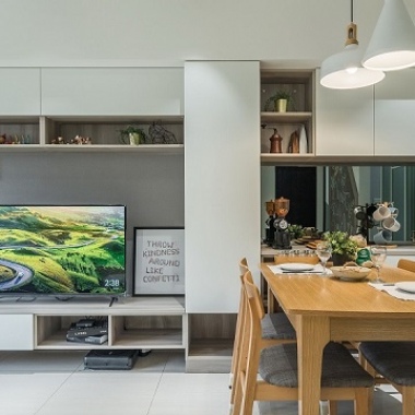 客廳以白色櫃體為主,再輔以灰棕色的線條,而主臥則直接使用大片的灰棕色做櫃子和書桌,烘托出沉穩的氣息,在白色和灰棕色搭配的風格設計之上,用嫩綠色替整個屋子做點綴,讓屋內處處充滿著生活感。