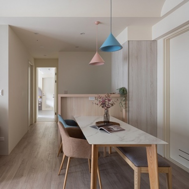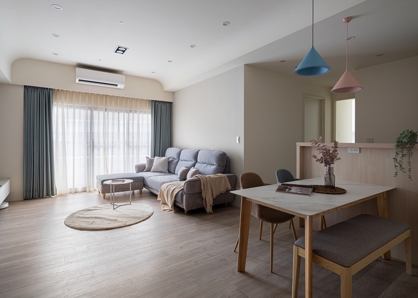 屋主偏好日系、北歐風格,希望回到家能夠充分地放鬆休息,所以設計師將公共空間以日式無印風裝潢做呈現,主臥則以簡約俐落的灰色系打造,並利用兒童房油漆跳色展現北歐風的童趣感,每個空間都有著不同的小巧思,並以全室木地板來與不同的空間調性做搭配,展現生活中的色彩美學。日式與北歐混搭