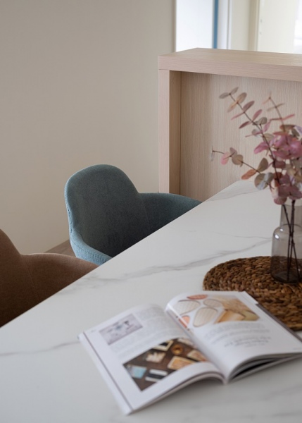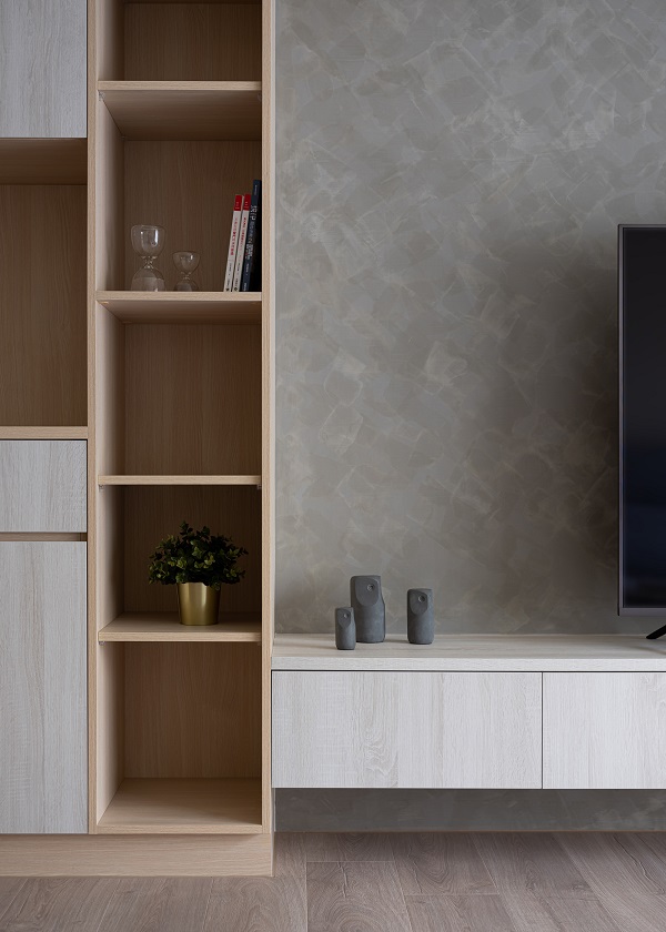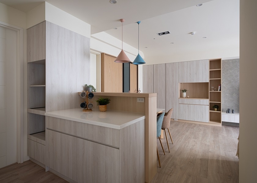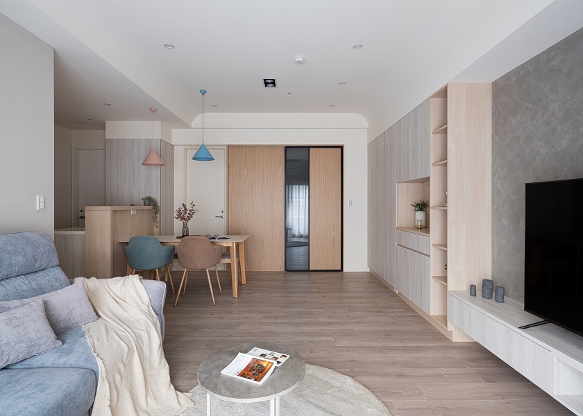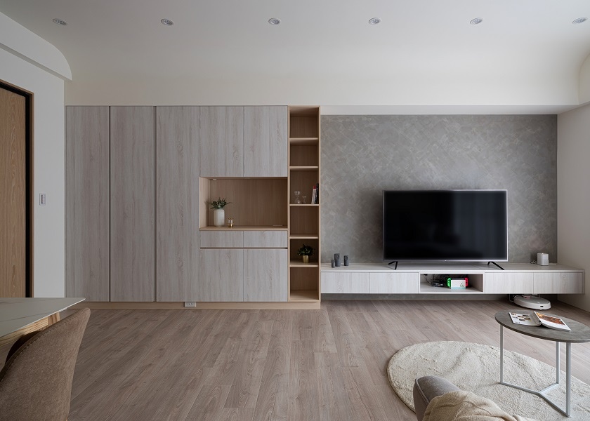 客餐廳利用不同深淺的淡色系木紋做櫃體和門片做跳色裝潢,讓空間在清爽中仍帶有趣味感,電視牆選擇仿清水模塗料,營造日式無印風裝潢沉靜自然的氛圍,並且將收納櫃集中在一處,其餘的空間保持留白,搭配上全室木地板,寬敞的視覺感受更使人放鬆。延伸閱讀:<< 無印風裝潢是什麼?3個方向打造溫暖日系居家風格 >>