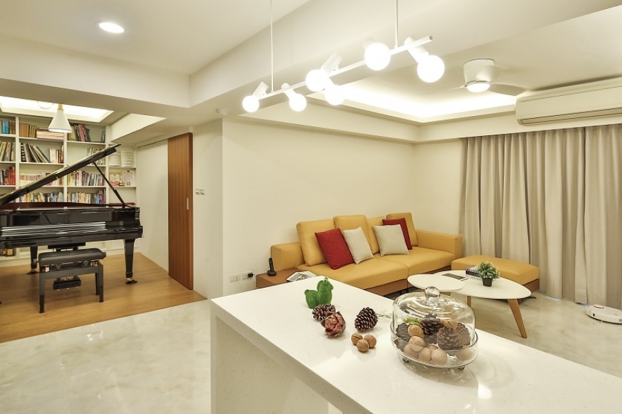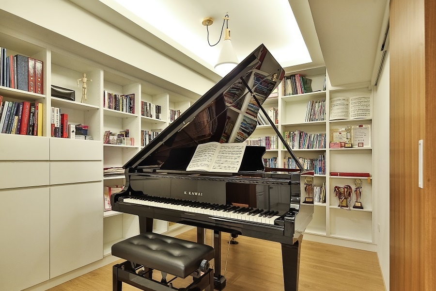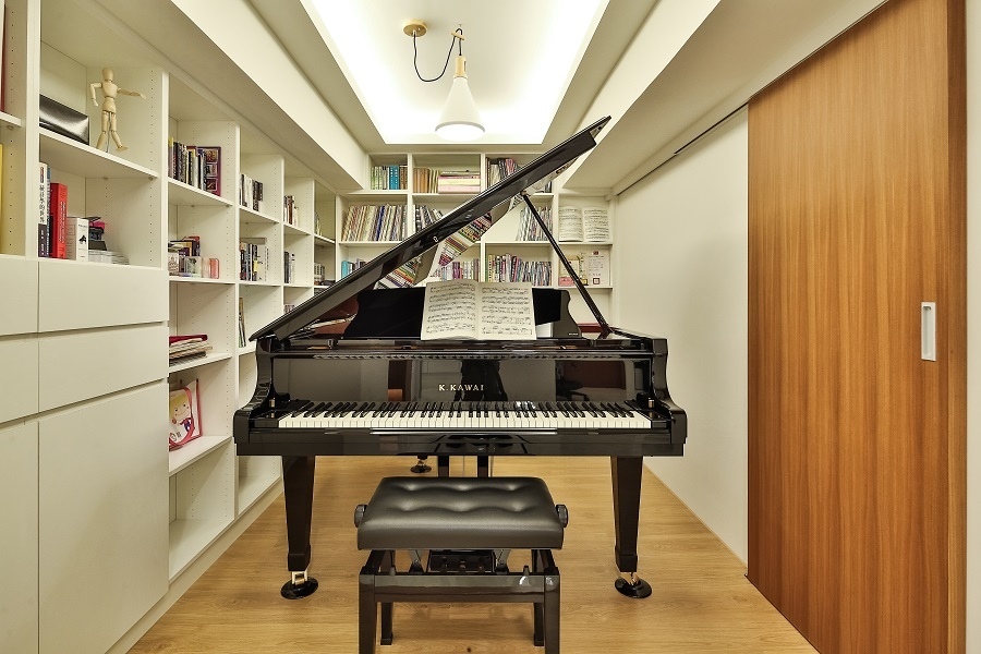 屋主非常熱愛鋼琴,因此這次的案場著重在琴房的規劃,同時也是整間屋子的亮點。在風格上選擇明亮有型的現代風,公共區域鋪設大理石地板,其餘櫃子、房門等則選用白色和木紋等元素打造,再加上精心規劃的燈光配置,能夠營造出俐落大方、簡約時尚的居家風格。城市琴房