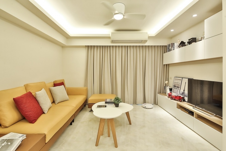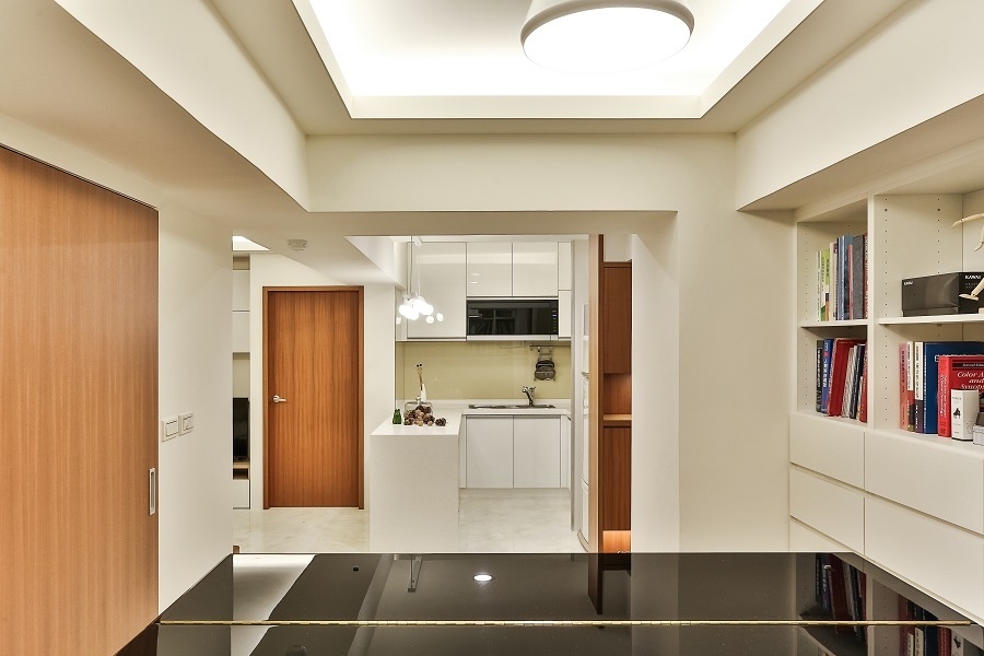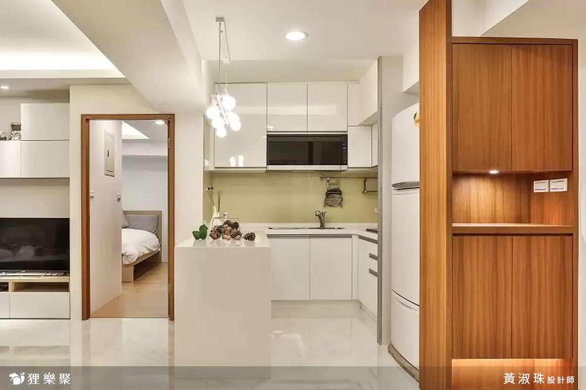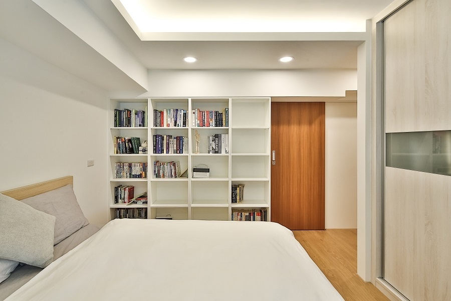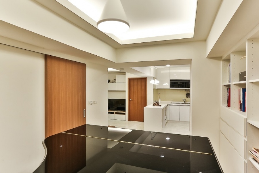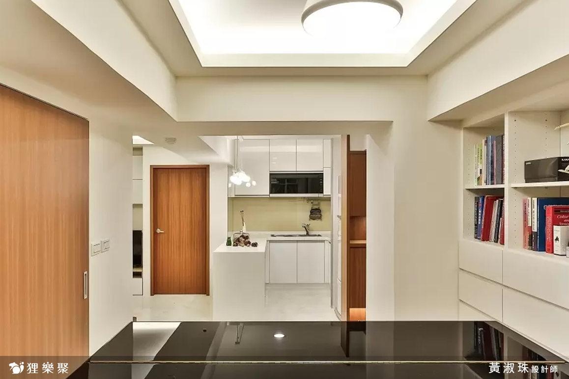 現代風的重要特點之一即是配色單一,顏色如果一多,除了在視覺上會變得繁雜,空間感也會變得比較小。全室以白色為主體,從客廳的電視牆、廚房的櫥櫃和中島、琴房的書櫃及展示櫃、一直到臥房內的書櫃和書桌都選擇單一的白色,營造出簡約大方的空間感受;只有在部分區域如玄關櫃、琴房地板、房門、衣櫃門等地方以木紋點綴,同時有區隔空間的作用。