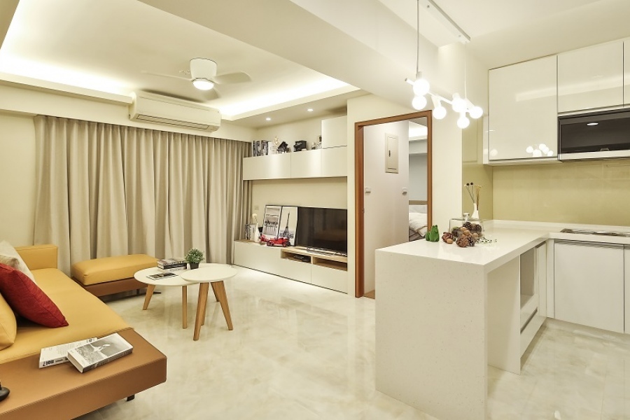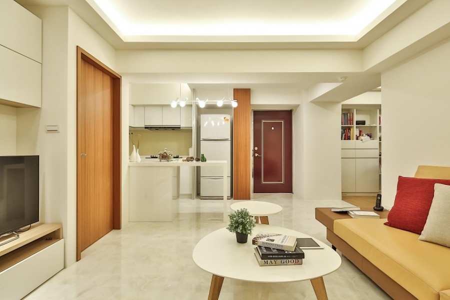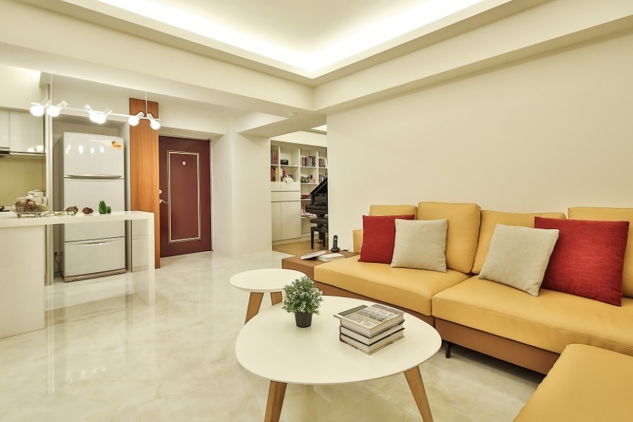 從玄關、廚房到客廳的公共區域皆鋪設大理石地板,由於大理石地板經過打磨後非常光滑,具有亮麗的光澤,本身也極具大氣的質感,能夠為現代風格增添一抹明亮的氣息。燈光的配置不僅僅是照明,同時也是影響室內風格的一大重點,從照明方式、燈具的造型、燈泡的瓦數或色溫等等,都是需要仔細考慮的部分,而現代風明亮的空間則以柔和的間接照明配合造型主燈營造而成。