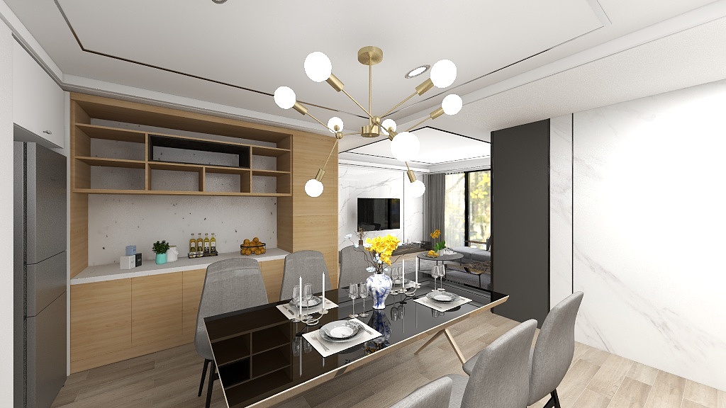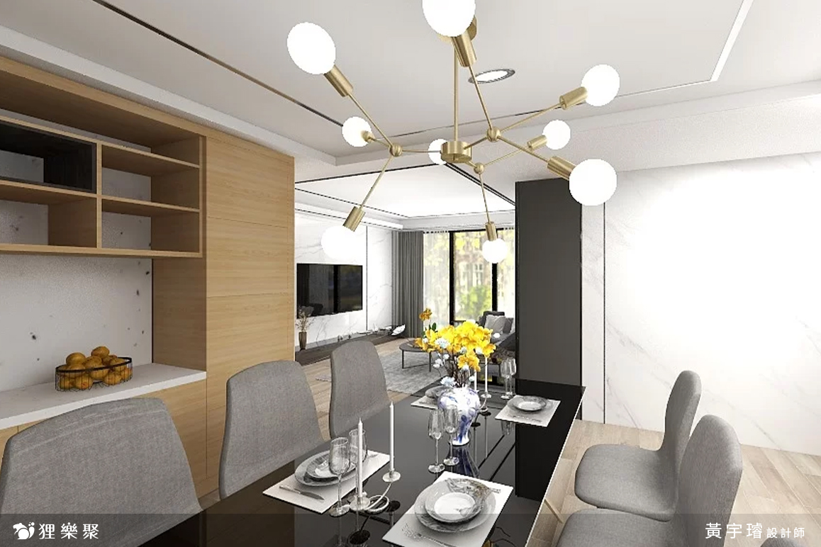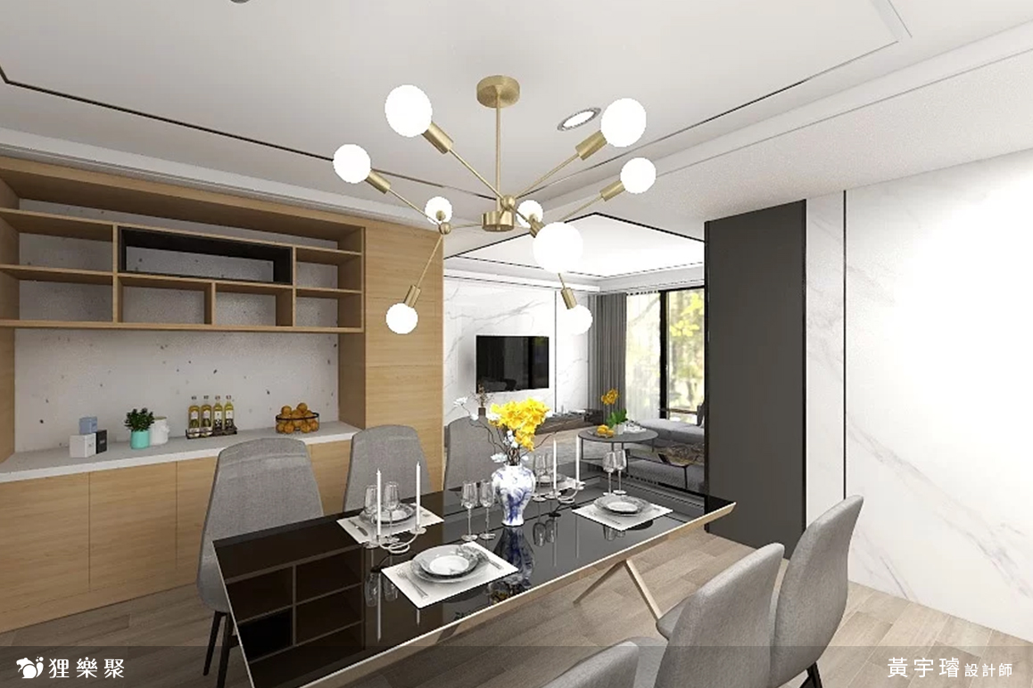 現代輕奢風是在經典的現代風格中,再加入一些精緻的輕奢風建材、家具或擺飾來點綴,營造一種低調奢華的氛圍;設計師在天花板設計間接照明,並利用黑色的線條來突顯層次感,壁面的部份規劃石材牆面,建材的部分可以根據業主的需求選擇大理石或大板磚,或是現在系統板、美耐板也有許多仿石材的紋路可以選擇,最後鋪上木地板以避免居家空間過於冰冷;輕奢風配色多以黑白灰搭配金色來展現微微的華麗感,天地壁大致完成後,設計師加入石材類或亮面、鏡面材質的家具,在餐廳裝上一盞精緻又不失大氣的吊燈,整體相當簡約卻又不失細節。延伸閱讀:<< 哪種裝潢風格適合我家?這樣挑準沒錯! >>