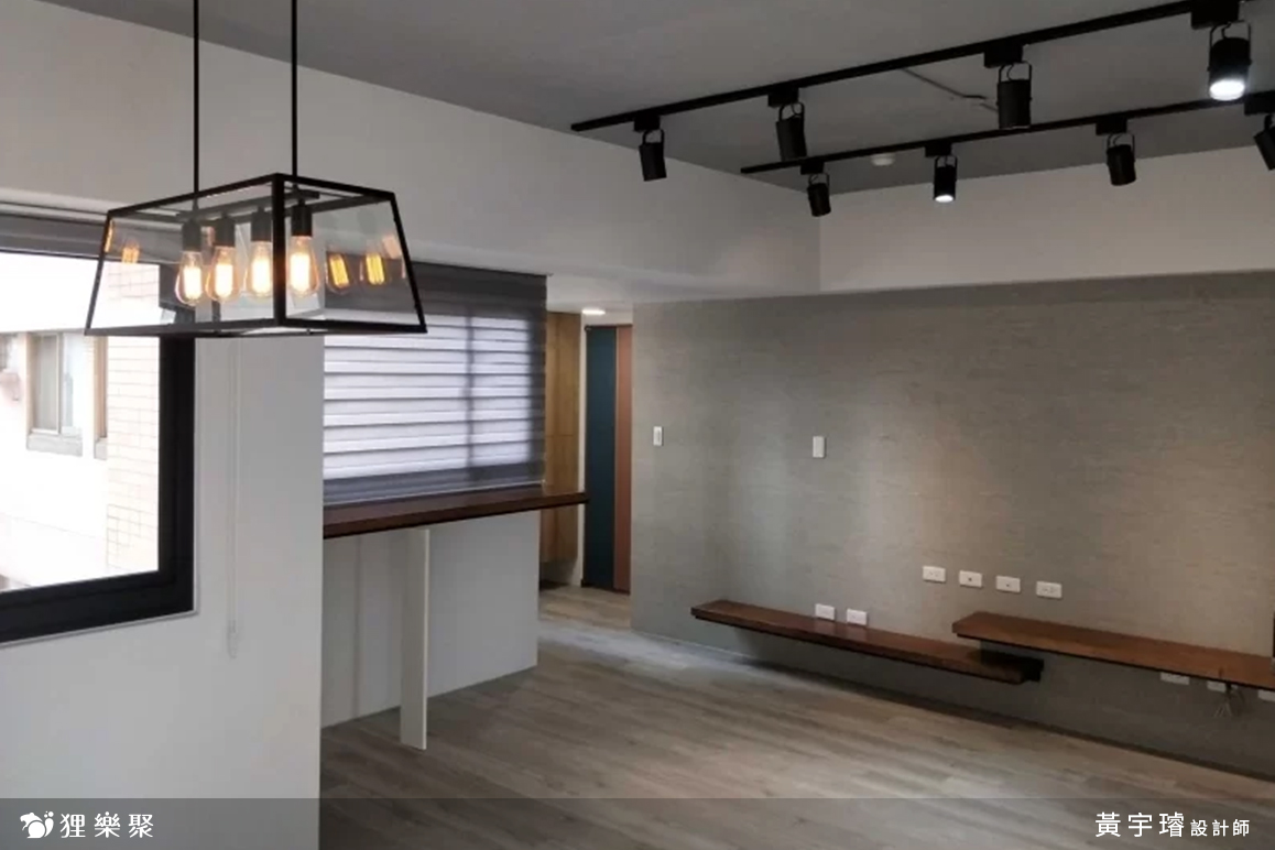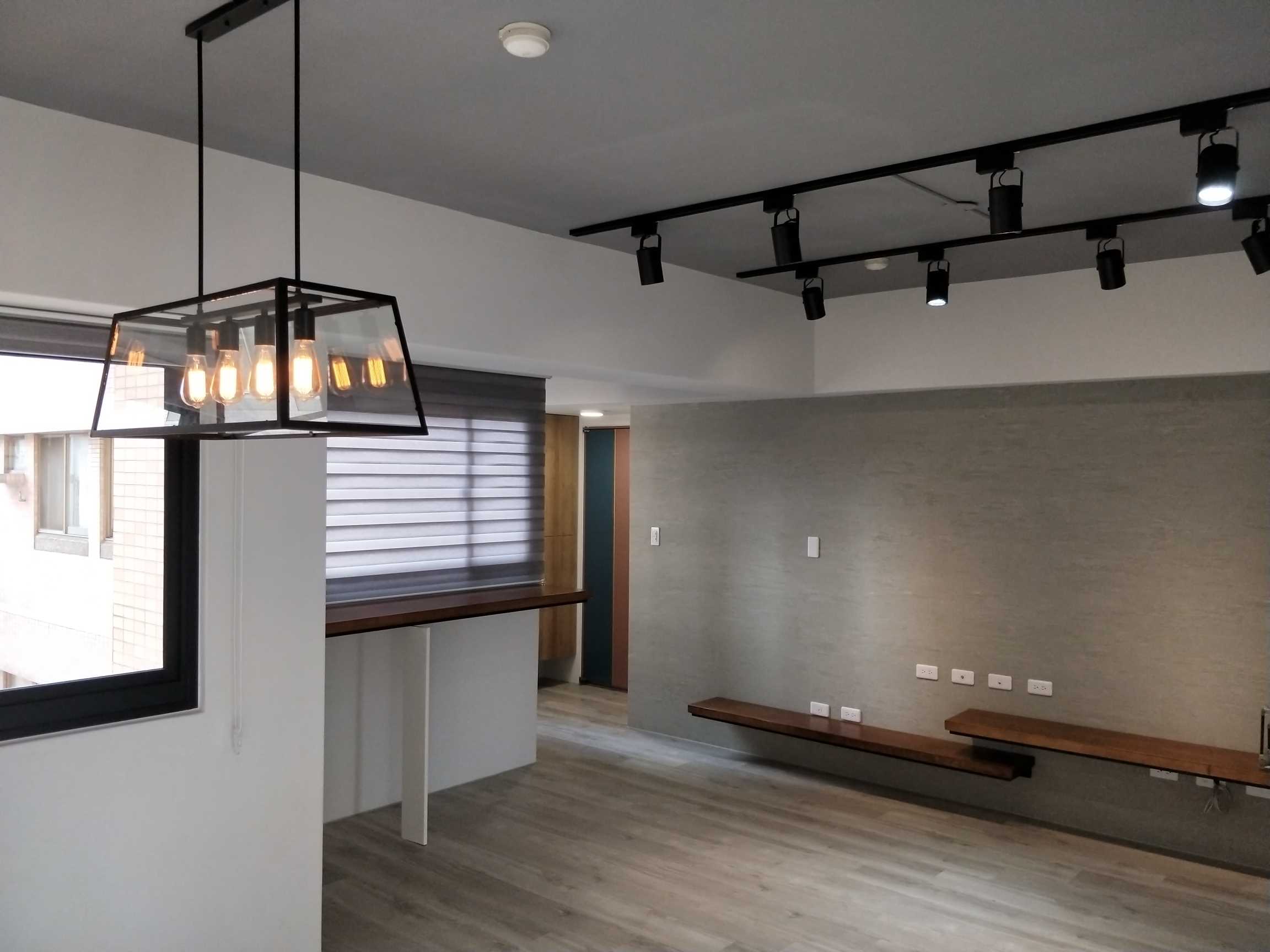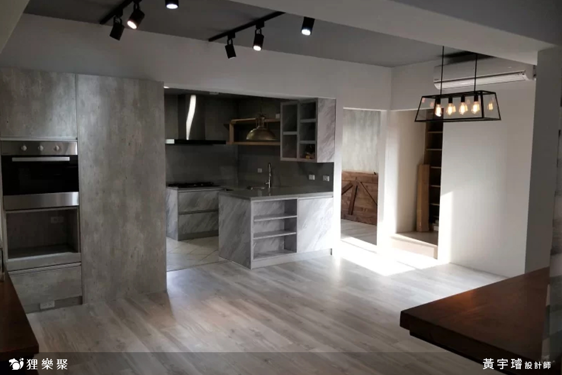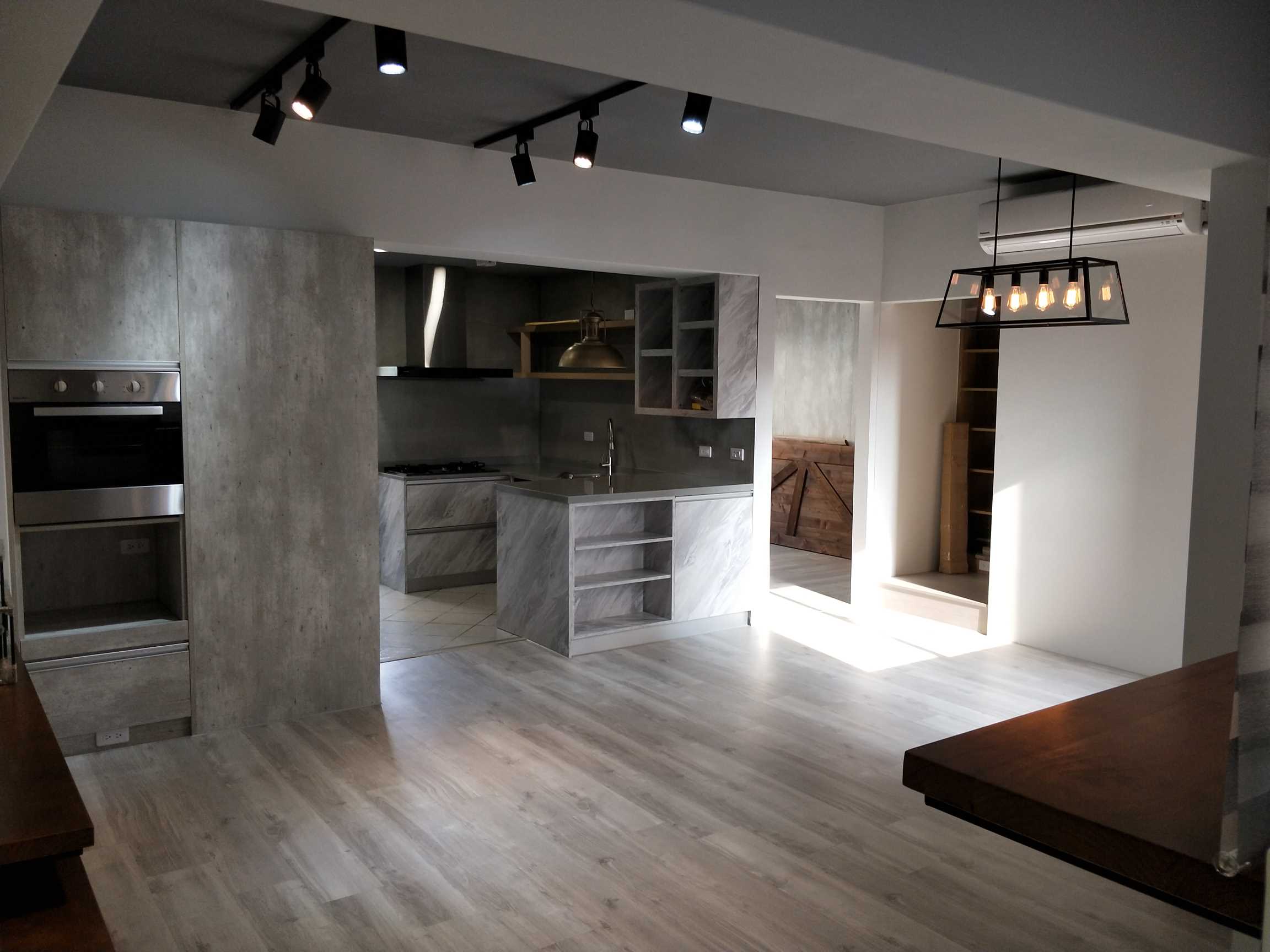這個輕工業風裝潢以灰色調佈局,從天花牆面到地板大量運用水泥元素,由於老屋的天花板高度通常較低,天花板漆上灰色後燈具直接走明線的軌道燈,餐桌位置則選擇了復古造型的吊燈,讓餐廳空間有凝聚的效果,加上吊燈所散發出的昏黃的燈光,有種寧靜的溫馨感,櫃體的部分選擇帶水泥感的表面材和刷舊的木材做穀倉門,待入住後搬進家具,就是一個復古味十足的個性公寓啦!延伸閱讀:<< 工業風裝修重點在哪?6大要素帶你掌握灑脫不羈的酷 >>
