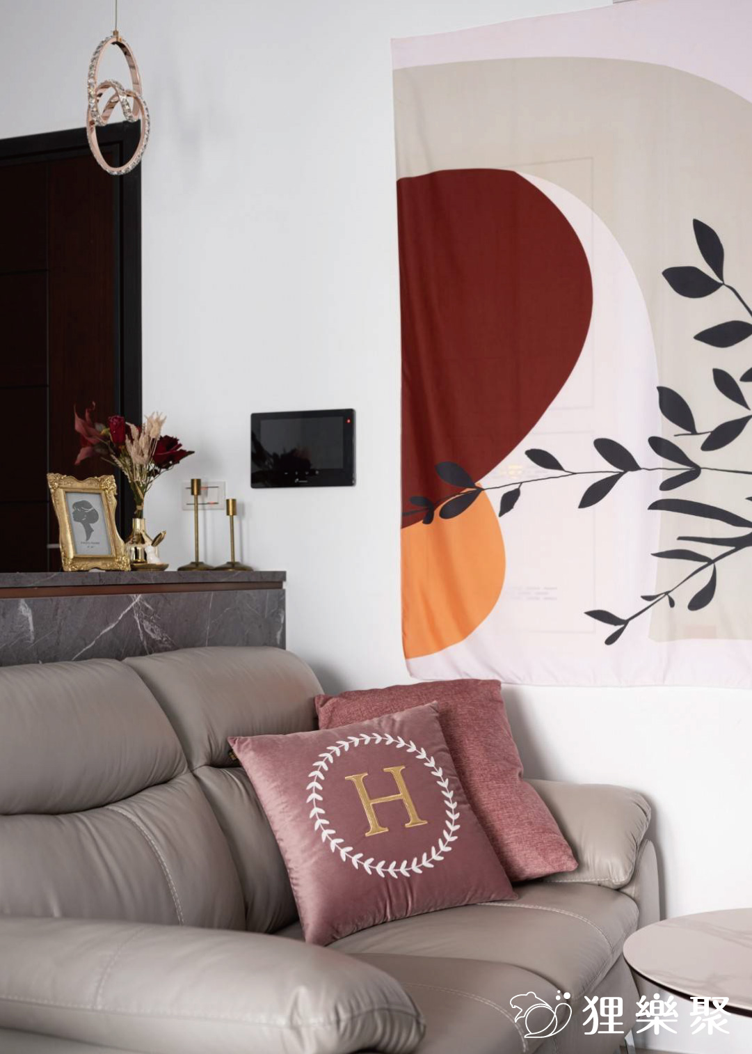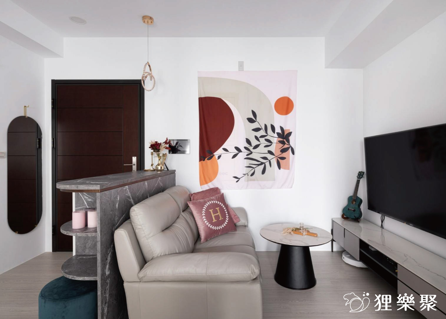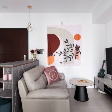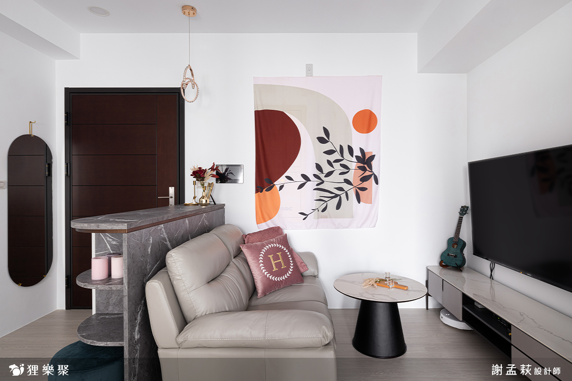 這個僅9坪的小宅室內裝修可以說是空間雖小、五臟俱全,並且意外地不會感到小坪數設計帶來的壓迫感,設計師透過適當的收納規劃,並將較冰冷的黑白灰和石材等元素融合溫暖的灰粉色調,打造出獨一無二的無印簡約風小窩。粉調生活