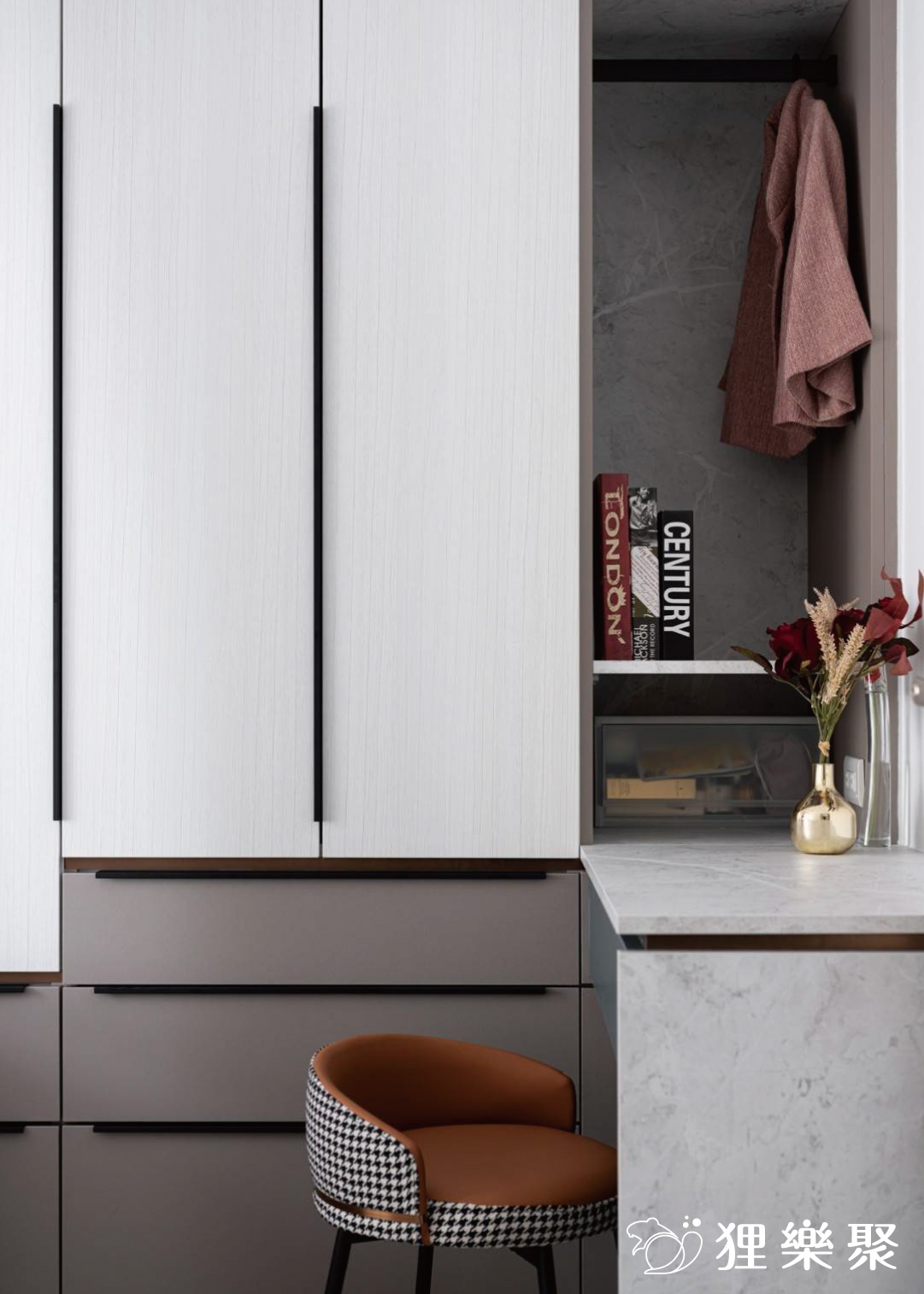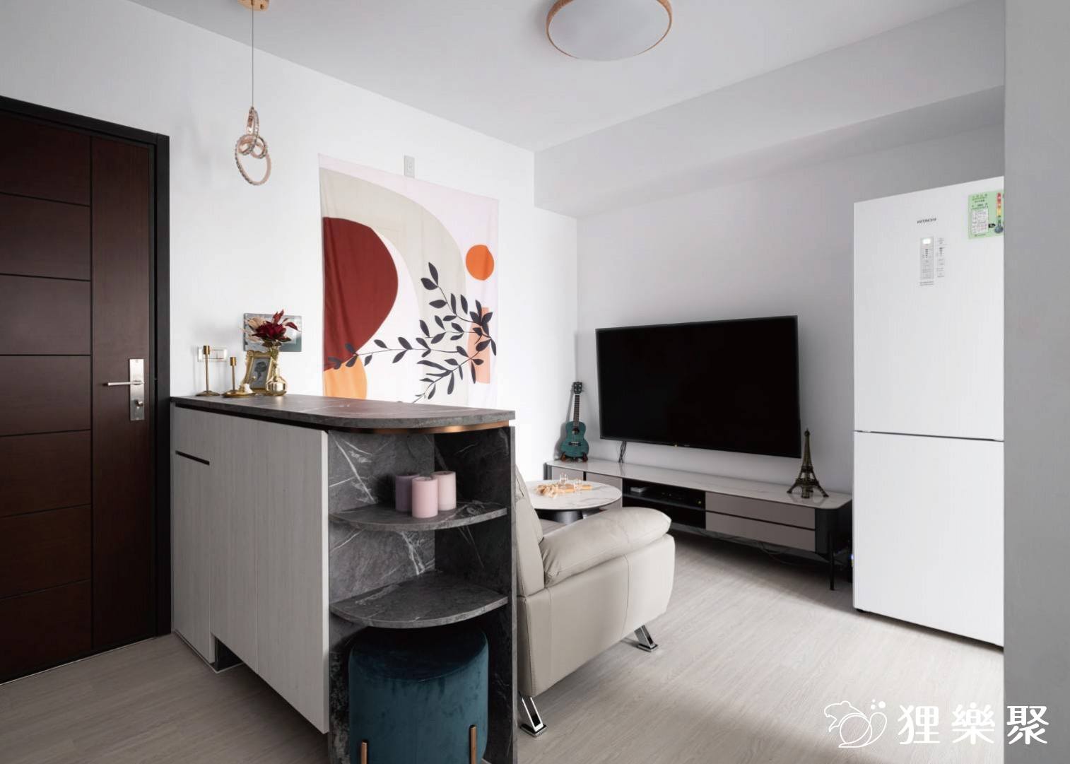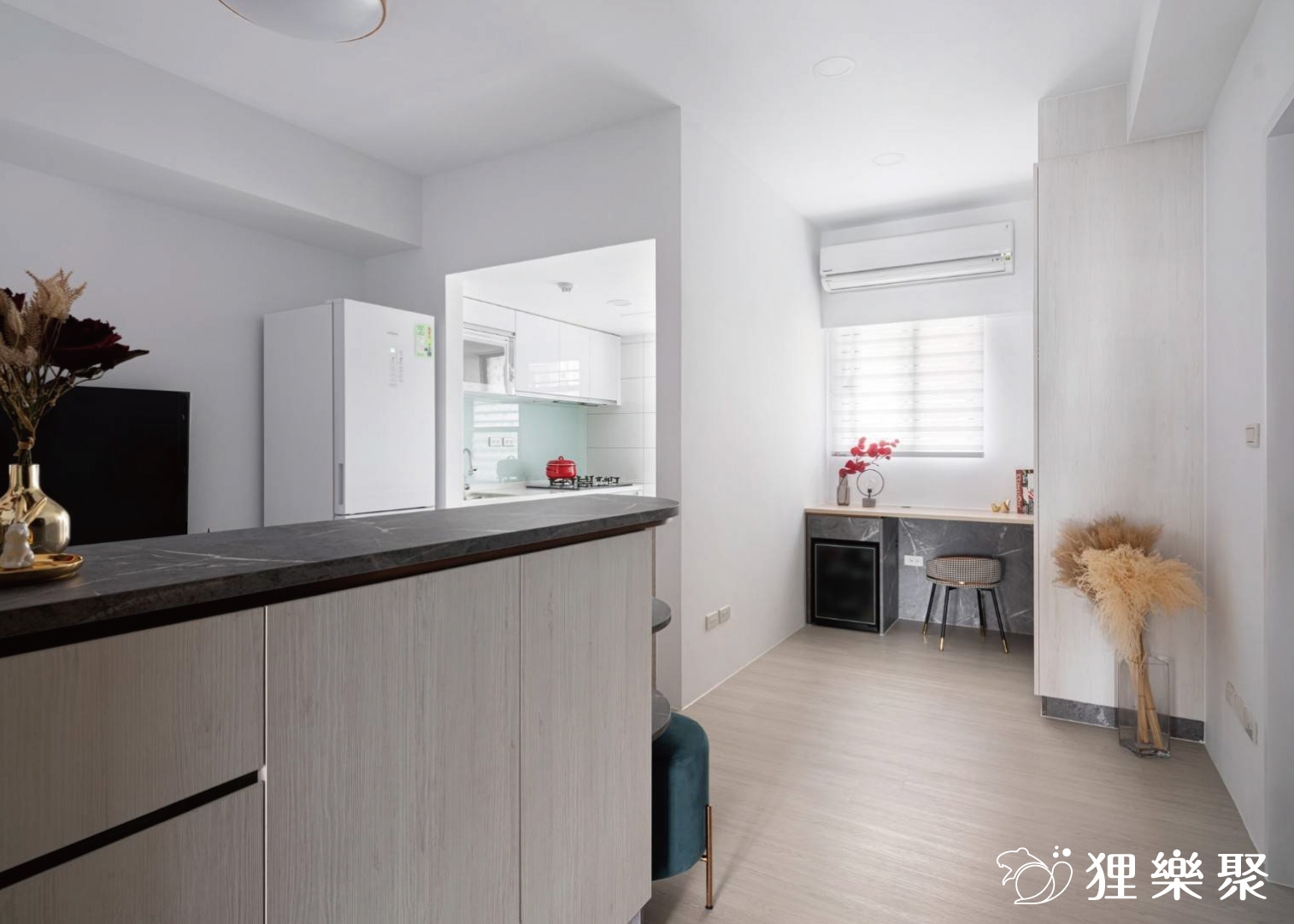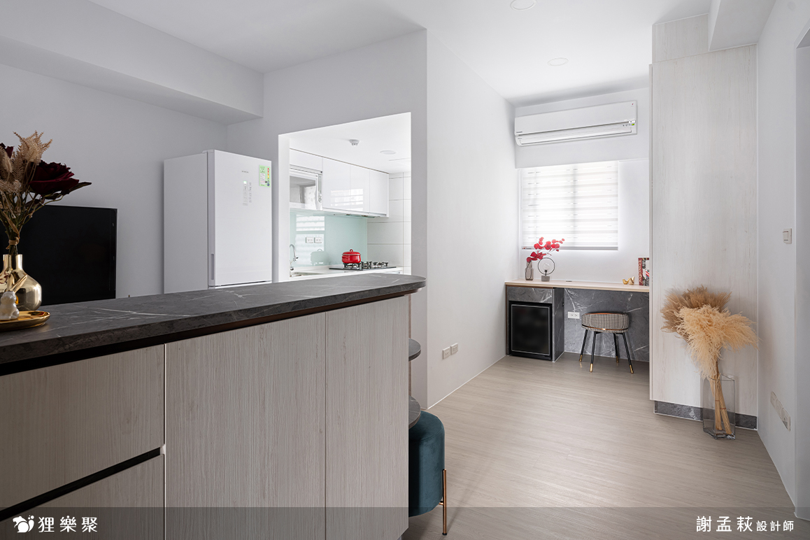 空間中大量使用白色木紋和石紋的系統板,並局部搭配棕色調和灰色調的木紋色,讓這個小窩俐落中卻又不失溫暖,把手的部分以隱藏式把手和鐵件把手為主,天花板設計也選擇平釘,整個空間看起來淡雅又簡約。延伸閱讀:<< 裝潢設計費用又爆了?學會預算分配變身成裝修精算師 >>