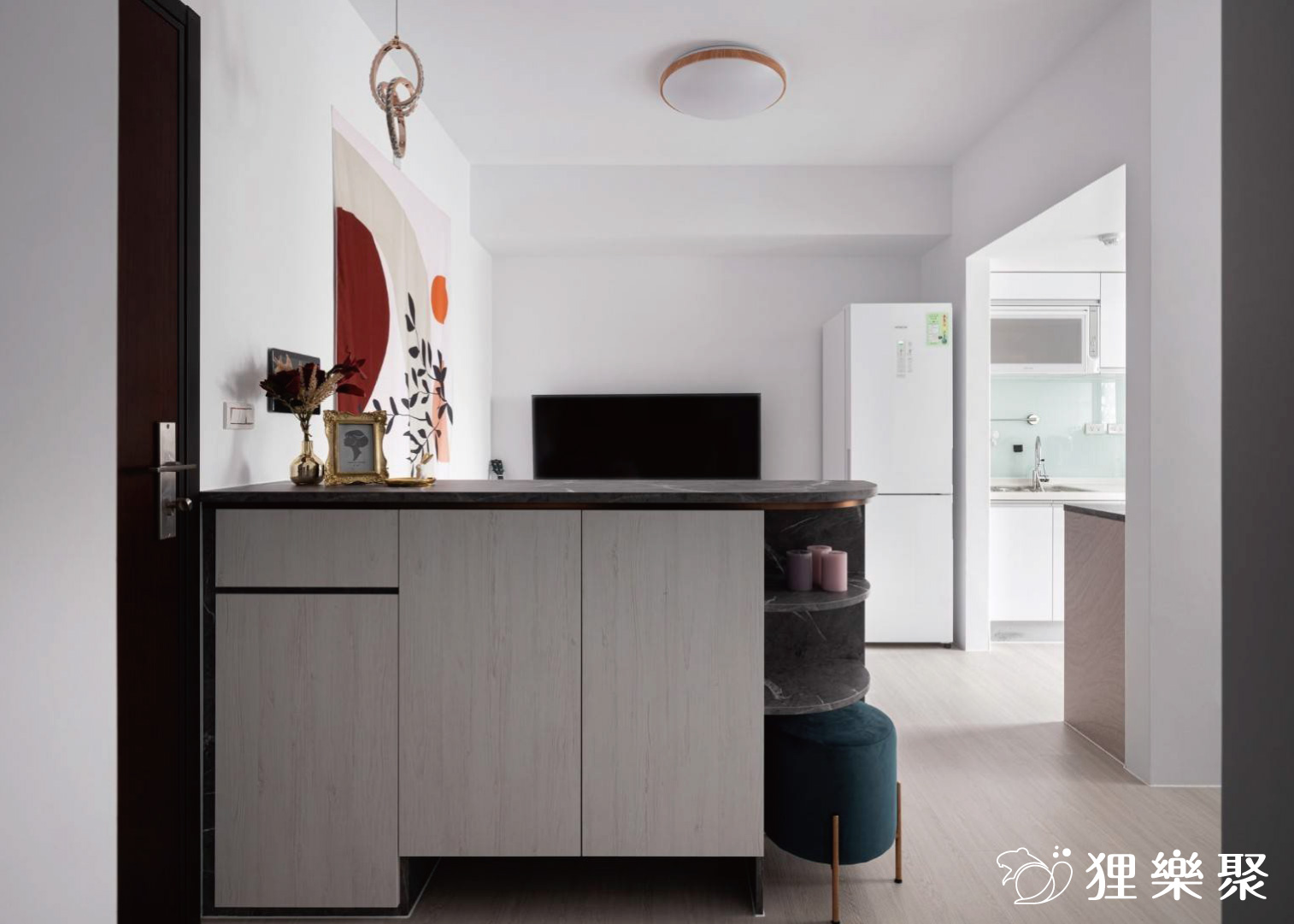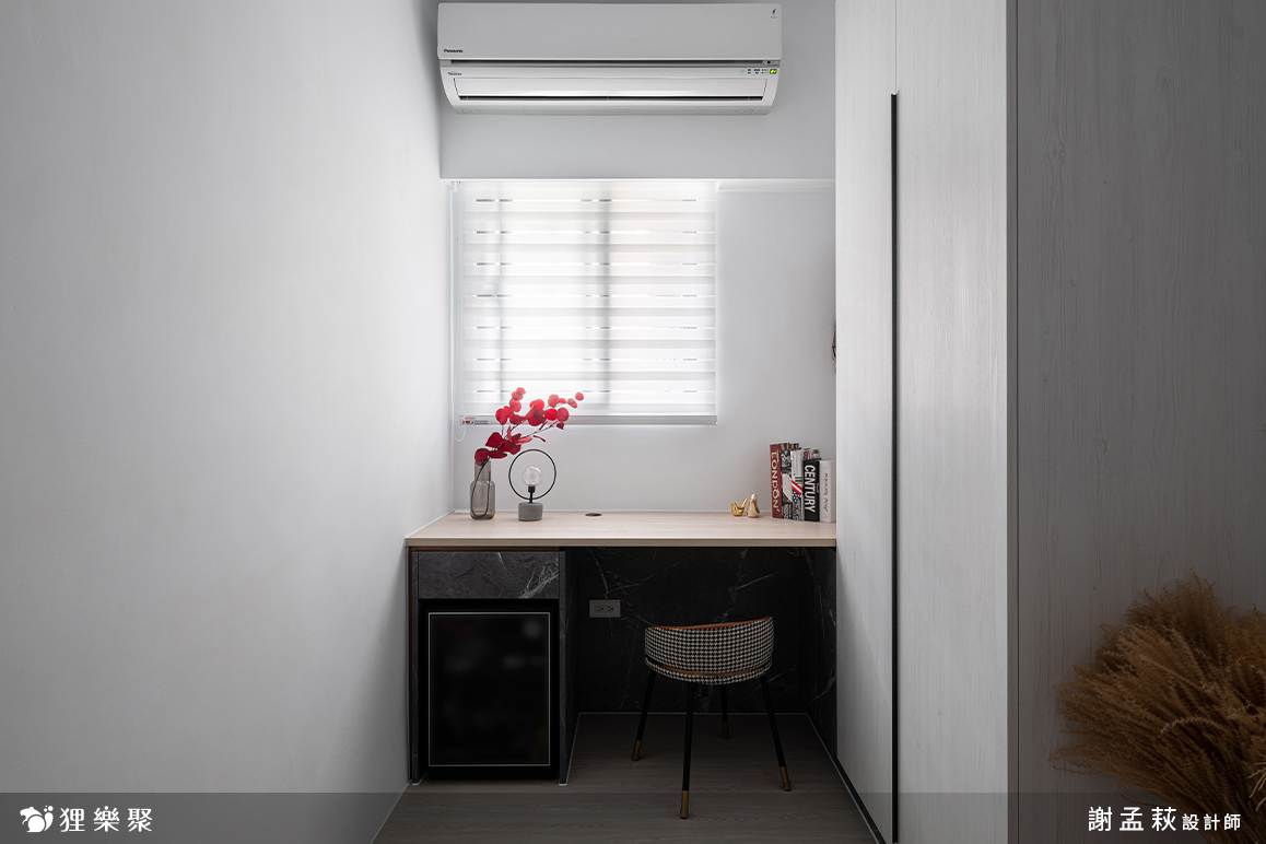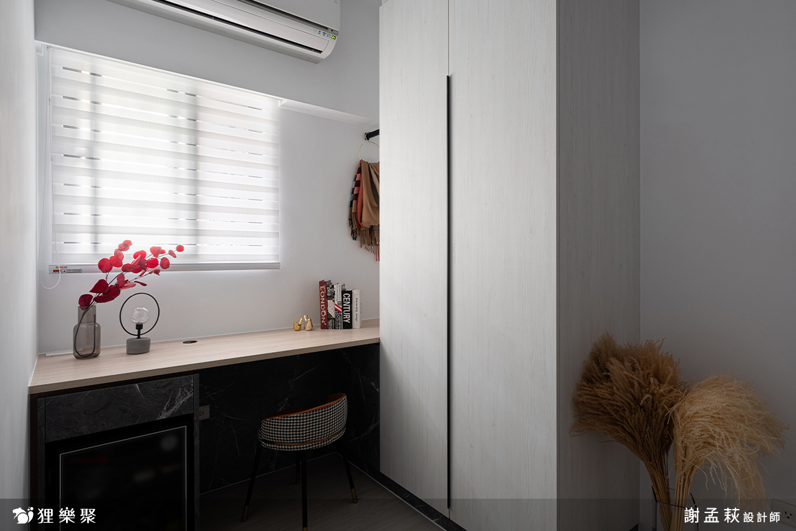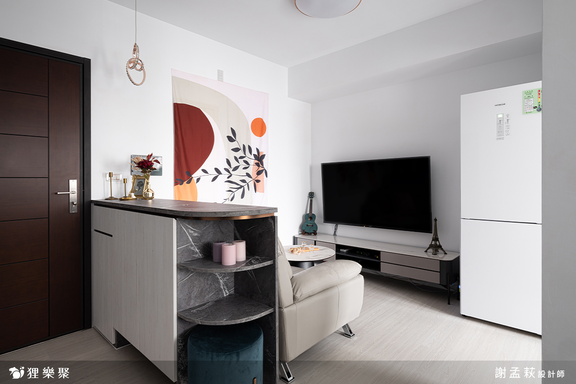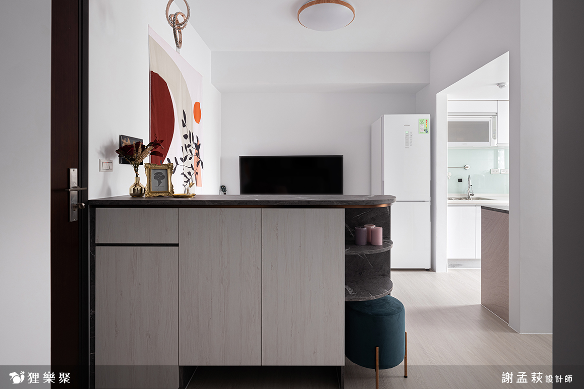 除此之外,如果收納條件許可,也可以局部規劃矮櫃就好(如案例中的玄關櫃),高櫃在小坪數中會更加放大,空間感受會變得擁擠、壓迫,矮櫃可以讓視線重心下沉,也是一個小坪數裝潢技巧。
