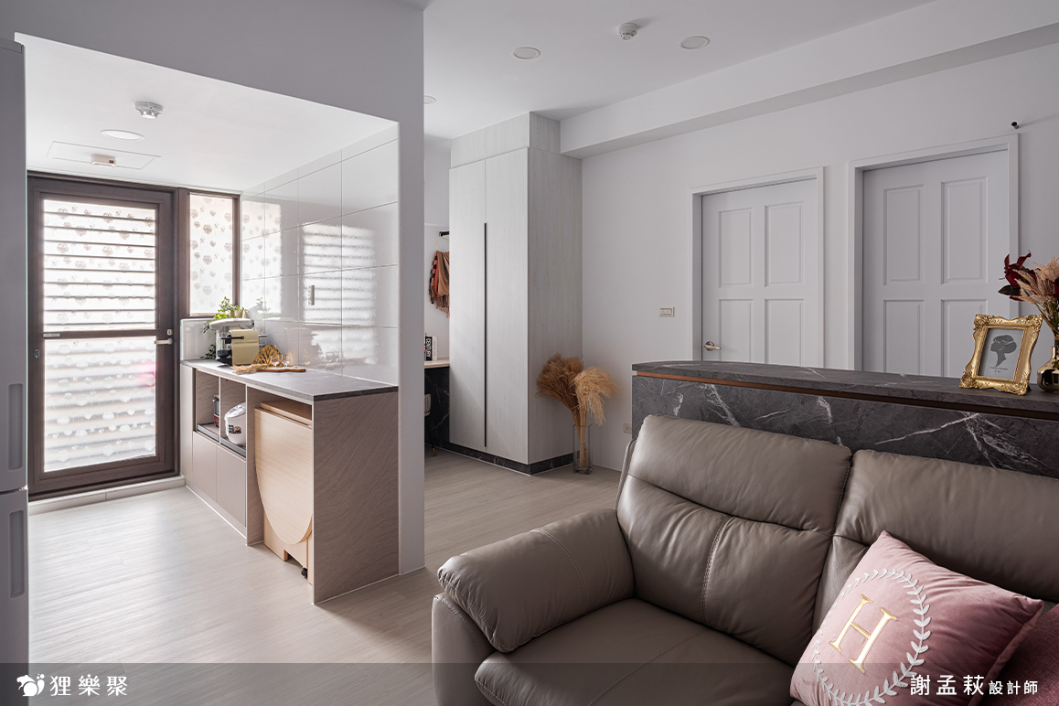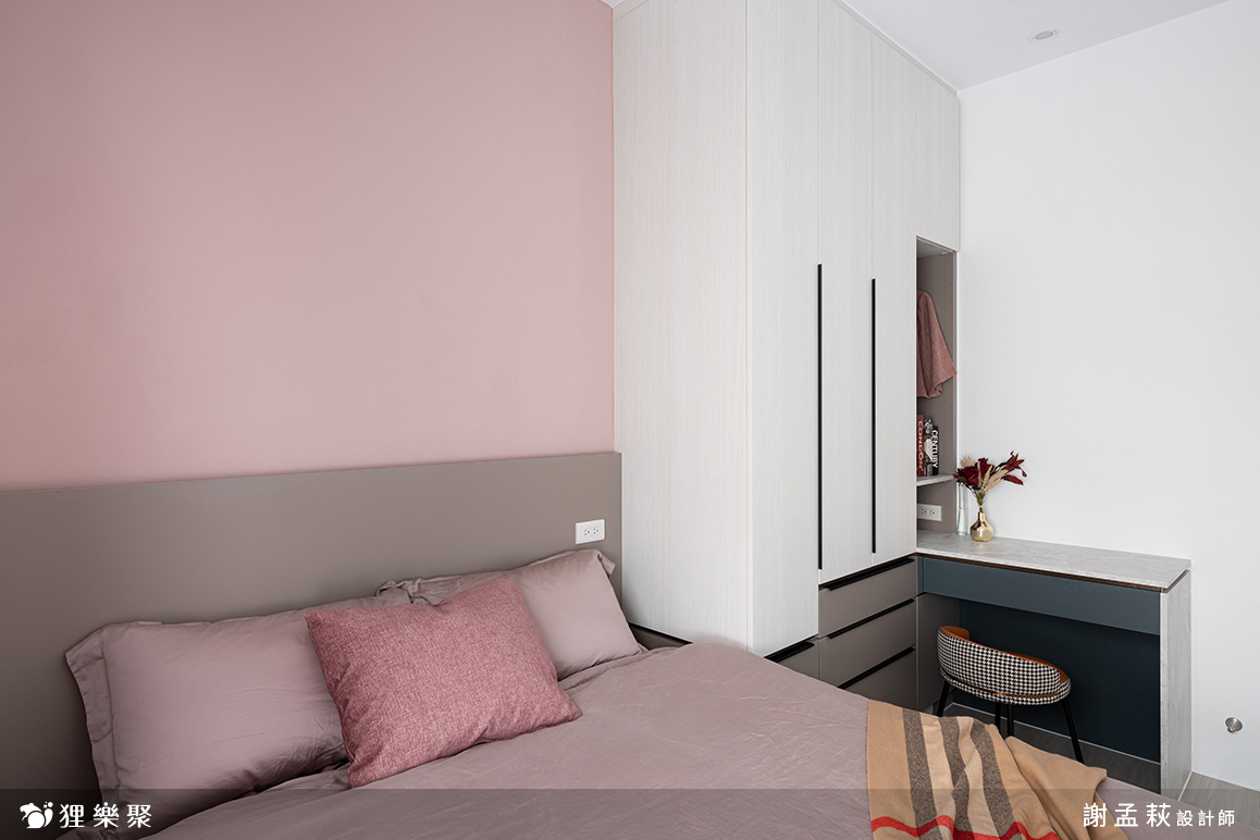 小坪數裝潢技巧中,有許多人會想到要使用可摺疊的餐桌,現代人平常大多在客廳吃飯,有親友來訪的時候再把折疊餐桌架起來即可,而案例中則是讓屋主在煮飯時可以保持最大化的走道寬度,避免忙碌起來容易撞到。屋主非常喜歡這種帶有灰調的粉色,除了主臥室床頭漆上跳色油漆外,在其他軟裝的部分如抱枕、枕頭、窗簾等等都挑選了同樣的色調,內外呼應,是一個巧思滿滿的小坪數設計宅。