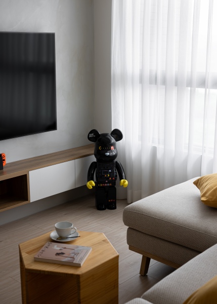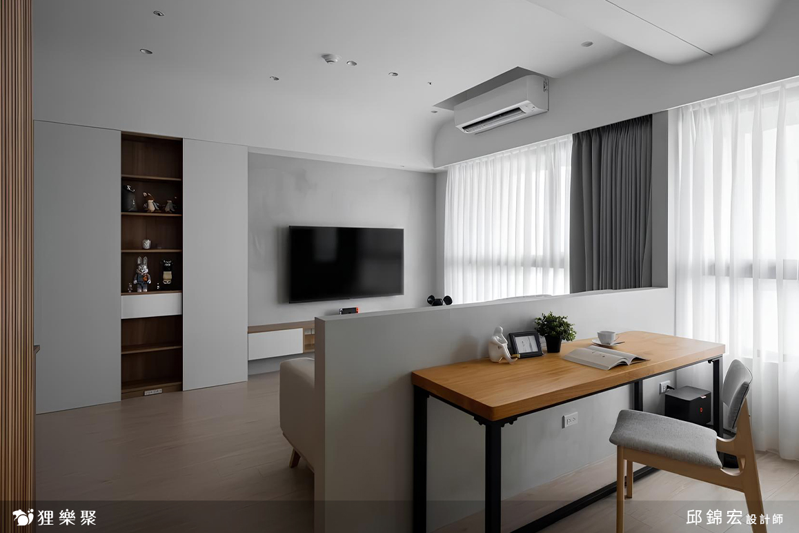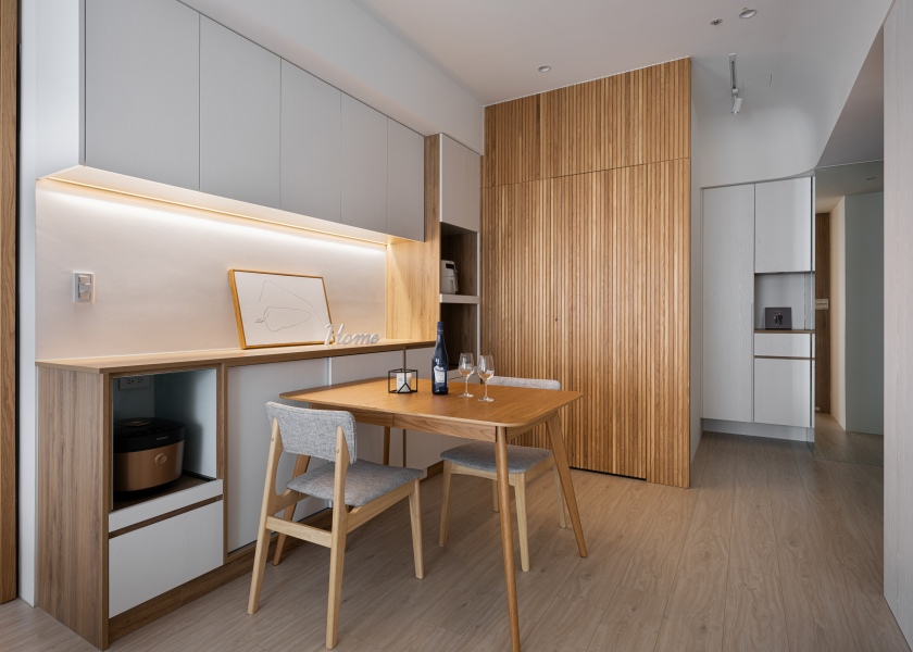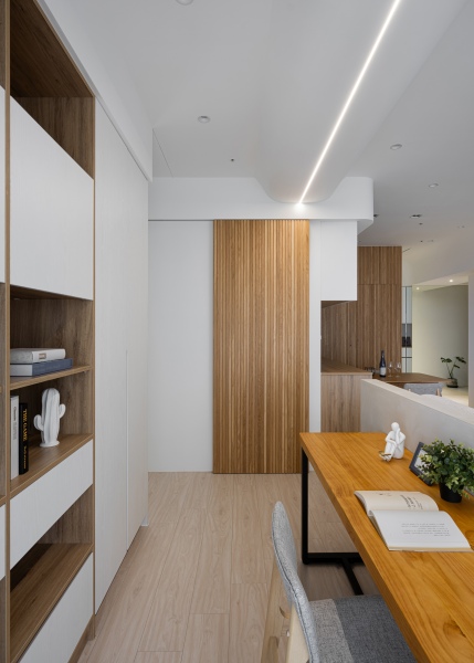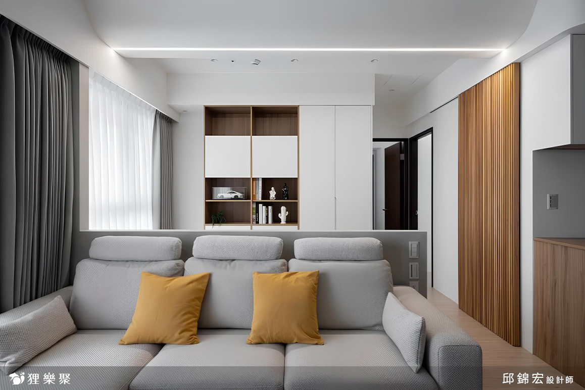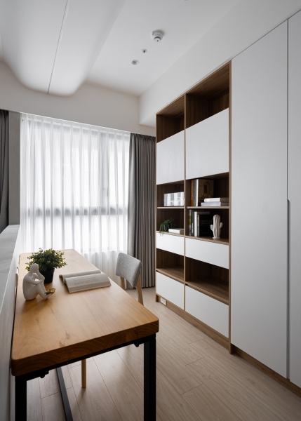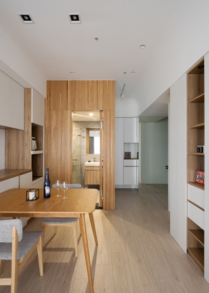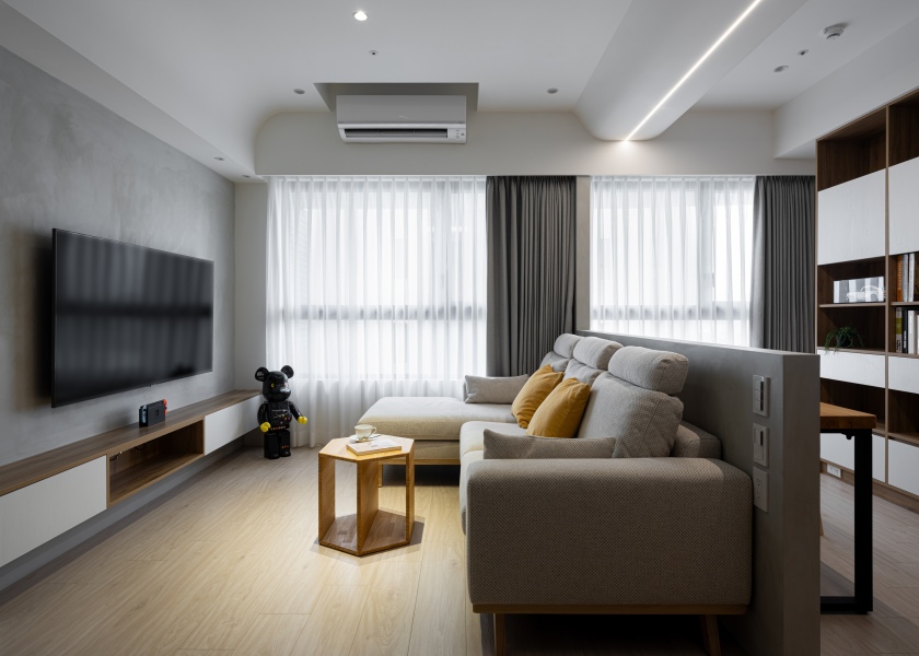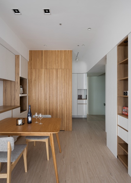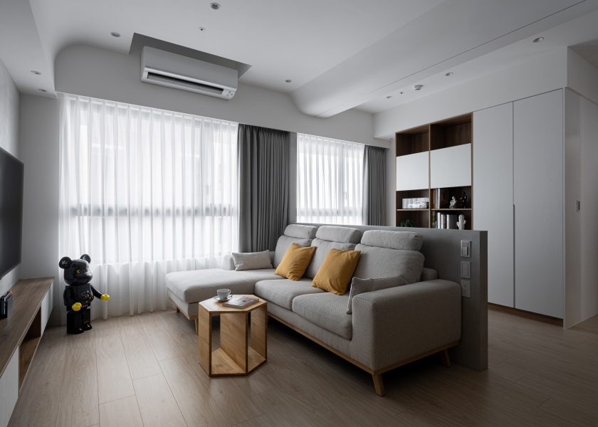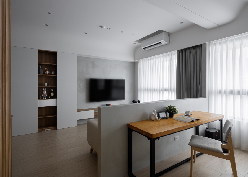 屋主偶爾會在家工作,閒暇之餘也喜歡放鬆小酌,期望能有動線順暢且開闊的公領域空間,設計師透過沙發後方的半高牆,圍塑出開放式的書房,滿足辦公、閱讀需求,同時放大整體視覺感受,輔以木質、白色與灰色特殊塗料紋理,構築出氛圍清新且高機能的21坪小宅。高機能的日系無印家居