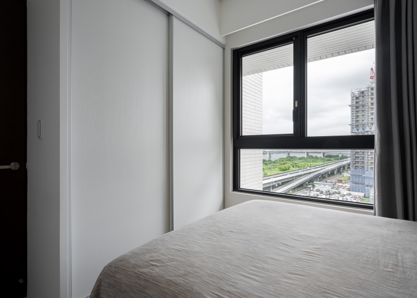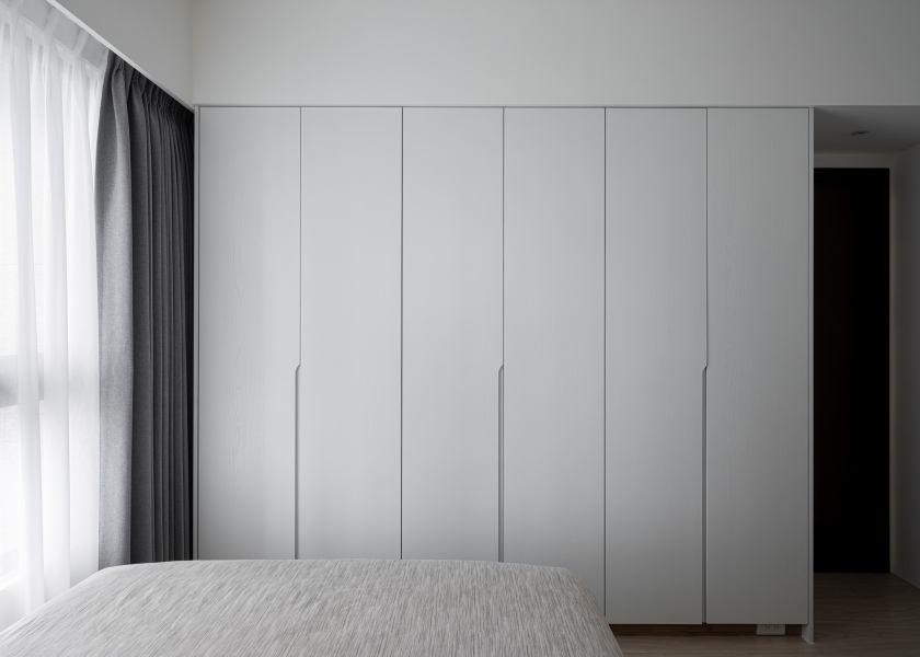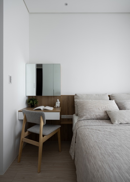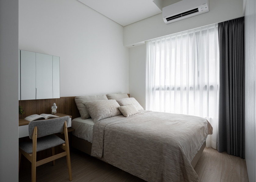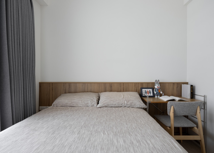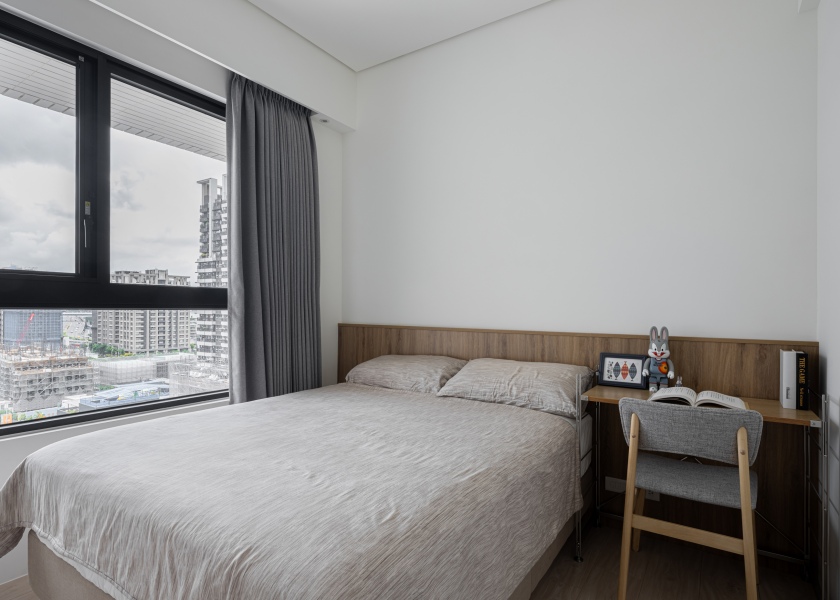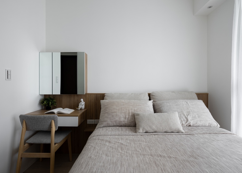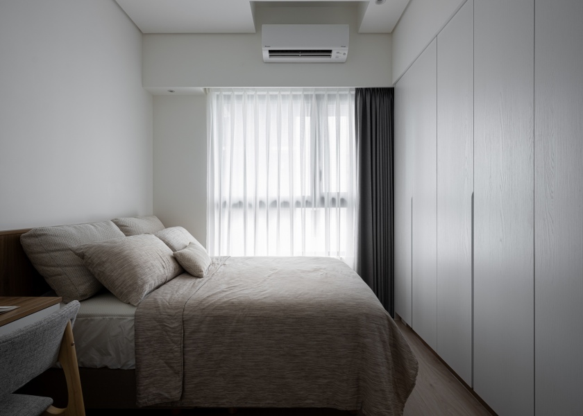 主臥與次臥室皆以白色為基調,結合木質床頭板,創造無壓的舒眠環境,讓屋主結束忙碌的一天後能在此好好休息。床尾部分則配置了線條簡約的衣物收納櫃,提供足量的儲物需求且不顯擁擠。
