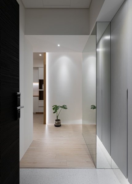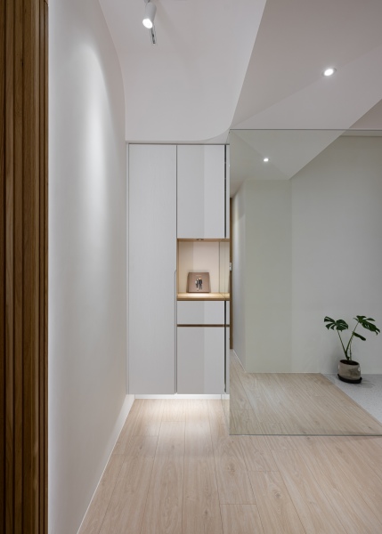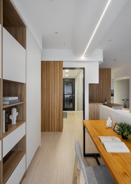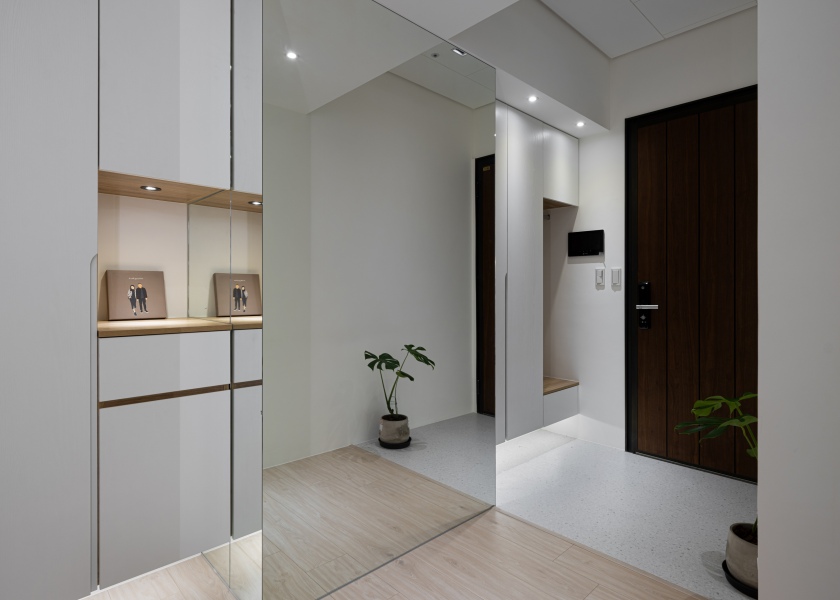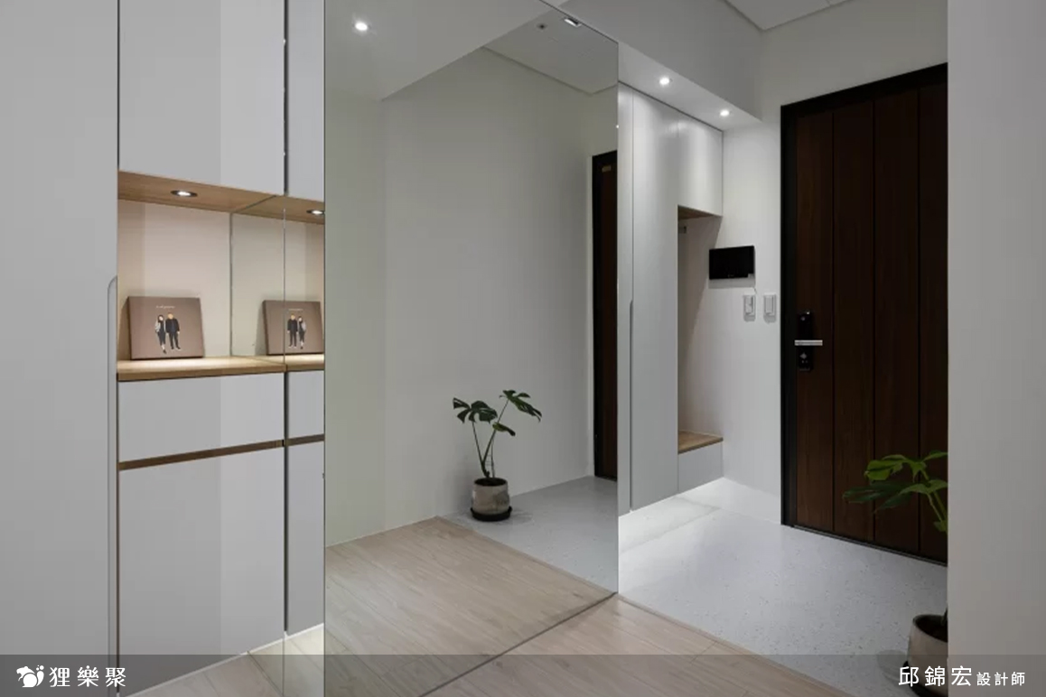 下班、採購…返家後手上總有大包小包的物品需要放置,設計師以異材質劃分出玄關空間,並規劃了鏤空的收納櫃與穿鞋椅,既能將常穿的鞋具收納於底部,也滿足進出門時暫放物品與換鞋需求,襯上大面的落地鏡,方便屋主出門時整理服裝儀容,同時延伸整體空間感受。公領域則以半高牆隔出開放式書房區,搭配上滿牆的收納格櫃,不僅可以當成書櫃、收納櫃使用,亦可作為展示櫃,讓屋主能隨心情變換更換展示品,打造不同的居家氛圍。