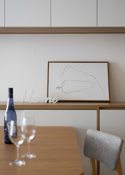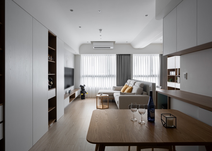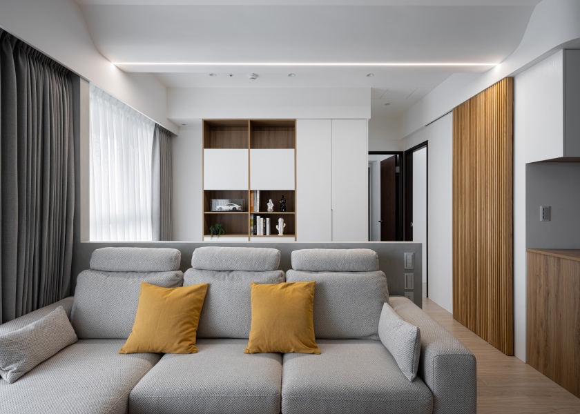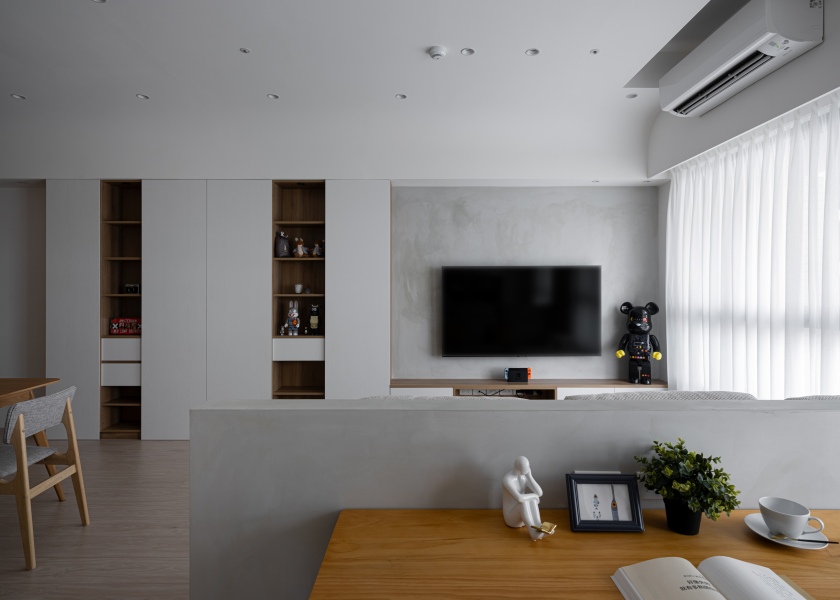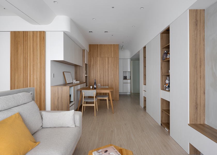 為打造出放鬆且舒適的無印風格,設計師利用木與白元素為主要搭配,並於空間中帶入有著手感紋理的電視牆面、沙發背牆相互呼應,襯上弧面造型天花,使空間溫暖且優雅。衛浴、廚房門片則特別以隔柵門規劃,降低門片的存在感,將其完美隱藏於空間中,營造開闊的視覺性。