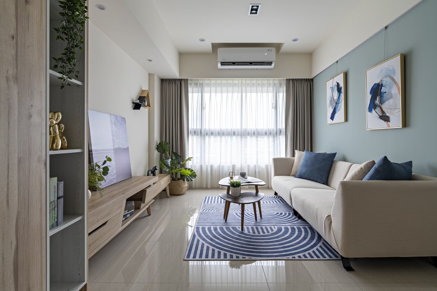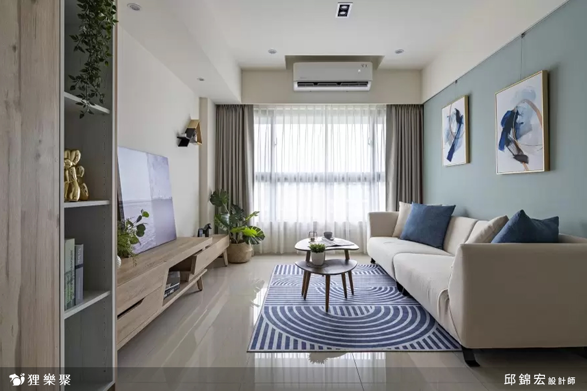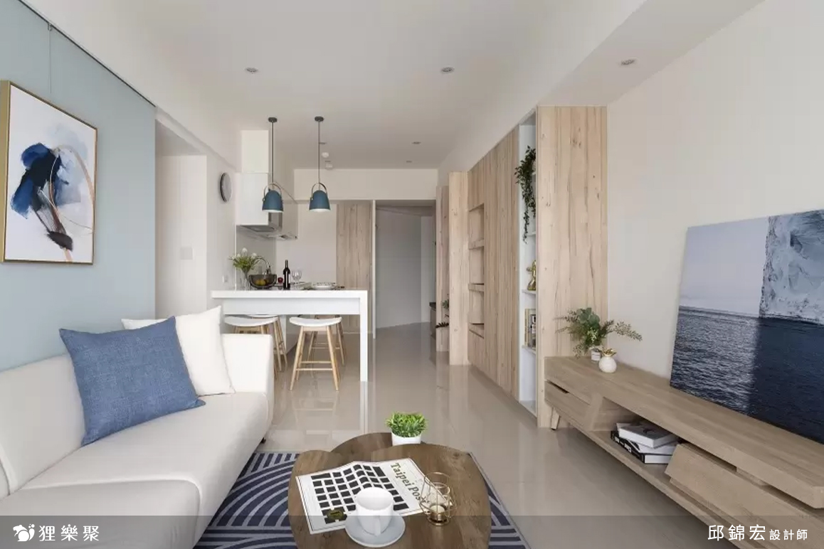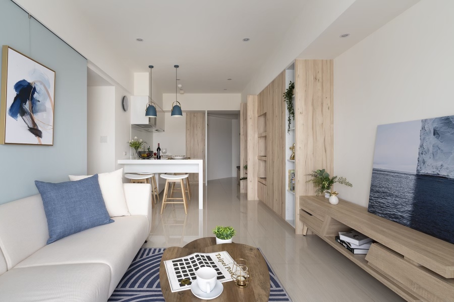 以木紋傢俱替北歐風的空間作點綴,如電視櫃、客廳茶几、餐椅等等,和木紋色調的系統櫃彼此相互呼應,搭配些許植栽,自然的元素讓空間活力與沉靜並存。