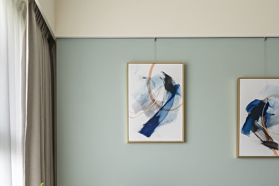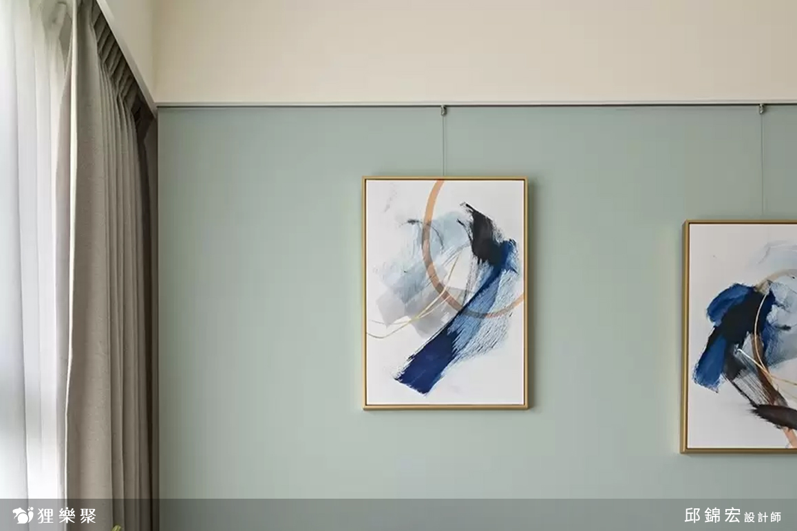 而主牆面漆上嫩綠色調的油漆,搭配深藍色系列的餐廳吊燈、抱枕和地毯,北歐風和諧的配色能讓人不由自主地放鬆下來,一掃在外打拼整天的疲憊。