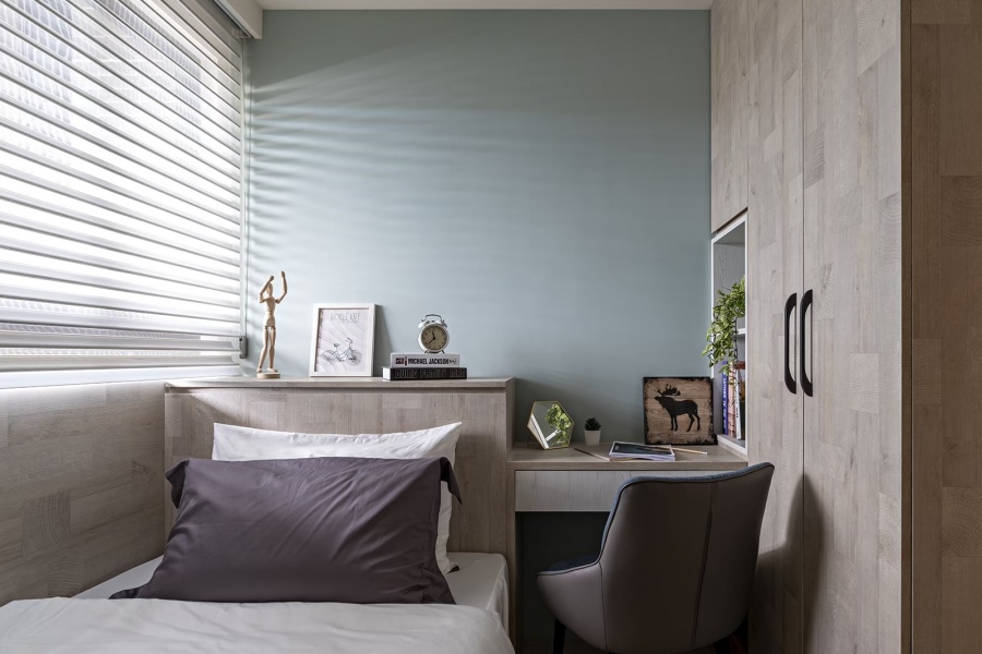 當屋內坪數不大時,如果要將空間利用到極致,選擇系統櫃能夠減少畸零空間的產生,在裝修前預先想好會放置哪些物品及特殊物件的尺寸,並且加以考量個人的使用習慣,量身訂做的系統櫃可以讓生活更加便利及順手。在餐廚區域規劃了系統櫃,包含一般收納櫃及電器櫃,再連接到客廳的展示櫃,以淺色木紋門片和白色櫃體做跳色,放大了小坪數的視覺效果,使用同色系的櫃體能夠營造出具有整體感的空間;另外,由於次臥的空間非常狹小,如果買現成的家具回來擺放,很有可能會因為遷就尺寸而買不到適合的款式,而以系統櫃做整體規劃,能夠將空間用得淋漓盡致,不僅不浪費衣櫃上方的空間,床頭和床架下方也都能收納換季的衣物和棉被。