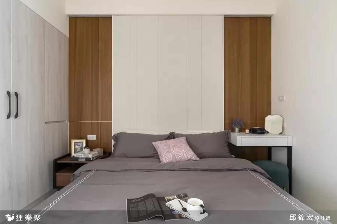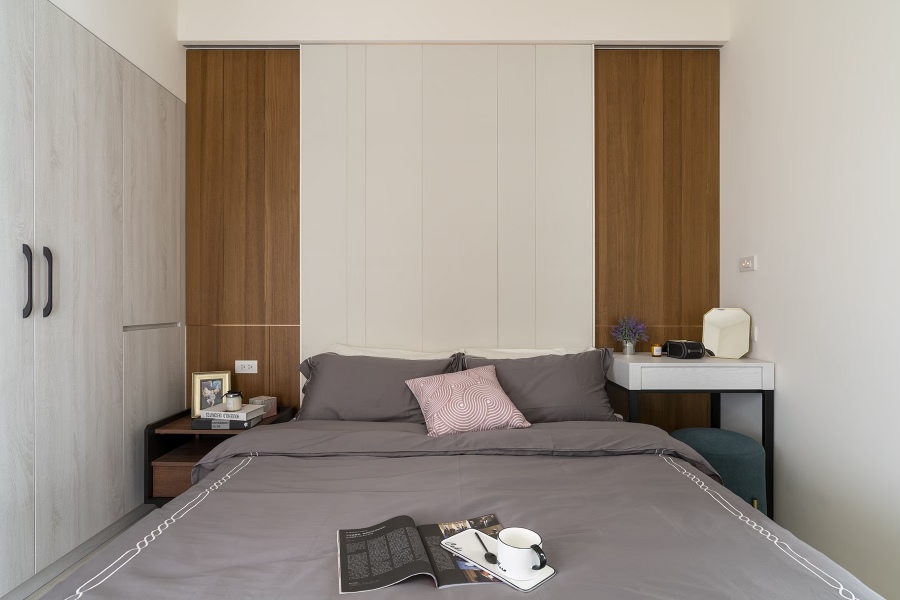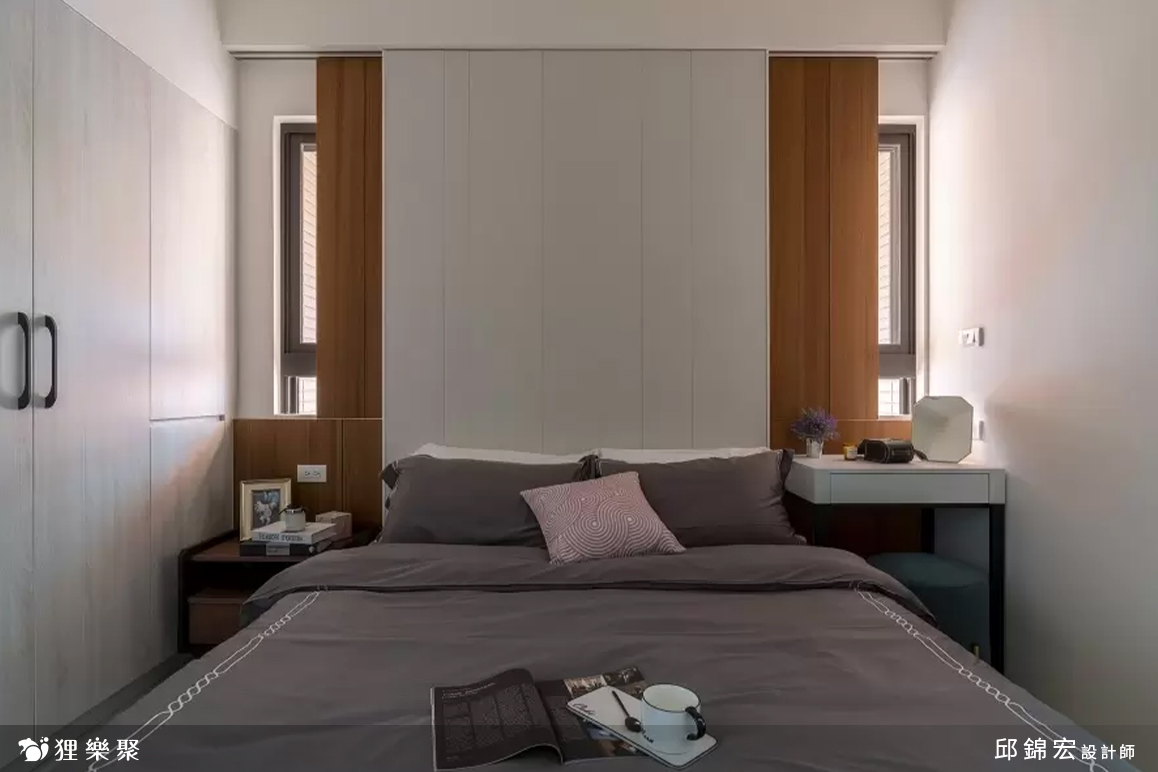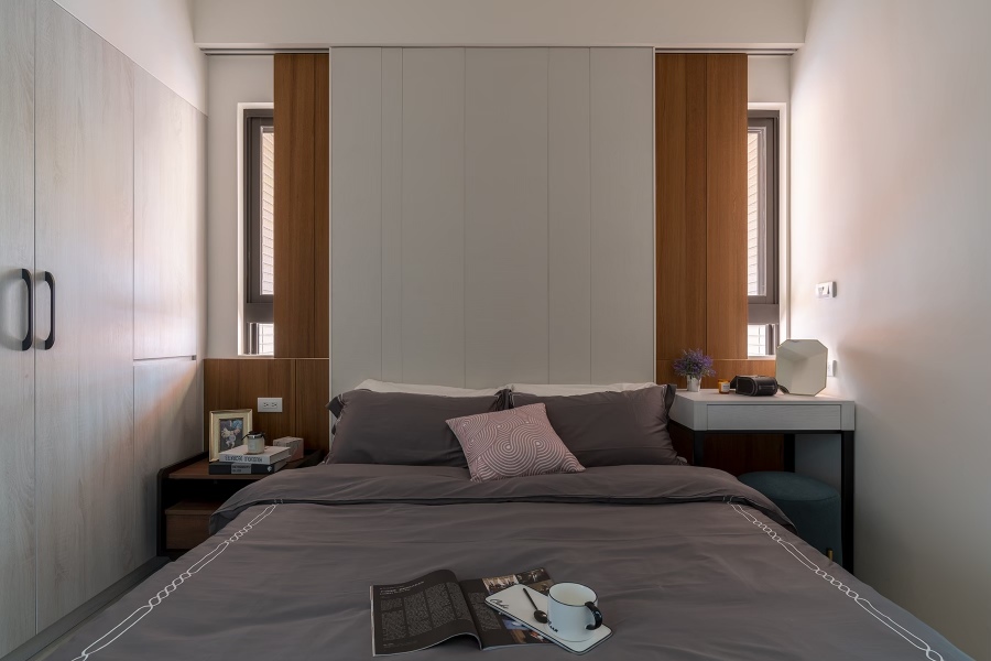 由於主臥配置的考量,床頭只能靠窗,設計師直接在床頭的部分規劃頂天的床頭板,兩側加上隱藏門的設計,打開時自然光仍可以透進來,關上時也能夠讓怕光的人安穩地睡個好覺。
