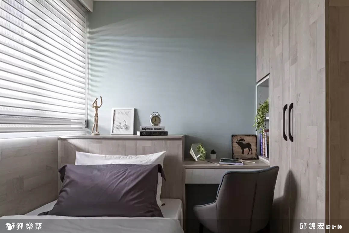 在餐廚區域規劃了系統櫃,包含一般收納櫃及電器櫃,再連接到客廳的展示櫃,以淺色木紋門片和白色櫃體做跳色,放大了小坪數的視覺效果,使用同色系的櫃體能夠營造出具有整體感的空間;另外,由於次臥的空間非常狹小,如果買現成的家具回來擺放,很有可能會因為遷就尺寸而買不到適合的款式,而以系統櫃做整體規劃,能夠將空間用得淋漓盡致,不僅不浪費衣櫃上方的空間,床頭和床架下方也都能收納換季的衣物和棉被。