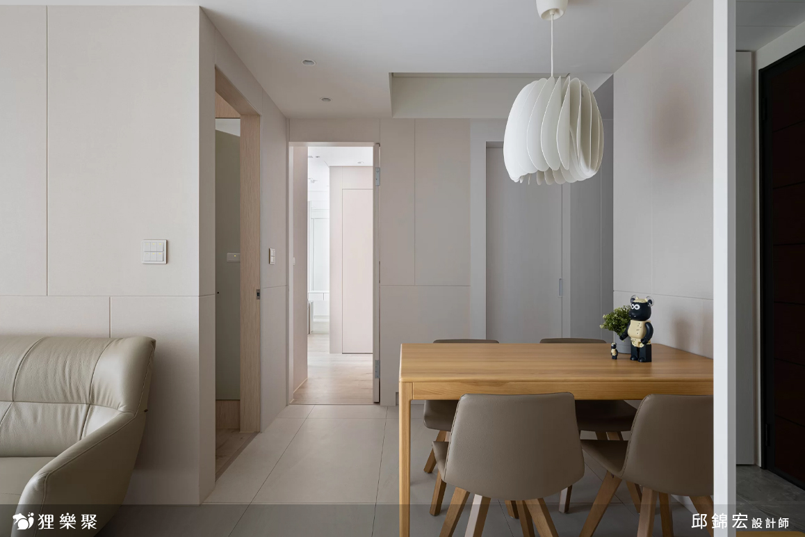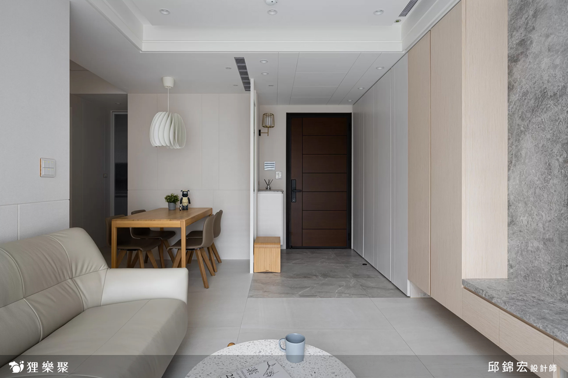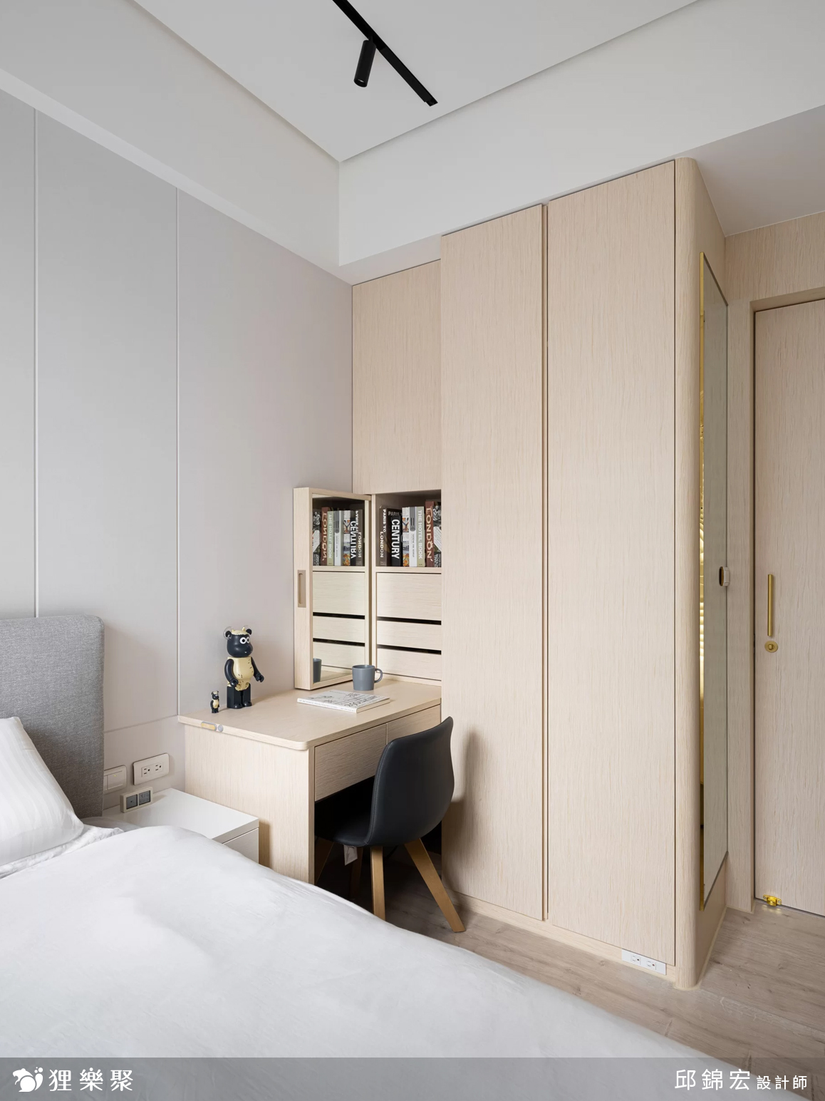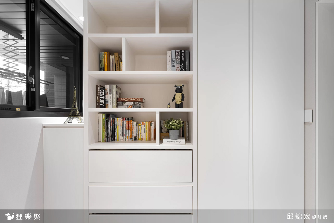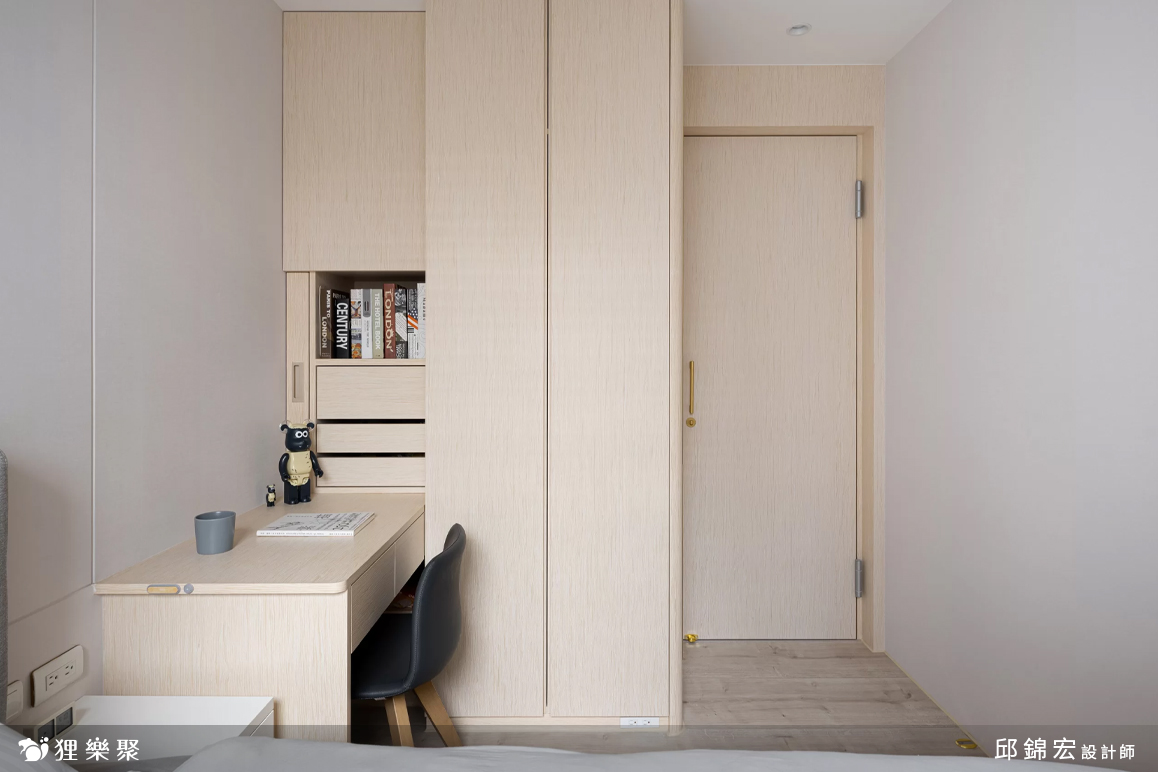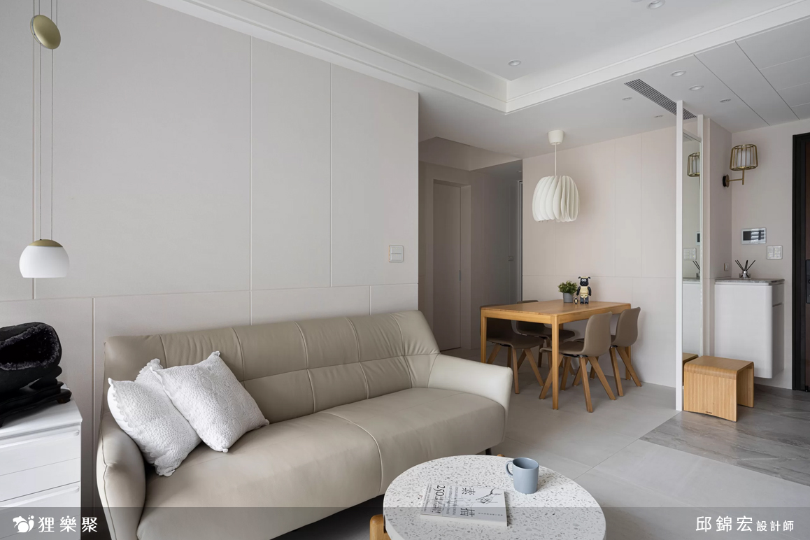 現代簡約風設計常以黑白灰做為基調,用以打造極簡的俐落空間,在現代簡約風定義中,單一色系也可以擴大視覺感受,設計師在這個案例中選擇了白色基底,搭配米灰色的裝飾壁板,再輔以局部帶黃調的櫃體,都是清淡柔和的顏色,整體淺淡的色系也讓空間放大了不少。延伸閱讀:<< 小宅放大術裝潢秘笈,放大你的家! >>