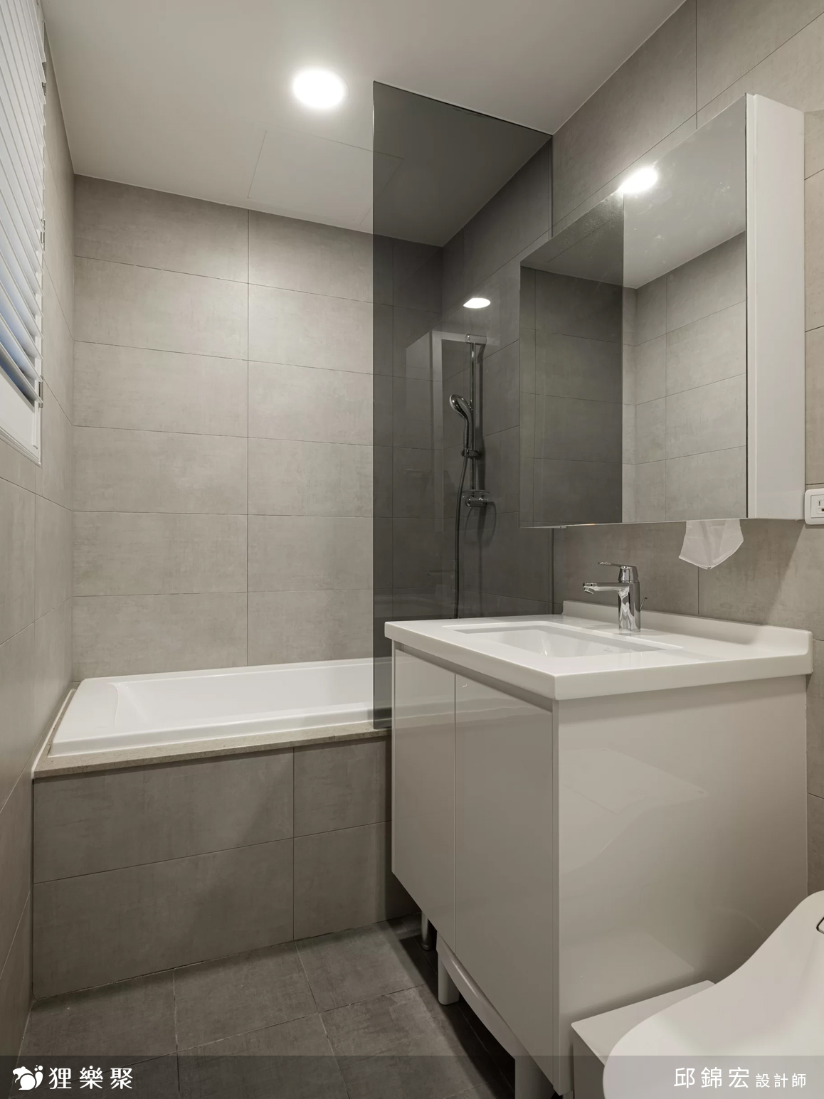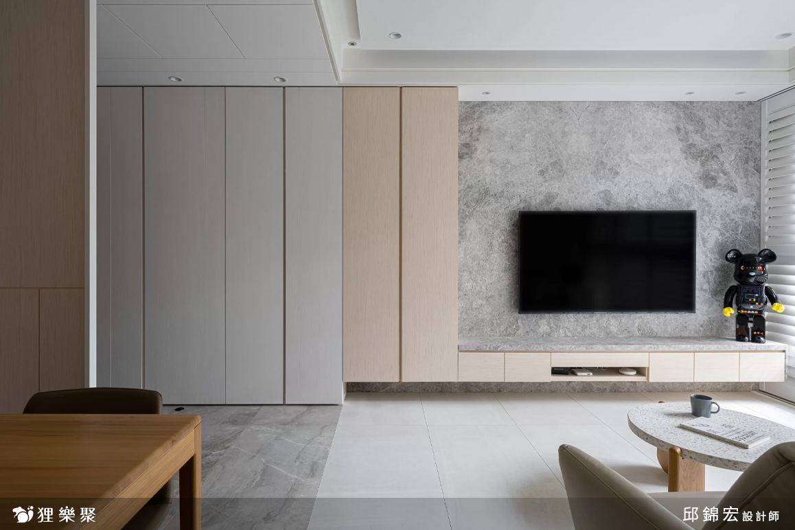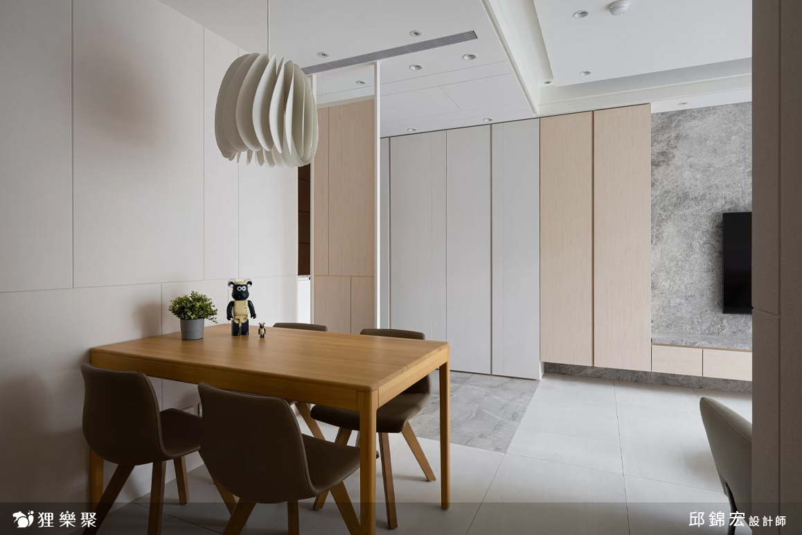 石紋也是現代簡約風定義中相當重要的元素,從電視牆延伸到電視櫃檯面的灰色石紋,以及落塵區的石紋磚,替空間添加了不少奢華感。現代簡約風裝潢的燈具大多以嵌燈為主,設計師為屋主在餐廳區域選擇一盞極具特色的白色吊燈,流暢的線條造型也為空間加分許多,主臥的化妝鏡則在後方兩側加上條燈,營造出時尚優雅的貴氣氛圍。