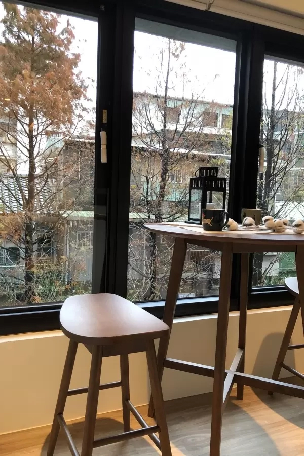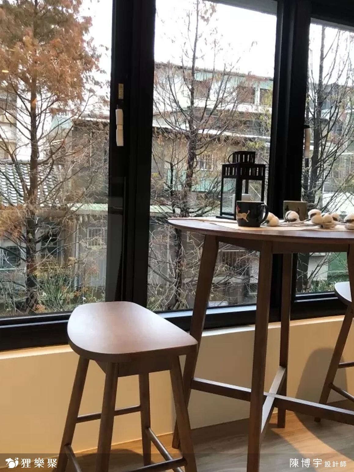 窗邊的休閒區域鋪上溫暖色調的木地板,再擺上桌椅,很適合睡前和家人在此小酌兩杯,聊聊最近的心情,或是如果不想要晚餐配電視,也能在這裡吃上一頓燭光晚餐,配上窗外的風景,更是別有一番滋味。