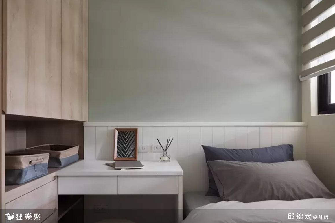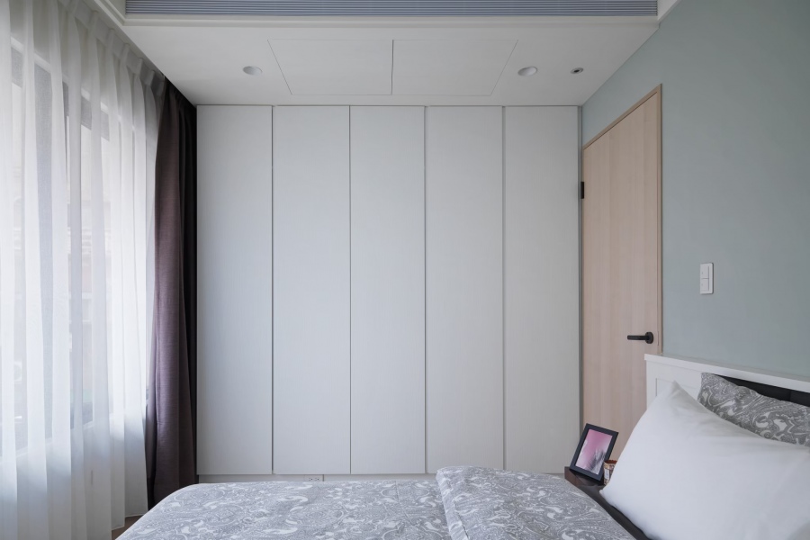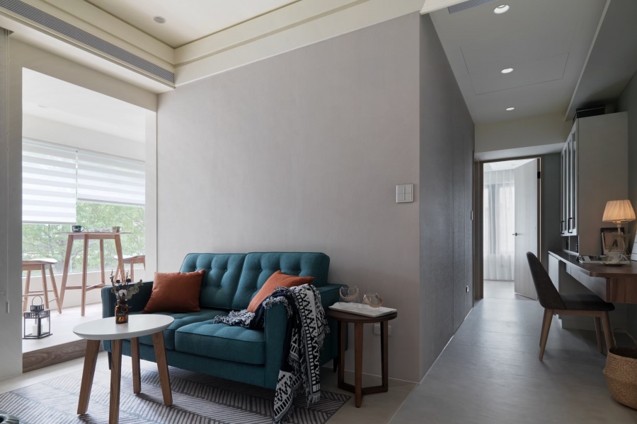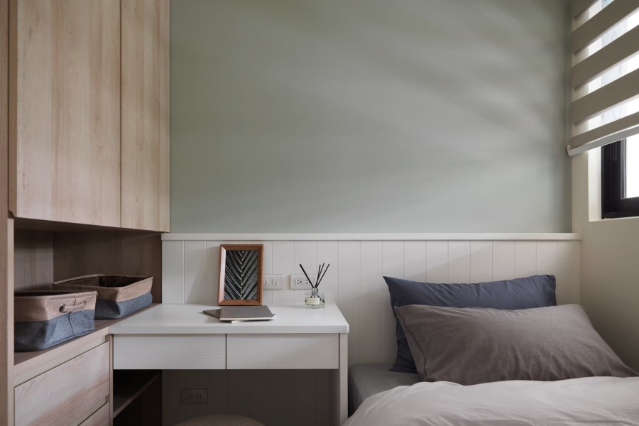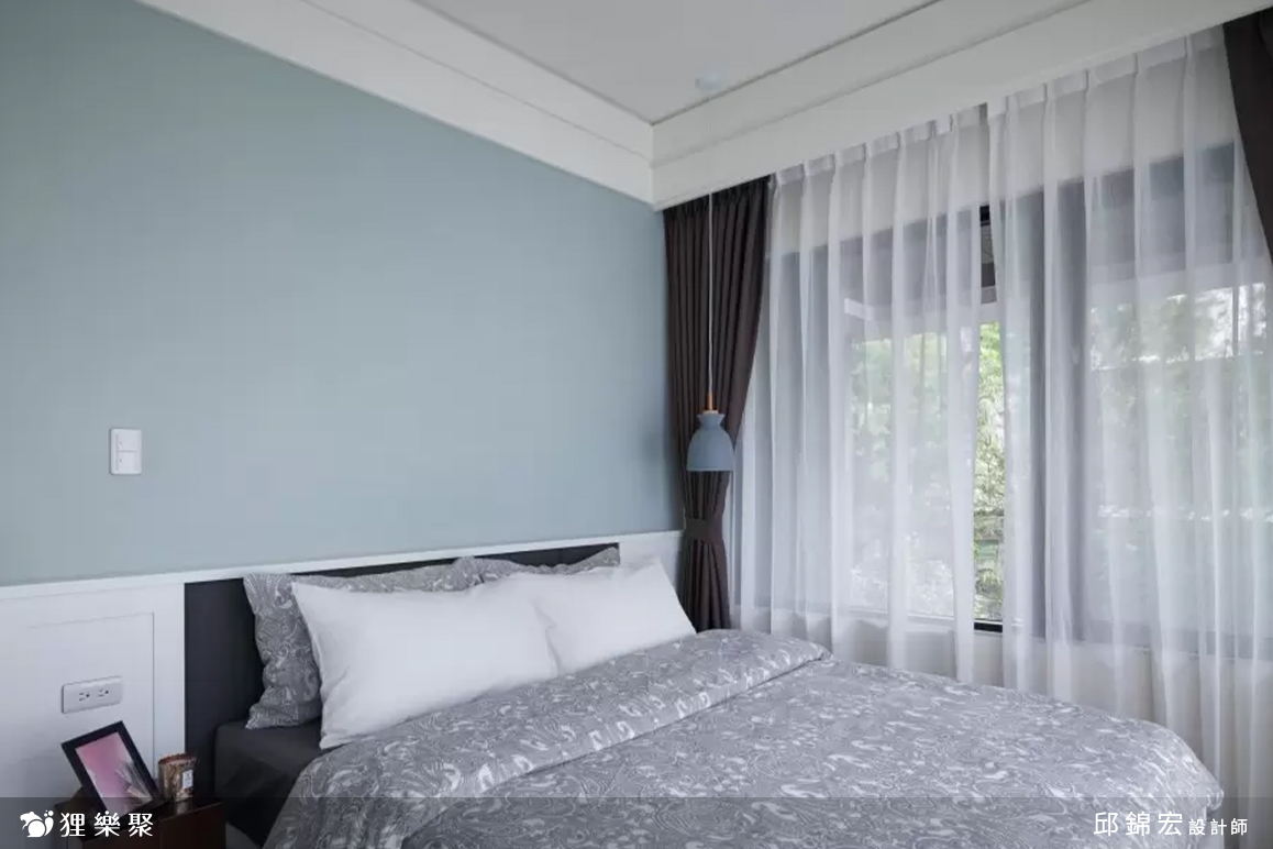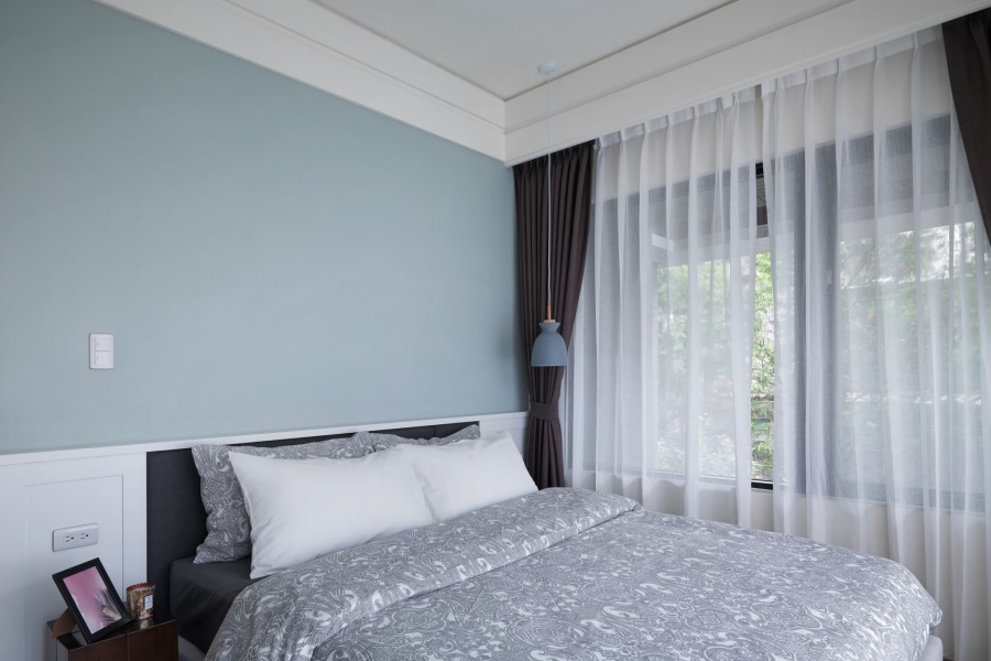 客廳主牆漆上米灰色,在餐邊櫃鏤空的壁面漆上嫩綠色,讓公共空間整體的基底色調相當柔和,布沙發和抱枕則選用較強烈的顏色,層次感豐富,即使沒有繁複的線條設計,和諧的配色也能夠打造出色的裝飾。臥室則漆上淡淡的灰藍色,搭配同色系的床頭吊燈和床單,清爽的色系能讓人不自禁的放鬆下來。