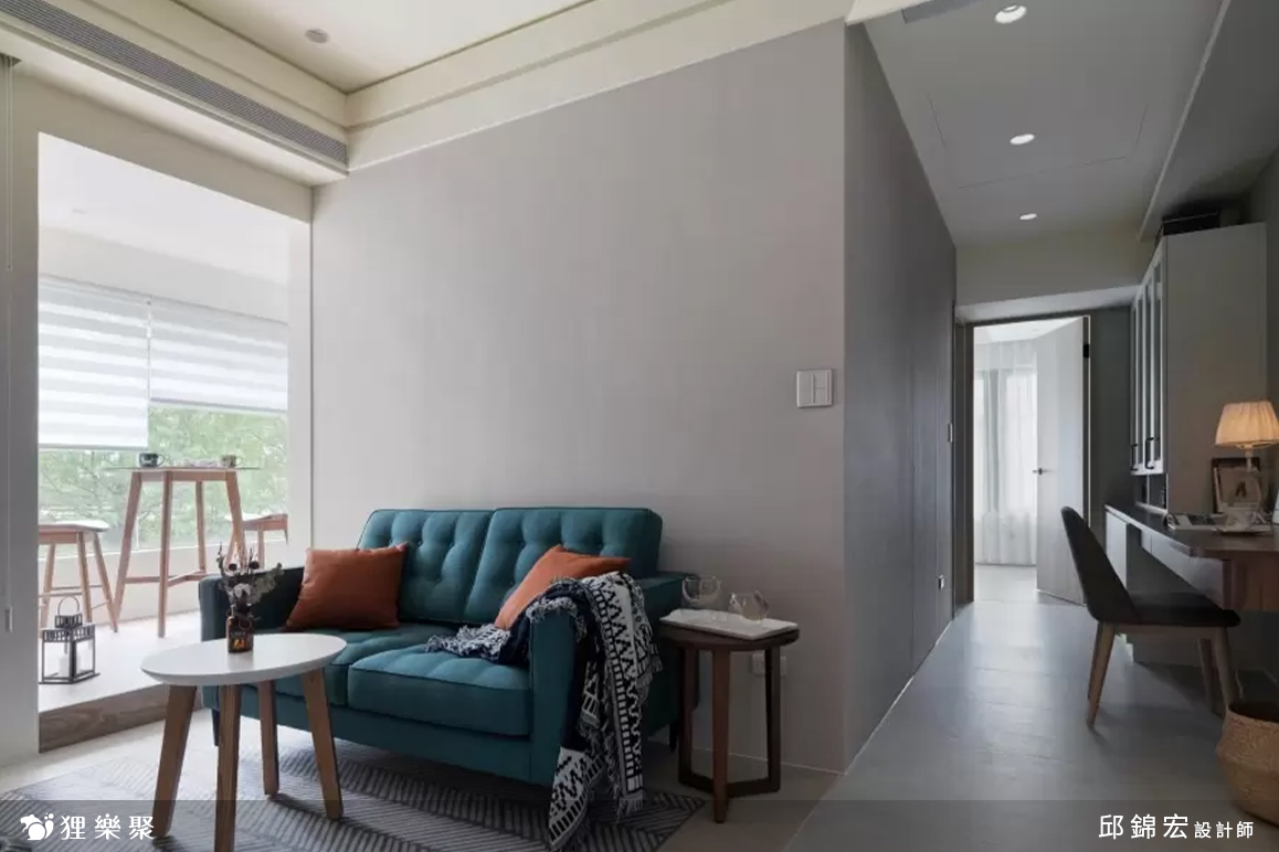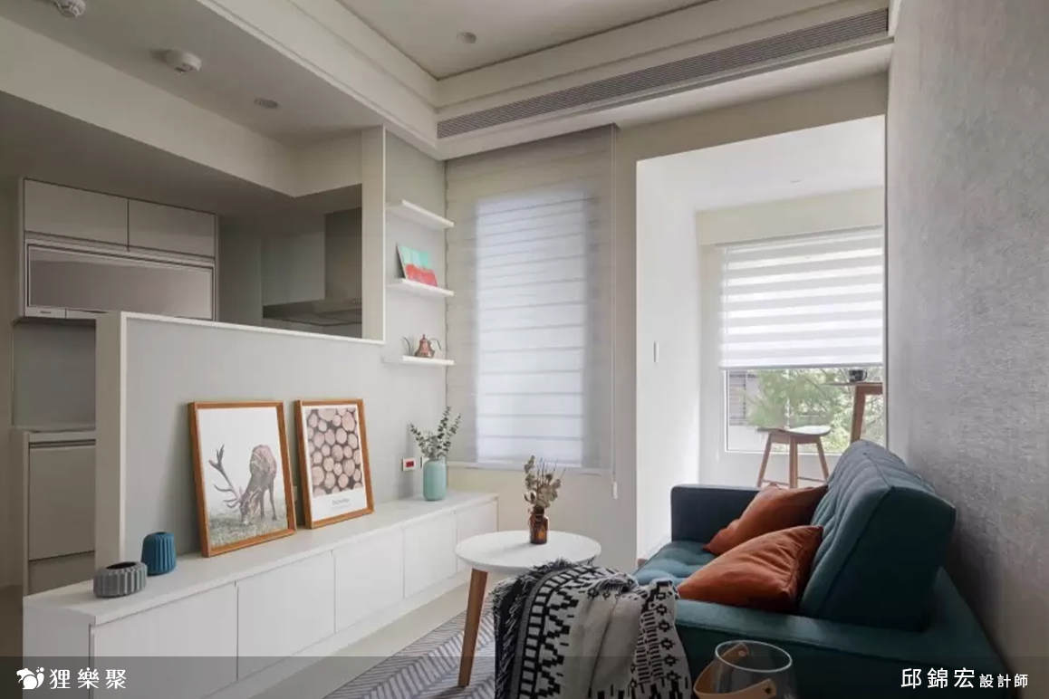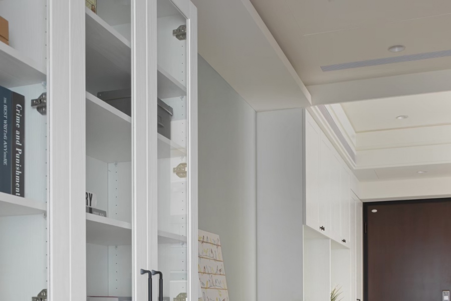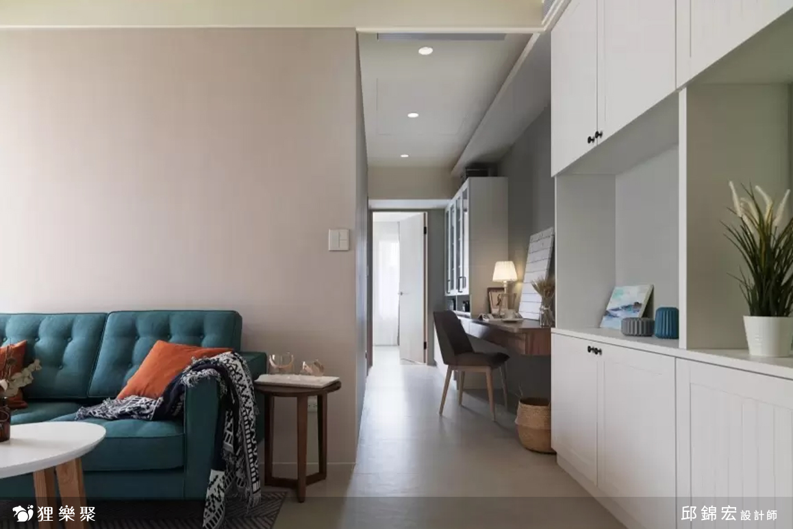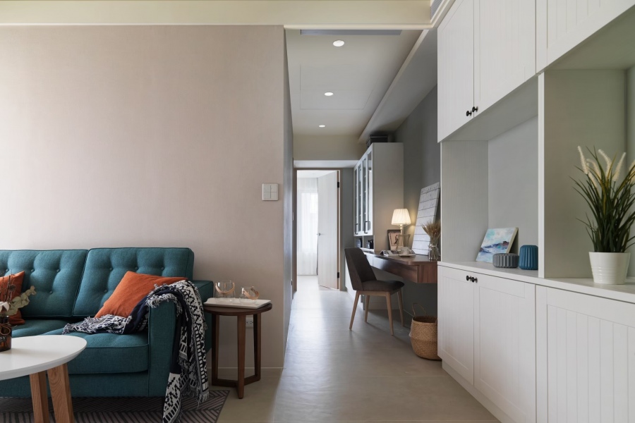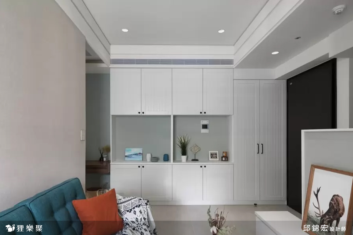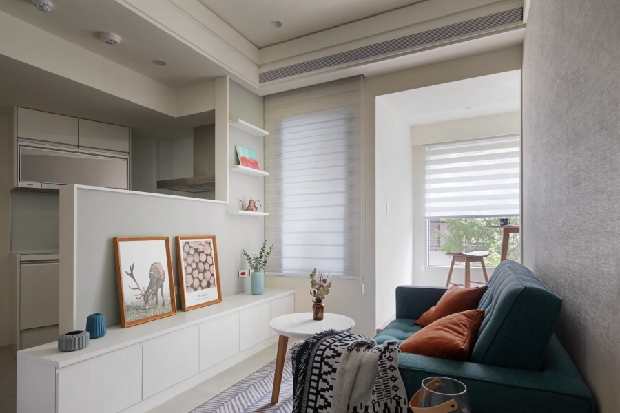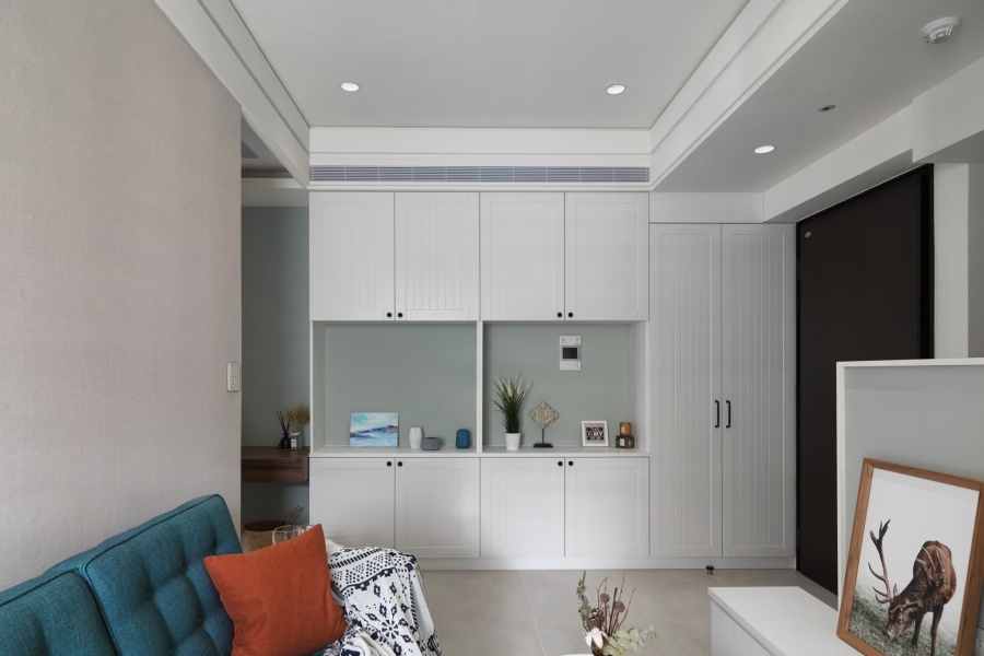 由於客餐廳區域並不大,根據現代人的使用習慣,不另外設置餐桌,而電視牆以半牆的形式設計,空間感覺更通透,也避免了讓個別的區域有壓迫感;客廳櫃子以電視牆下的收納櫃和餐邊櫃為主,提供足量的收納空間,餐邊櫃鏤空的部分除了放置餐廚電器,也能做為展示櫃使用。沿著走廊往內,在牆邊設置了展示櫃的區域,可以擺放怕灰塵的書籍、公仔、相片、收藏品等等。