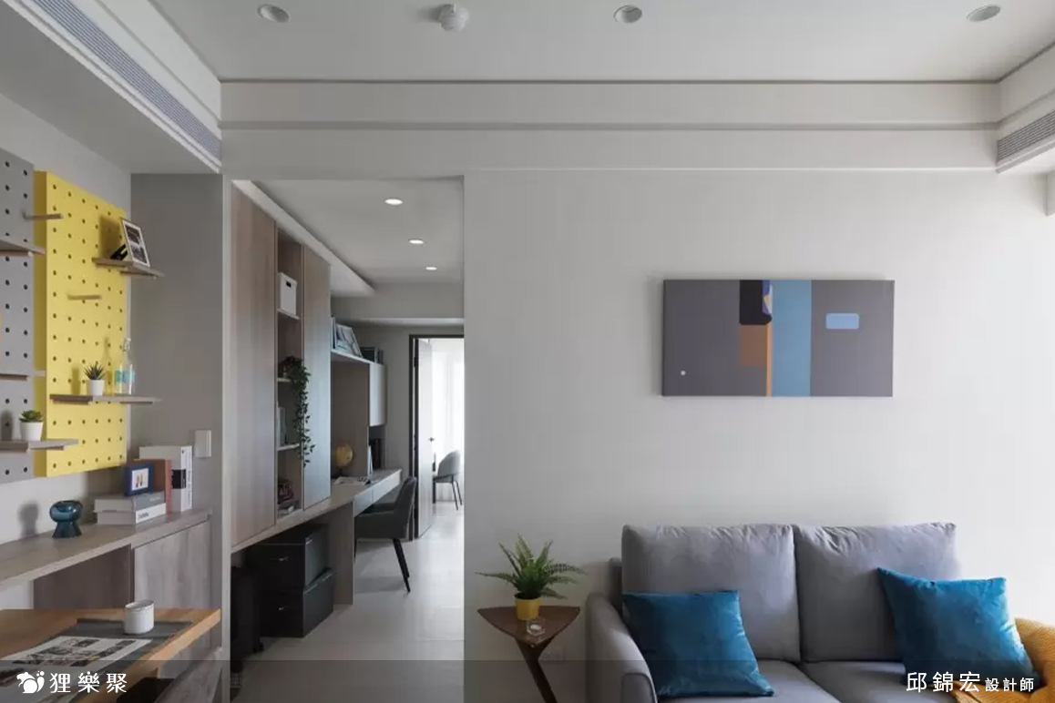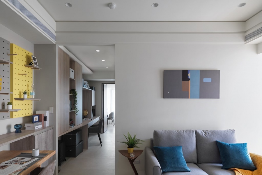 客廳主牆掛上幾何畫作,呼應沙發和抱枕的色調,餐桌旁灰色和黃色的洞洞板能夠放置一些展示小物,成為客餐廳的一道機動性很高的俏皮風景。
