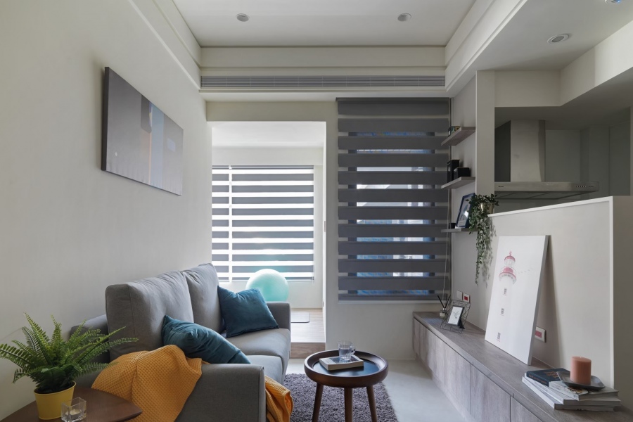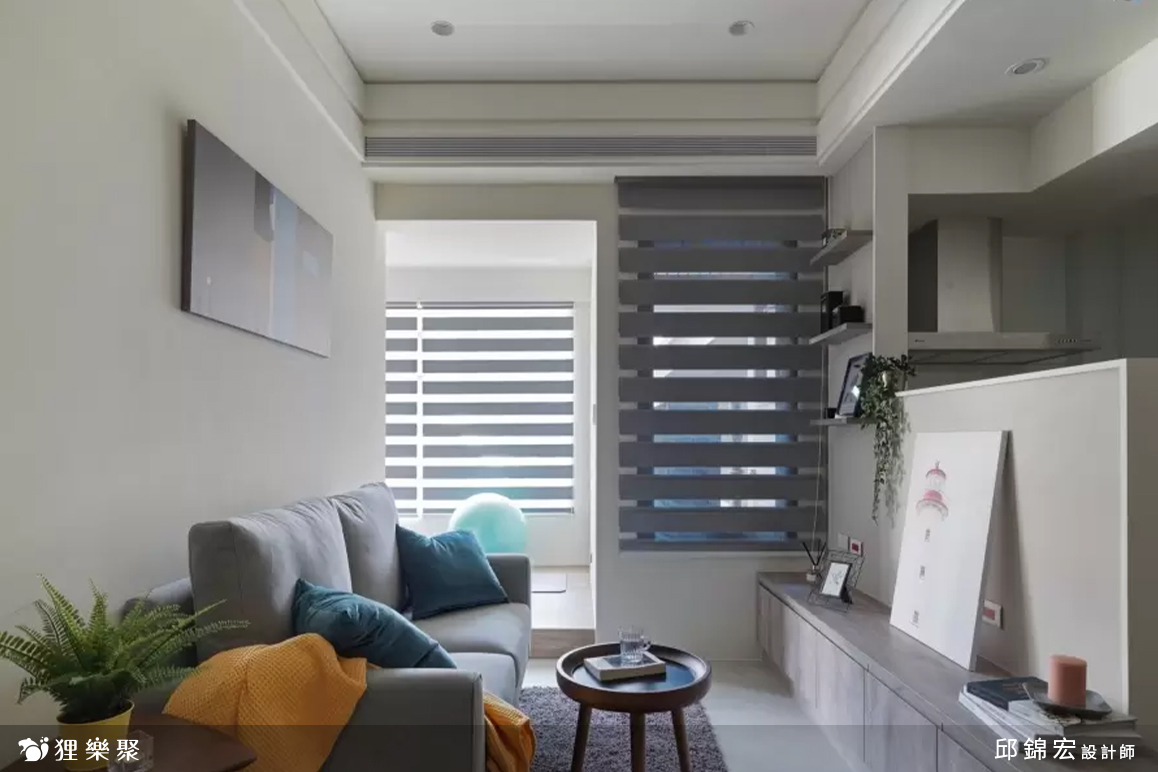 電視牆設計為半牆的形式,背後即是廚房區域,讓公共區域顯得不那麼狹窄,其中要注意的是半開放式的廚房所造成的油煙問題,務必要仔細考量平時的生活習慣,才能做出最適合屋主的選擇。低矮的電視牆設計也讓整體視覺重點下沉,更顯現出小空間的溫馨感。