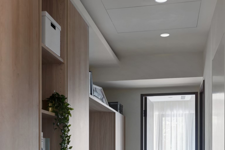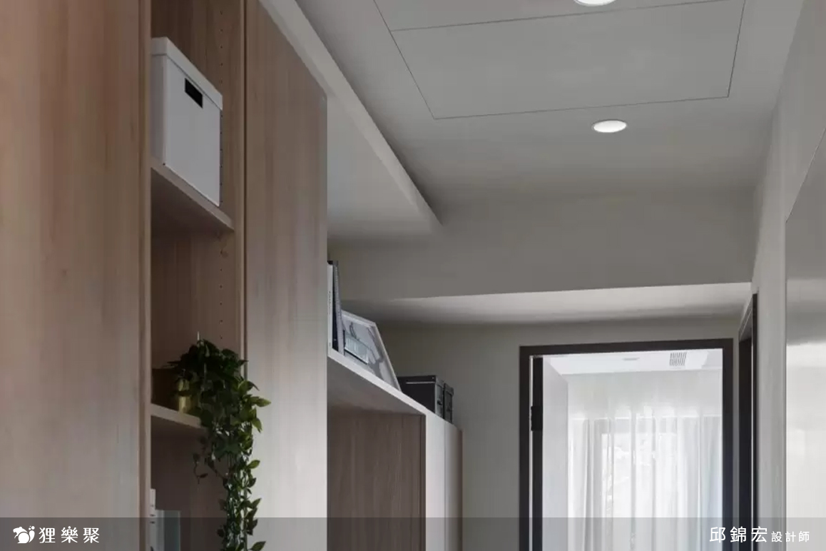 走廊上的收納櫃子和衣櫃皆使用淺色的木紋板材,餐桌旁的收納櫃則選擇較為冷調的色系,層次感豐富,混搭出一番新滋味!