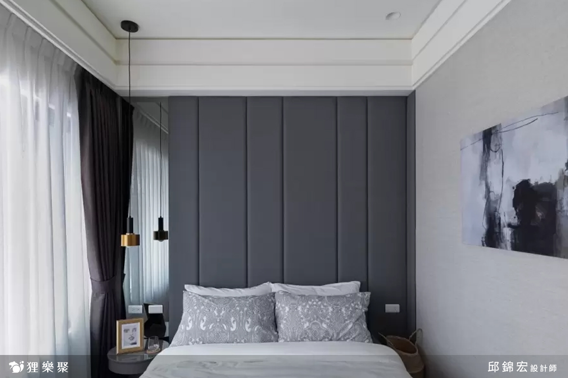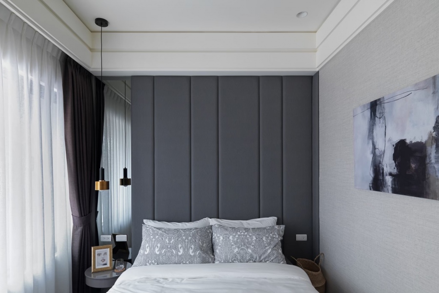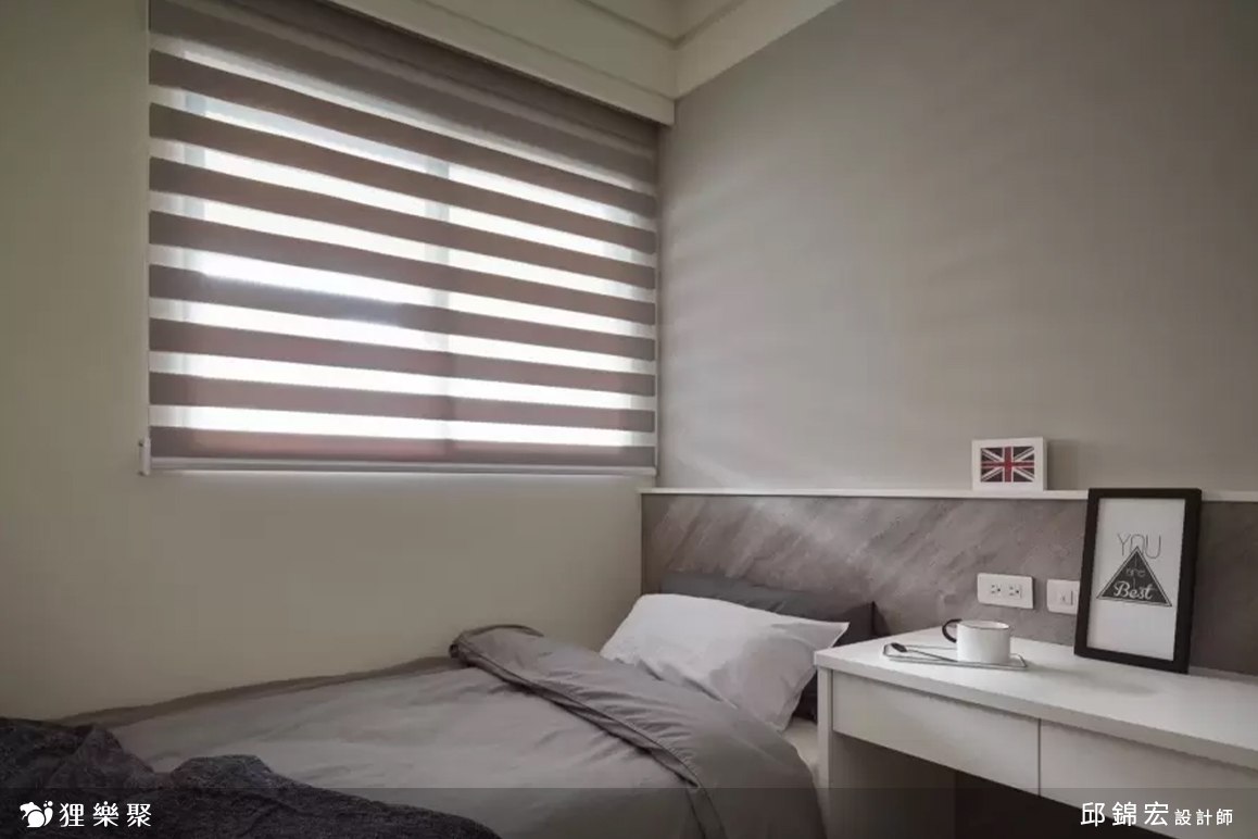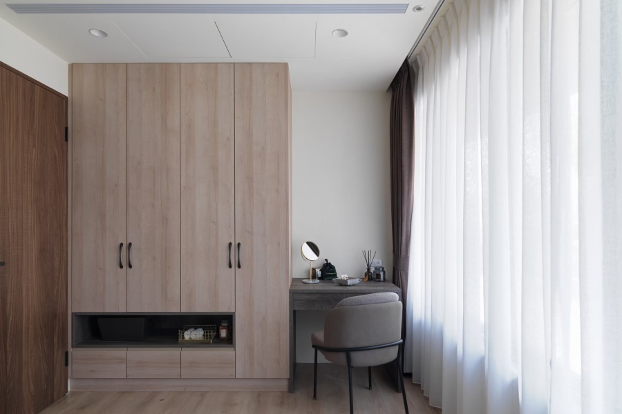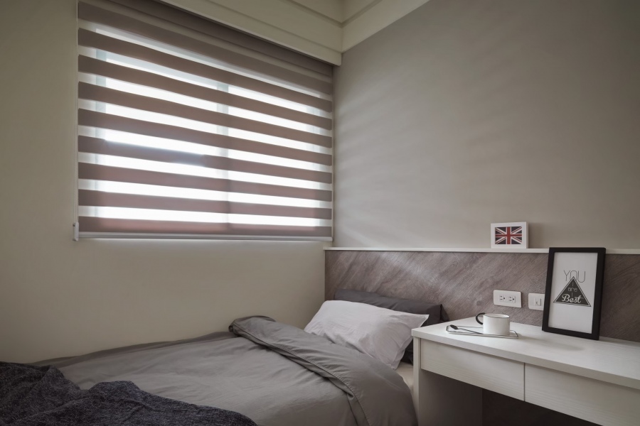 窗簾的部分選用調光簾,調光簾有著優秀的光線調節能力,同時能對私人空間起到很高程度的保護隱私作用,同時也較不容易長灰塵,此款窗簾非常適合過敏族群來選擇。