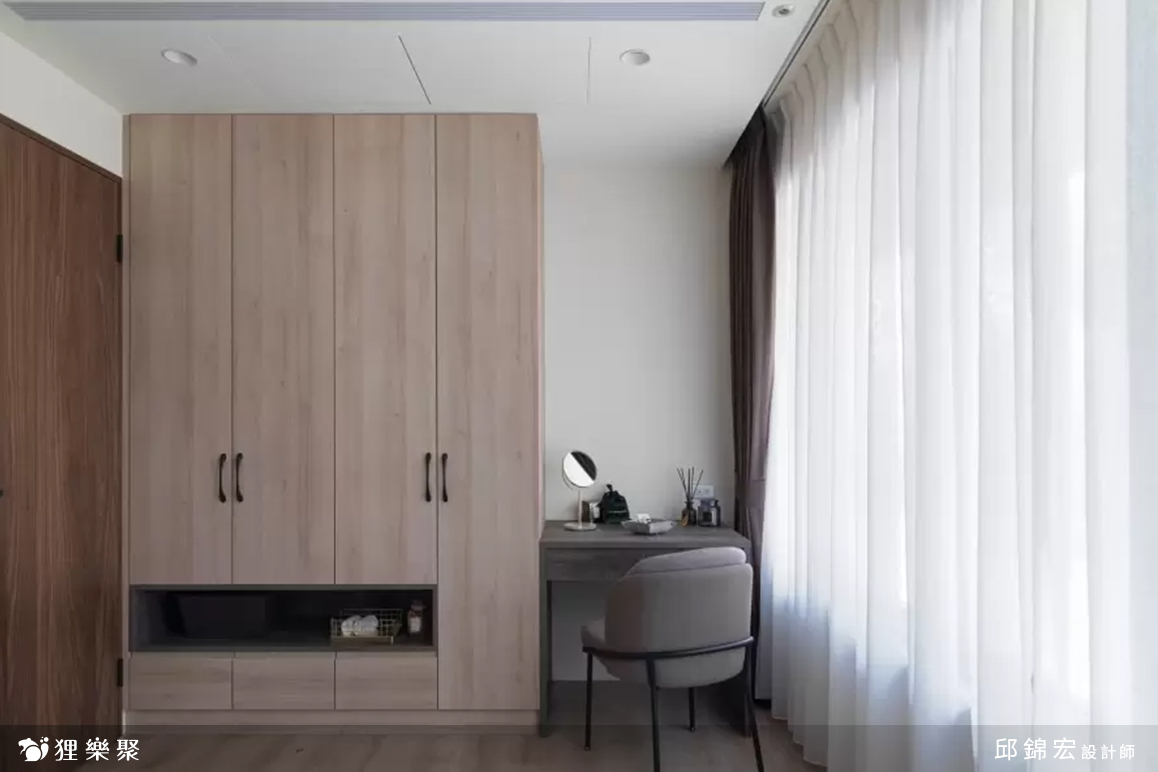 在設計居家空間案時,規劃收納櫃子一向是重頭戲,生活總是離不開收納,但要如何在視覺上不被高聳的櫃子占滿,適當地規劃開放櫃或是選擇和屋內色調較為融合的板材,都能減輕頂天的收納櫃子所帶來的笨重感,例如案例中的衣櫃,在抽屜之上規劃了開放櫃,適合拿來擺放包包,同時達到收納及展示的作用。走廊上的收納櫃子和衣櫃皆使用淺色的木紋板材,餐桌旁的收納櫃則選擇較為冷調的色系,層次感豐富,混搭出一番新滋味!