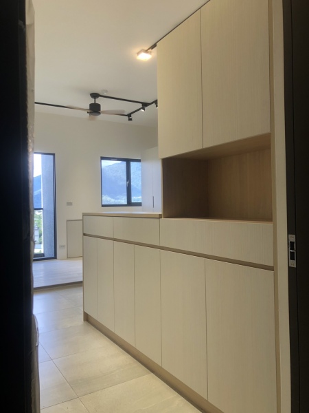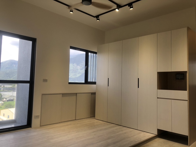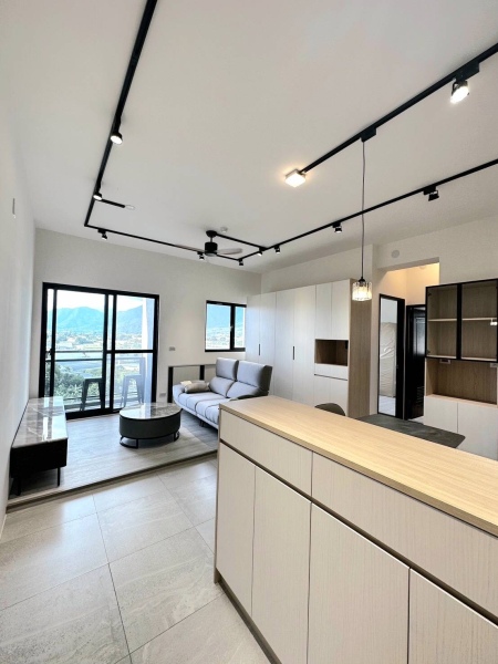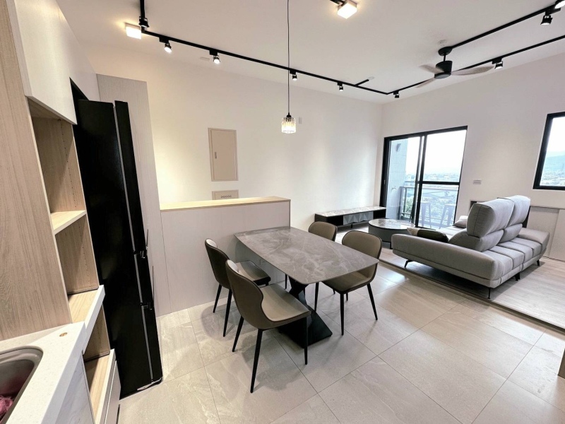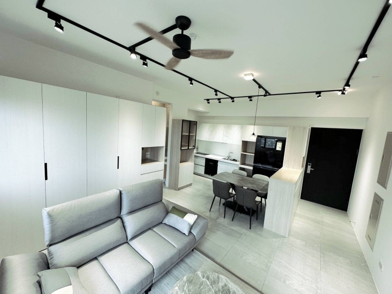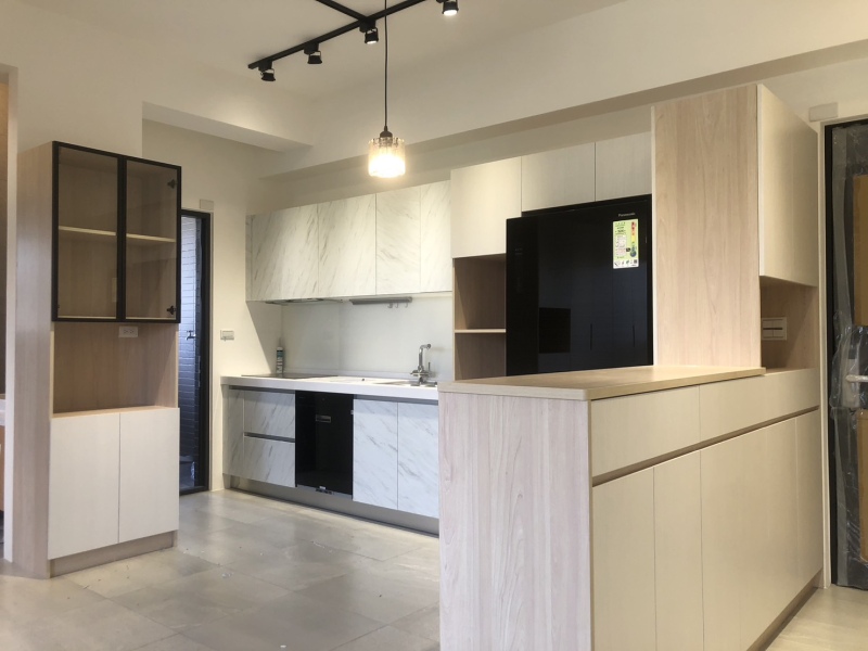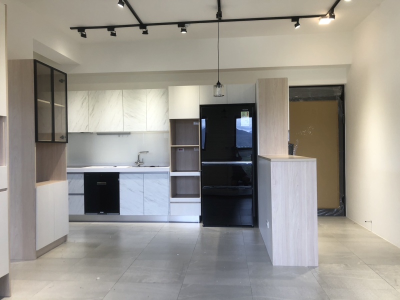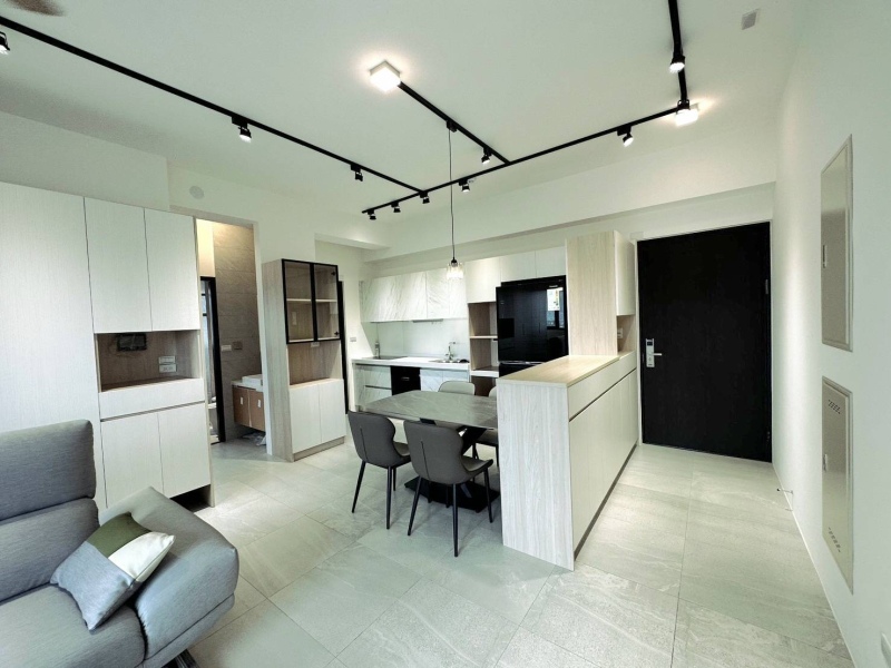 設計理念:整體設計在入口玄關、半開放式廚房,客餐廳空間,選擇了溫馨北歐風格,再搭配具有現代感的燈具設計和家具,將北歐與現代風格巧妙的融合一起。客廳以淺灰色架高木地板為基礎,搭配深灰色沙發,灰階色系電視櫃與茶几。沒有華麗的牆面,以投射燈照在牆面上,便能營造出獨特氛圍感。客餐廳的玻璃黑框展示櫃,可以放置客戶的收藏品,同時將客餐廳空間連接一起,視覺上也能有空間延伸感。讓現代簡約風呈現整體空間的明亮,捨棄繁複的綴飾回歸機能設計。