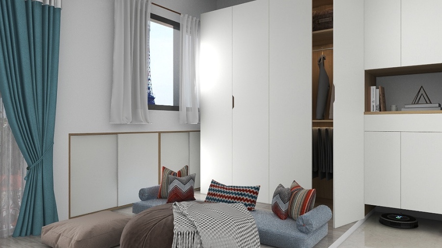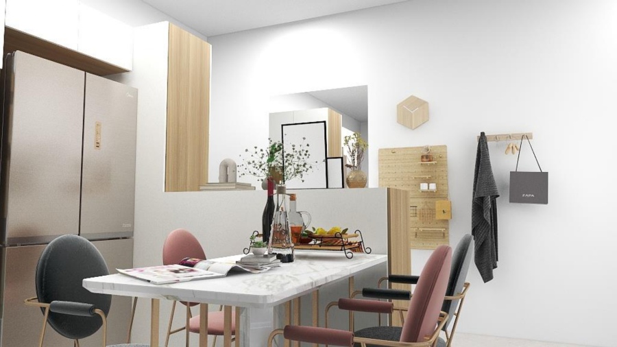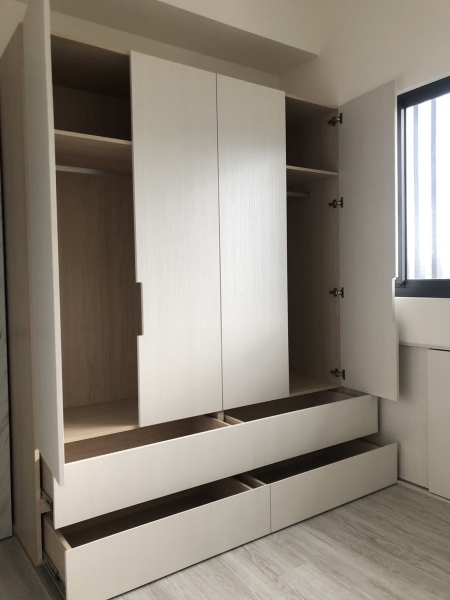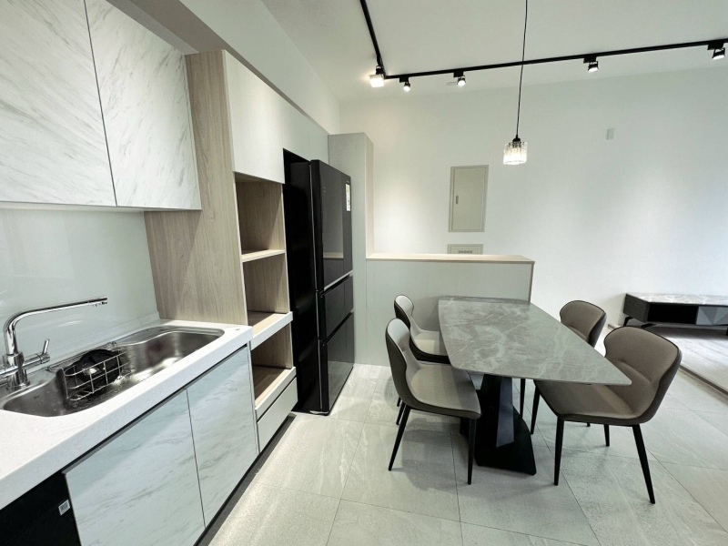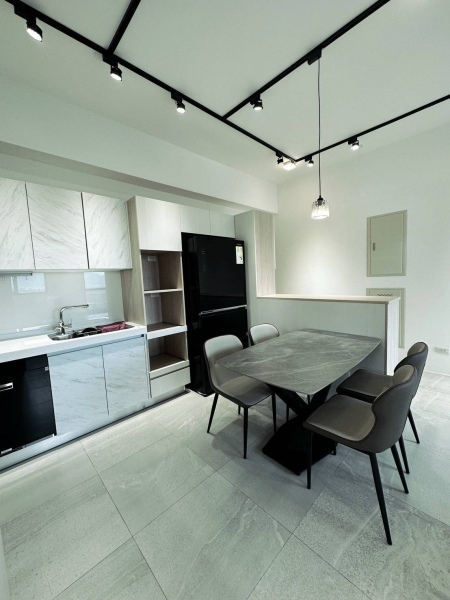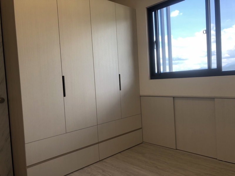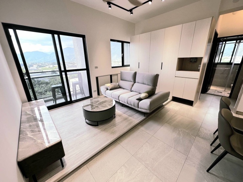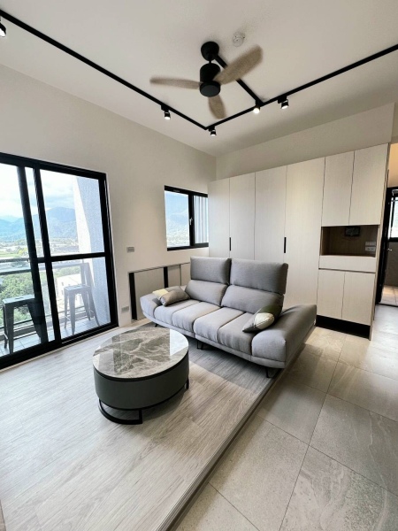 設計理念:整體設計在入口玄關、半開放式廚房,客餐廳空間,選擇了溫馨北歐風格,再搭配具有現代感的燈具設計和家具,將北歐與現代風格巧妙的融合一起。客廳以淺灰色架高木地板為基礎,搭配深灰色沙發,灰階色系電視櫃與茶几。沒有華麗的牆面,以投射燈照在牆面上,便能營造出獨特氛圍感。客餐廳的玻璃黑框展示櫃,可以放置客戶的收藏品,同時將客餐廳空間連接一起,視覺上也能有空間延伸感。讓現代簡約風呈現整體空間的明亮,捨棄繁複的綴飾回歸機能設計。