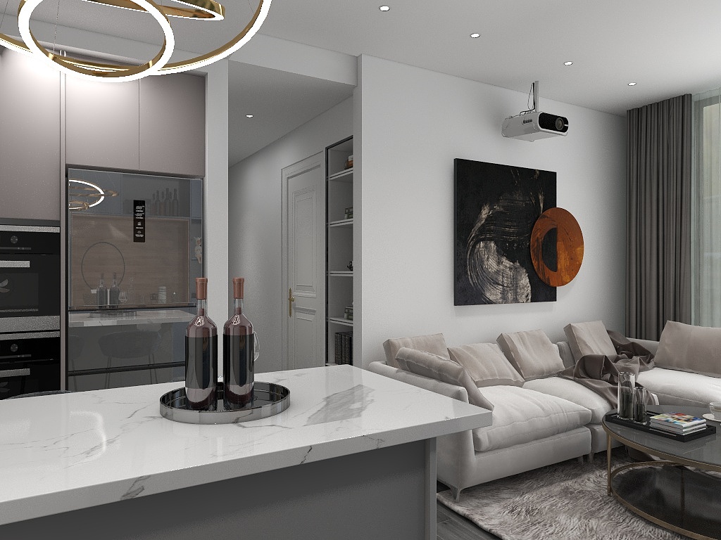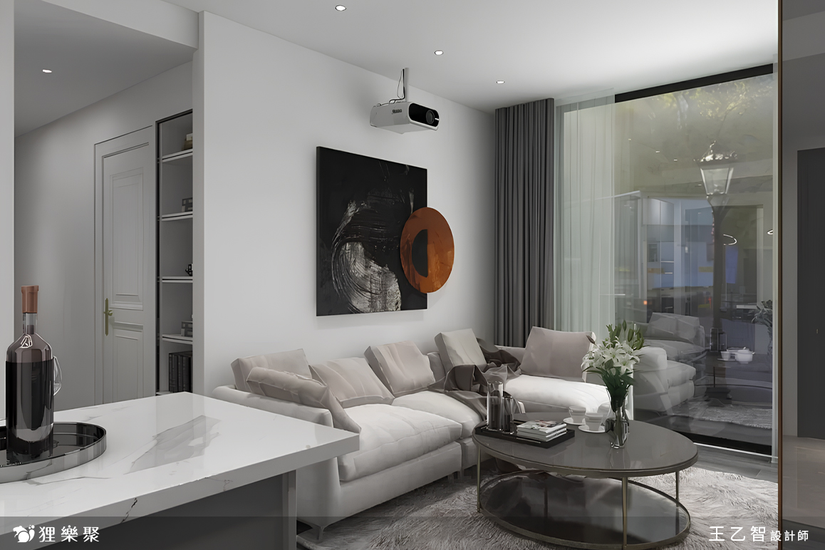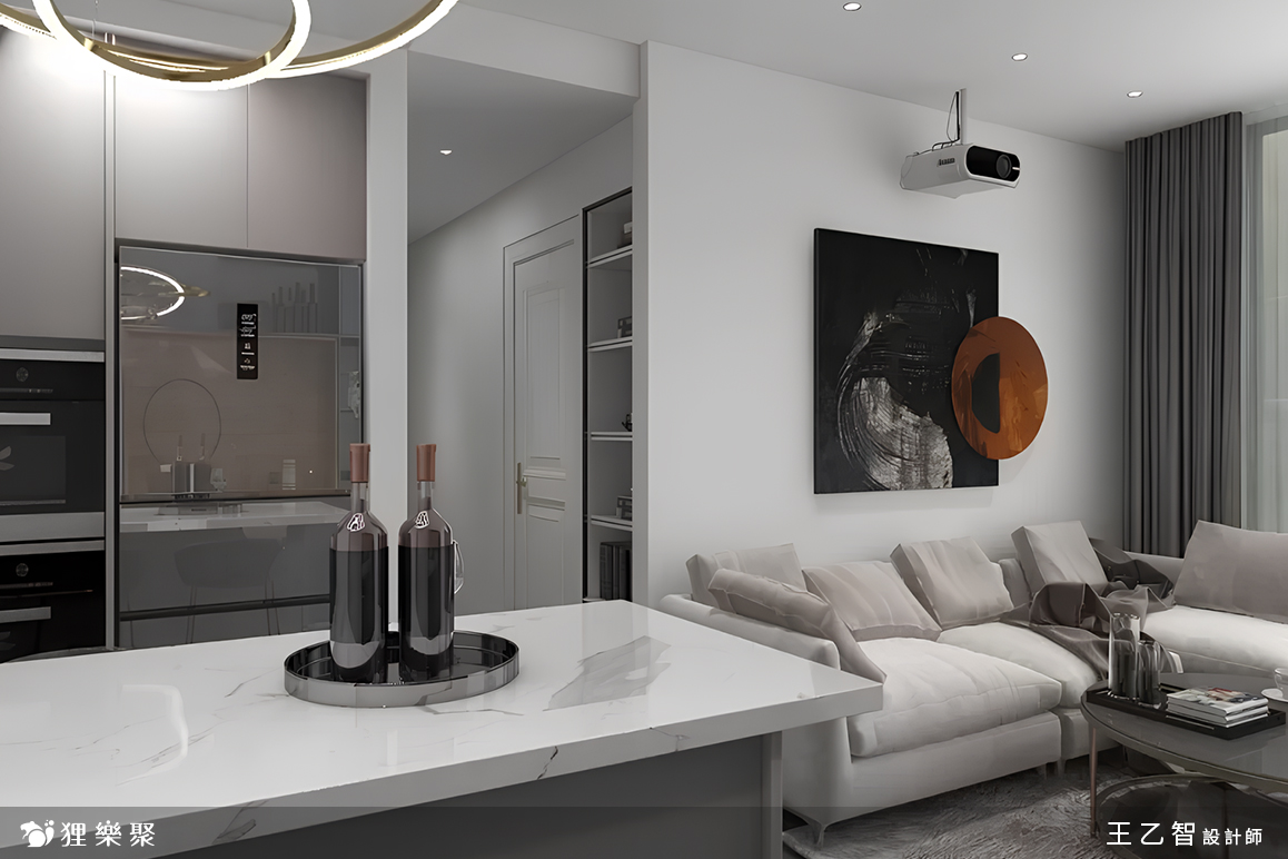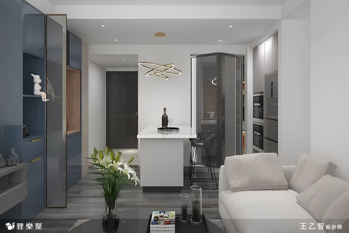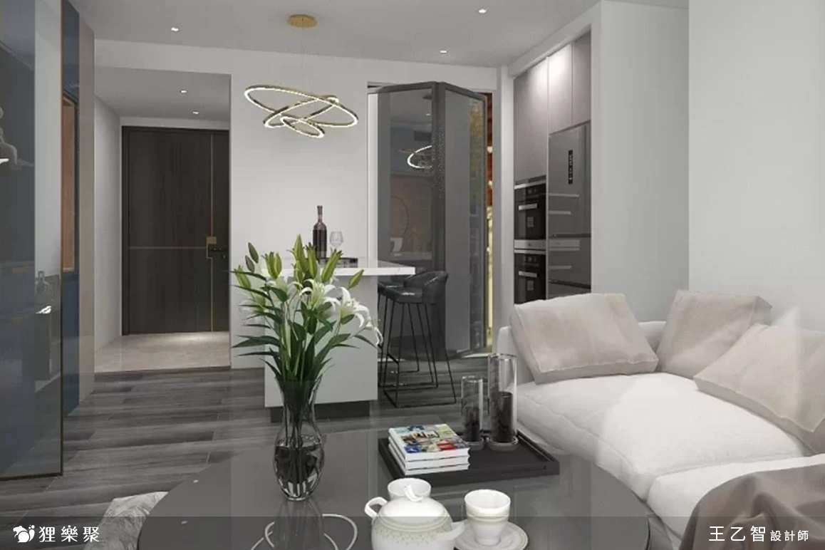 由於現代風在視覺上通常較為開闊,設計師巧妙地利用配置來放大小坪數設計的空間感,從玄關進入室內,左方是兼餐桌使用的中島,比起放一張大餐桌,這樣的規劃不僅省下不少空間,也更符合屋主平時的使用習慣,而客廳除了基本的電視櫃及展示櫃一座外,只有擺放沙發和茶几,盡量保持視線的開闊。延伸閱讀:<< 裝潢設計費用又爆了?學會預算分配變身成裝修精算師 >>