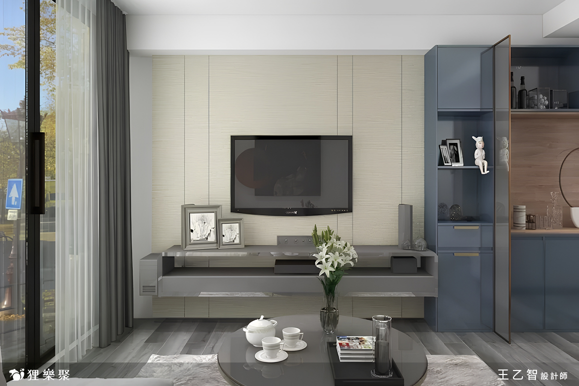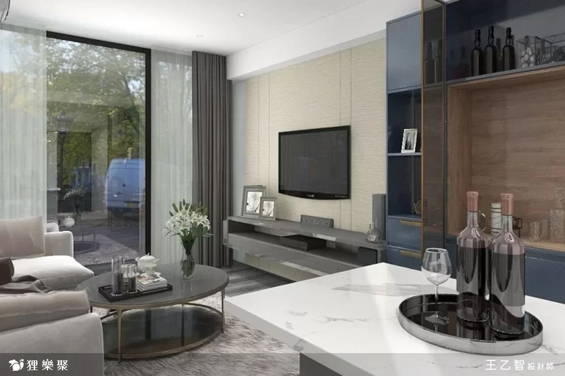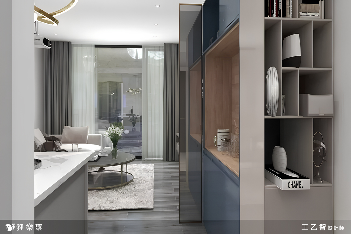 客廳系統櫃配色則選用木紋色搭配黛藍色的結晶鋼烤門板,亮面的表面材質帶來了微微的奢華感,和冰箱的鏡面材質遙遙呼應;為了擋煞的需求,設計師在客廳系統櫃設計中規劃了一座小小的屏風,選用半透的灰玻嵌入,讓屋主不會開門見窗,也能稍微區分客廳與餐廳的區域,但又不會影響走道空間、甚至阻絕空間感。延伸閱讀: << 裝潢該找統包或室內設計師?先看看差異再選擇! >>