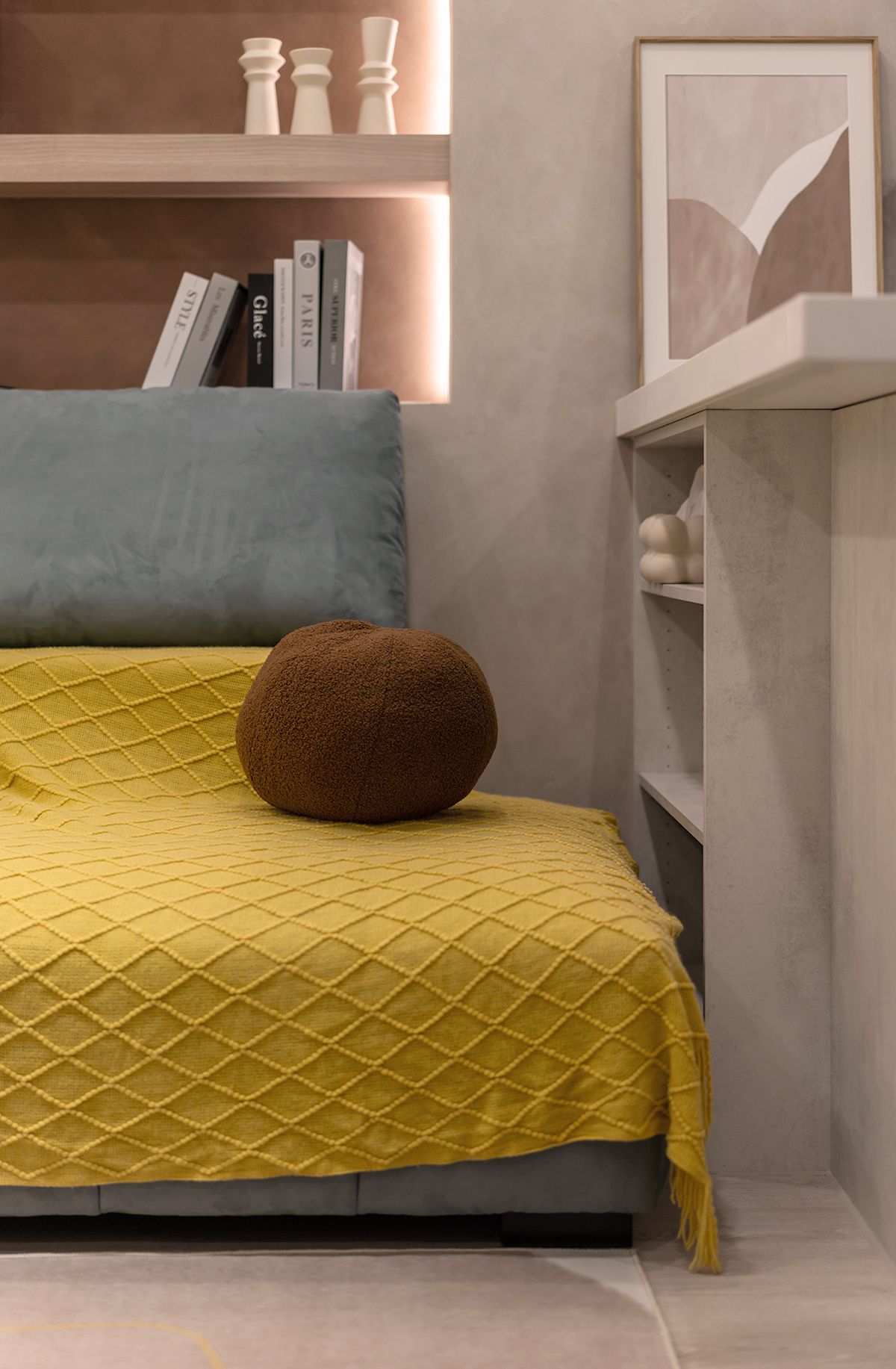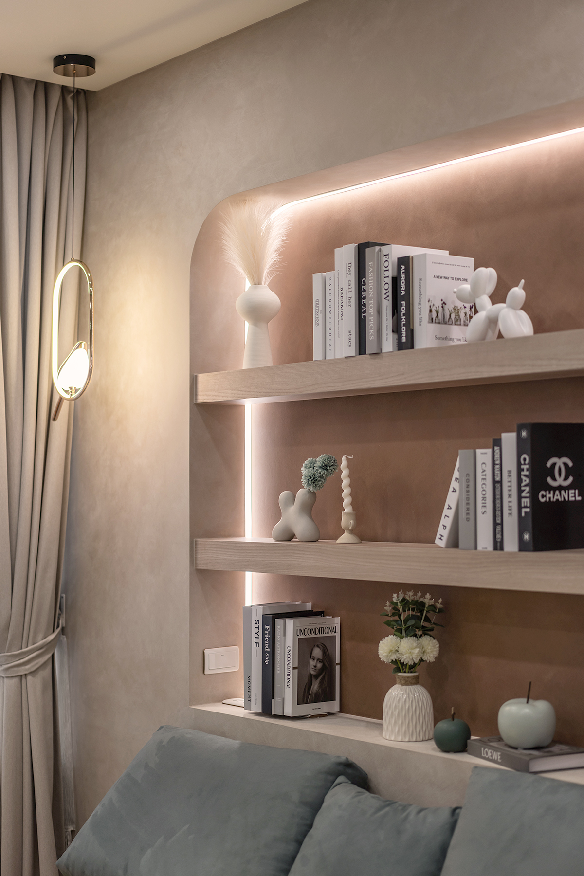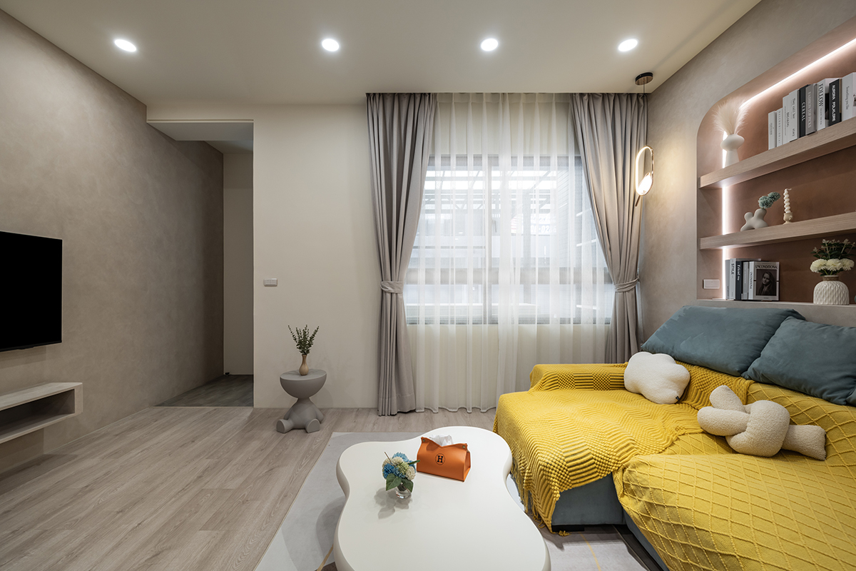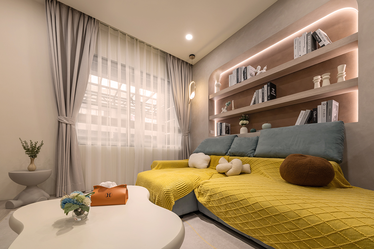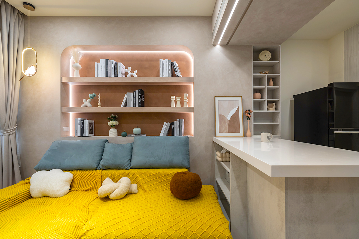 ▲ 善用各處空間,沙發後方設置開放式弧形櫃體