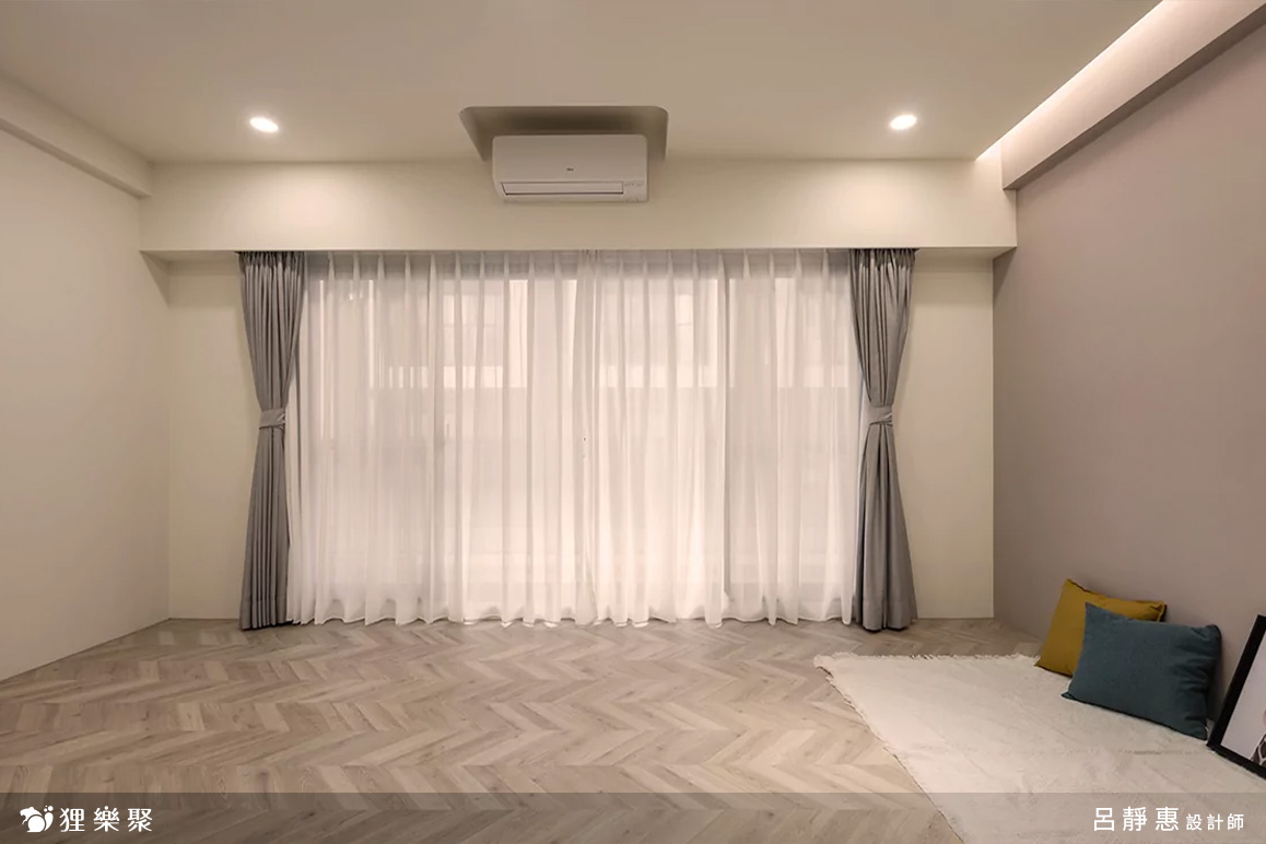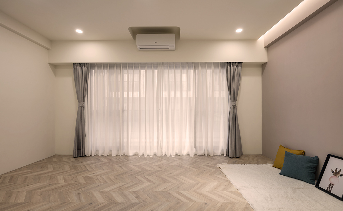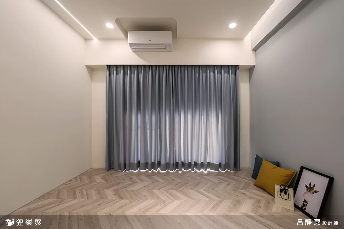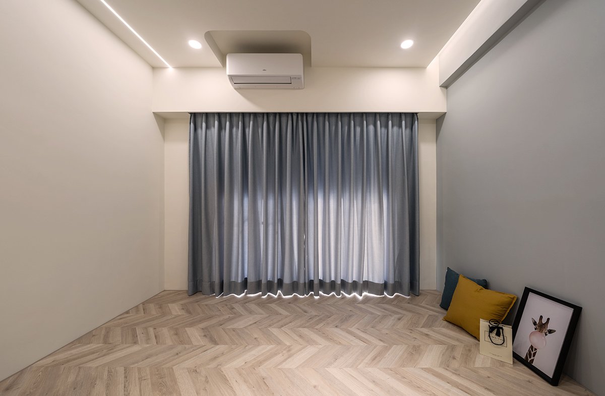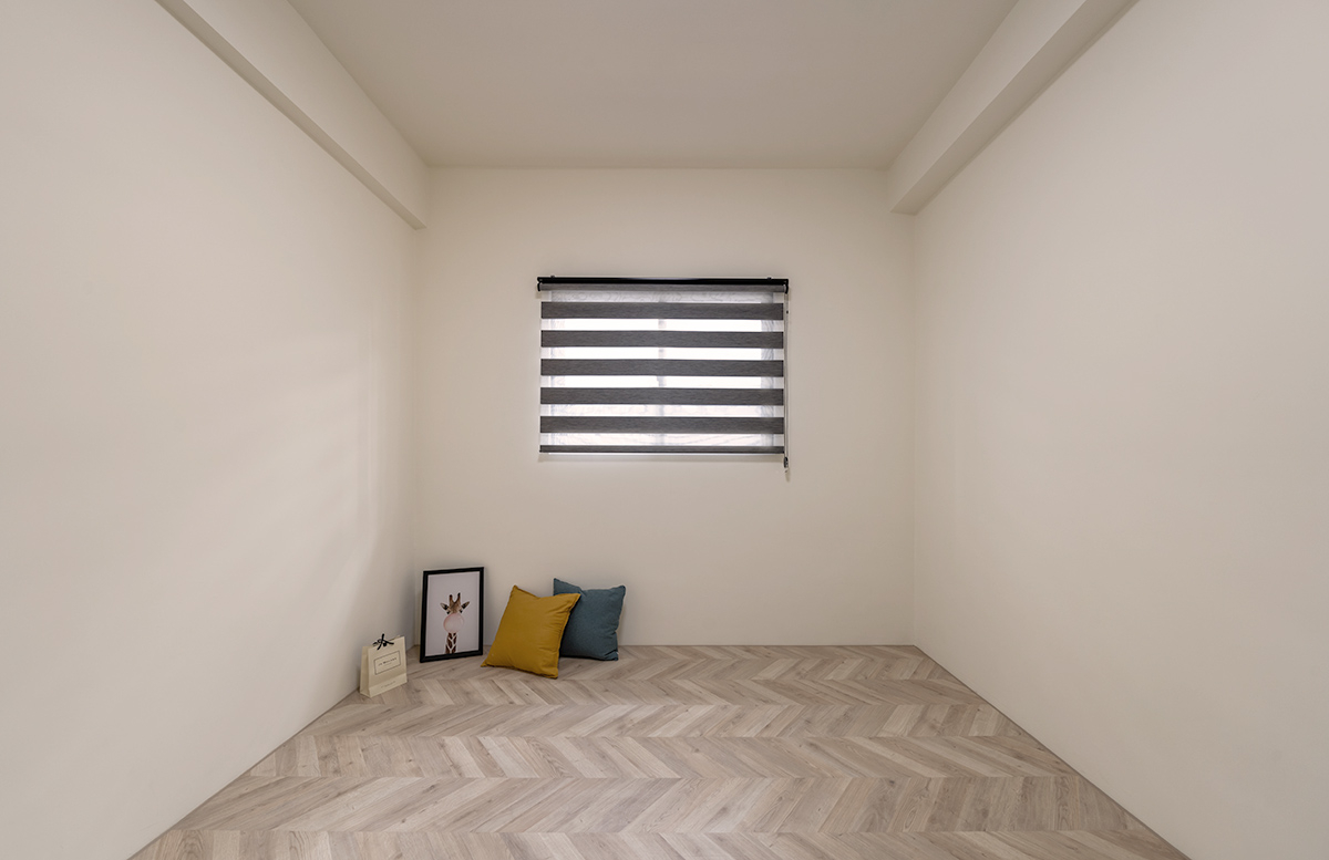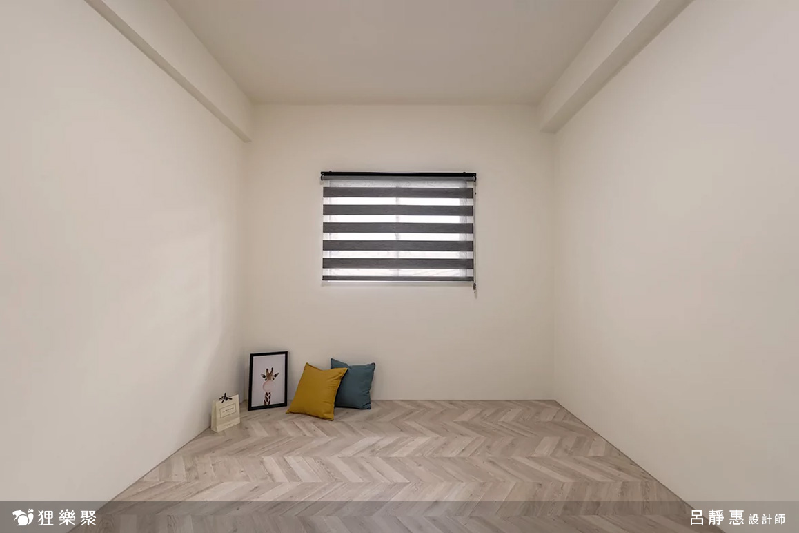 私領域的房間以魚骨拼木地板帶出柔雅的空間質感,襯上帶灰調的牆面配色,使整體放鬆且有層次,房間內的配置以家具為主,讓屋主能依照需求自行搭配,保有未來隨時變化的彈性。