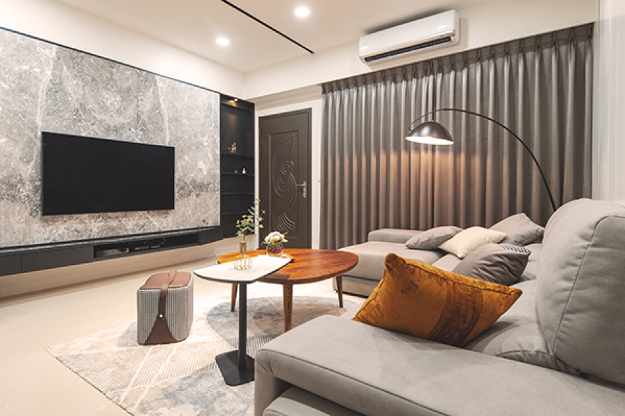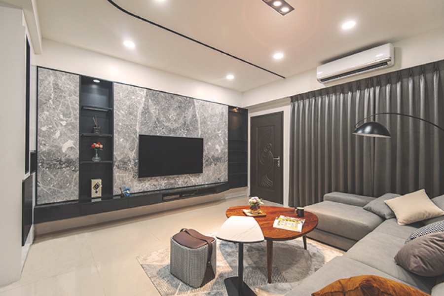 客廳電視牆的石材牆面讓空間顯得優雅寧靜,更帶了些許輕奢感。
