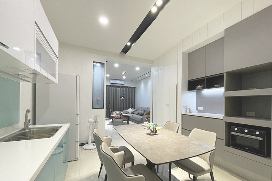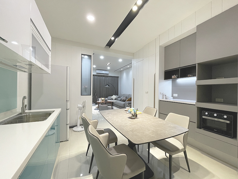 用極簡的黑、白、灰色塊,搭配流暢消光黑色俐落線條勾勒,讓整體廚房空間感呈現出簡潔又時尚品味。
