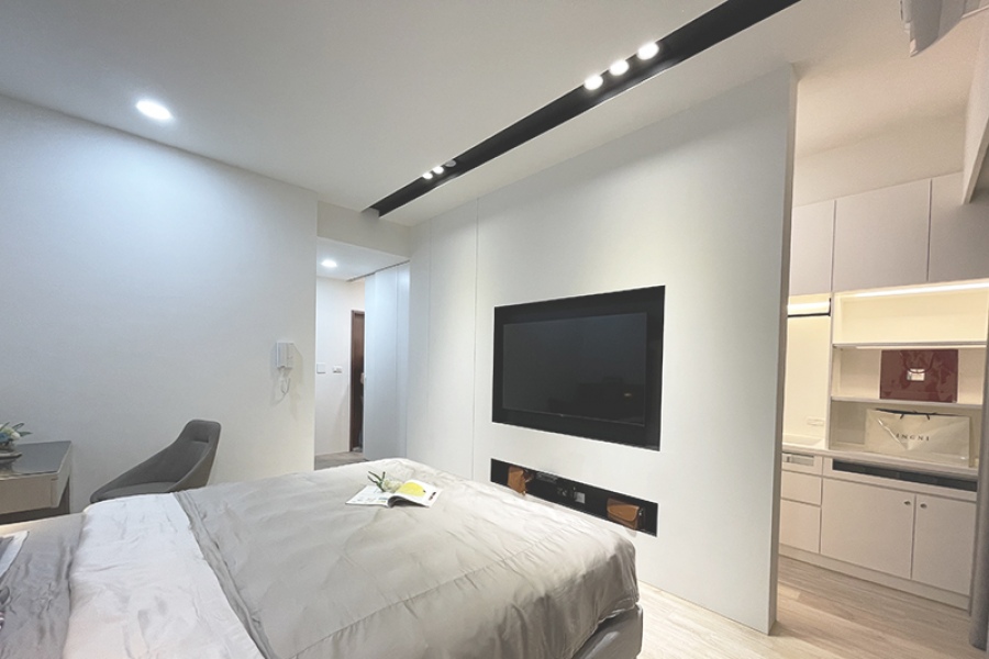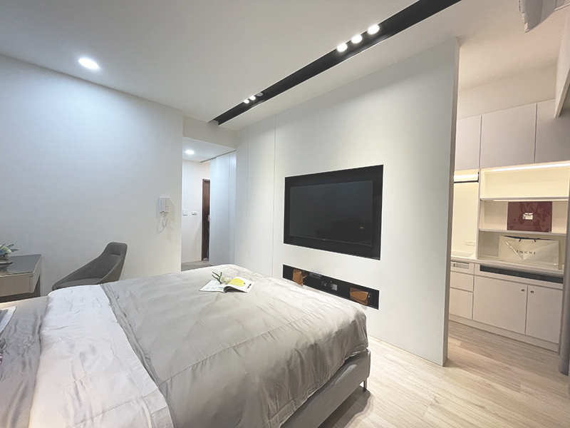 電視牆則以黑白塊體做為分割,呈現一種塊體堆疊俐落的懸空感。