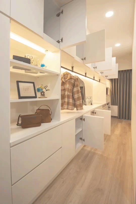 收納同時並存。而顧慮風水上門對門的問題,更衣室規劃隱藏門來區隔空間,而擁有大量儲物空間的開放式衣櫃則搭配燈
