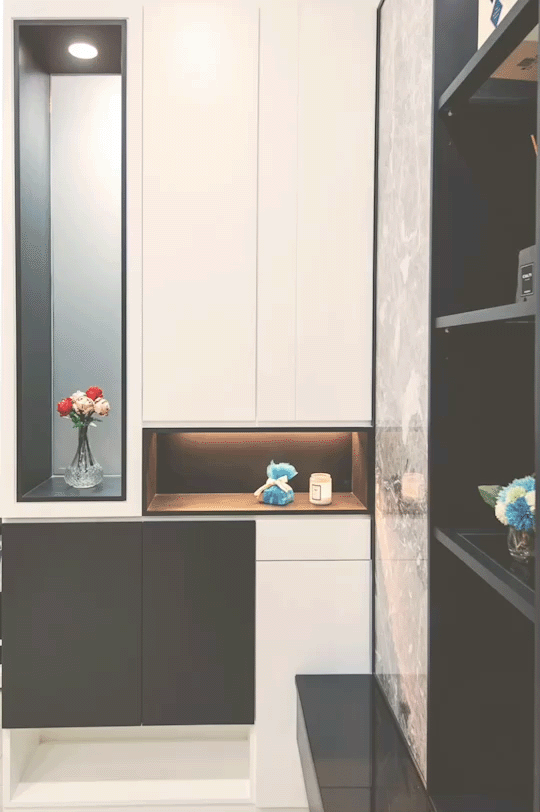 空間元素:黑白灰色塊×烤漆×天然石材×鏡面