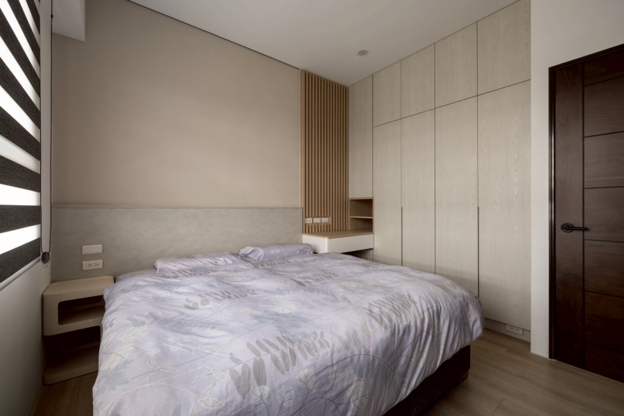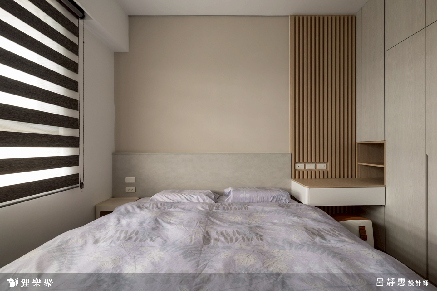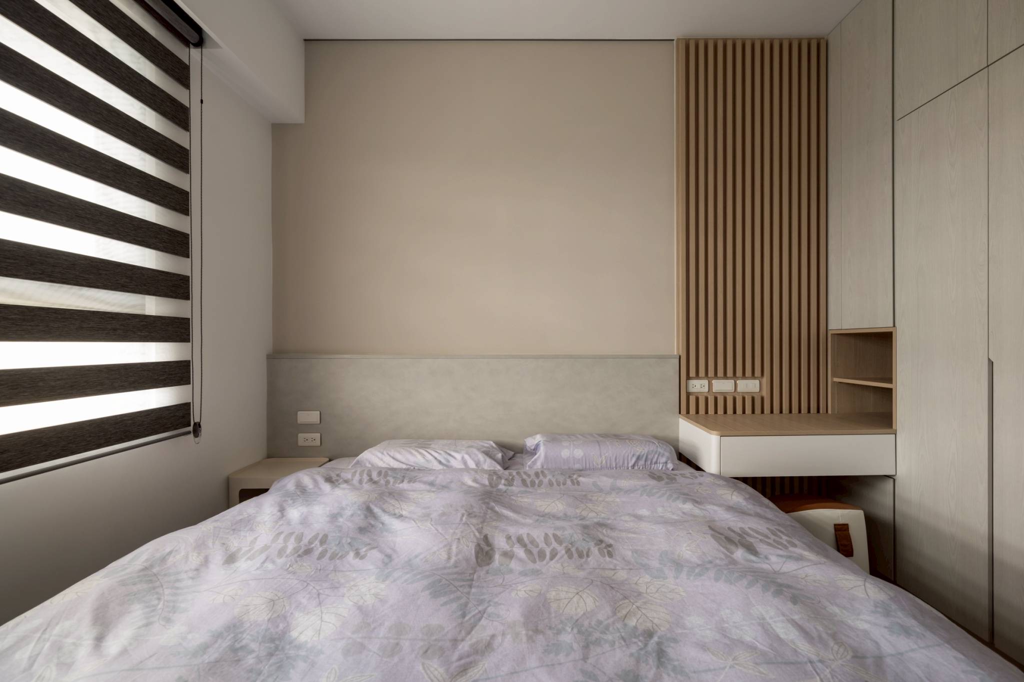 臥室延續北歐風明亮及自然調性,局部融入現代風的俐落線條,依照使用習慣為屋主分區規劃收納,讓衣櫃、梳妝櫃與床邊櫃各有獨立機能,確保睡眠區舒適溫馨。床頭牆選用低彩度特殊漆與簡約木格柵修飾,塑造靜謐的休憩氛圍,讓屋主結束了忙碌的一天後能好好放鬆休息。