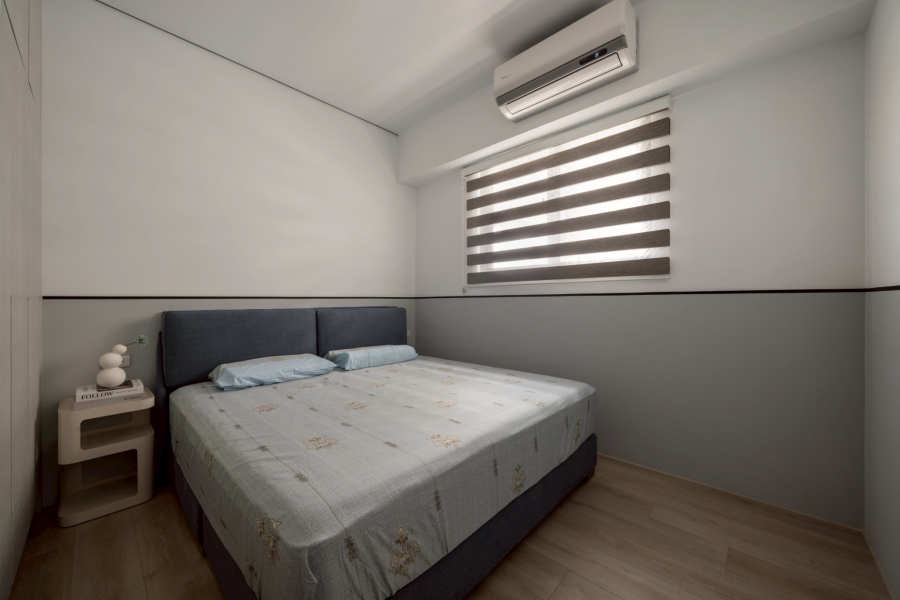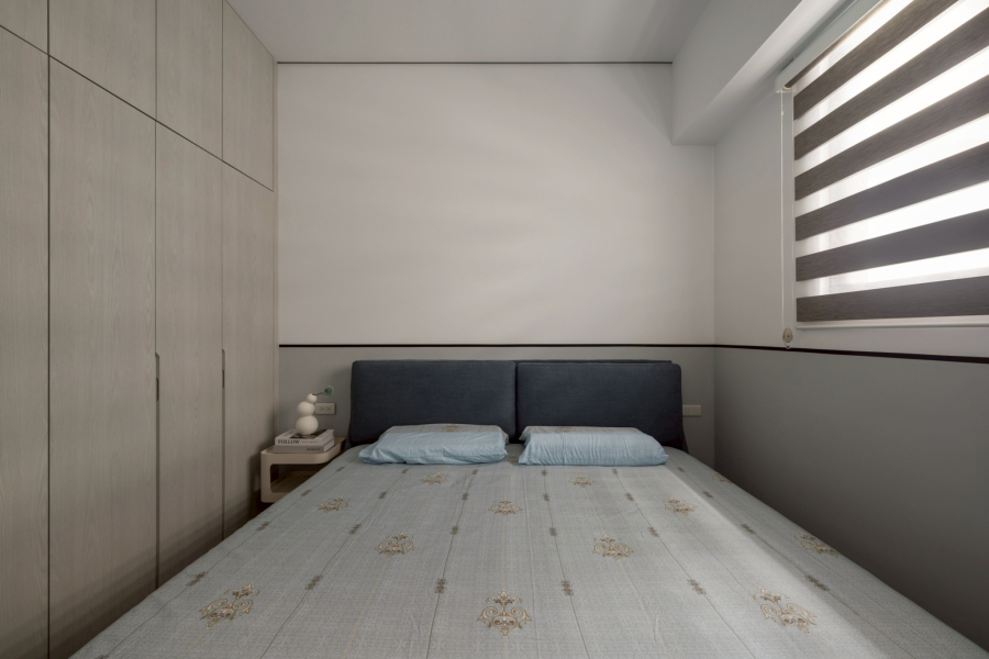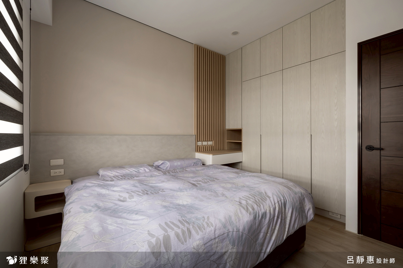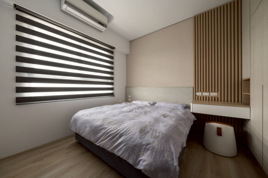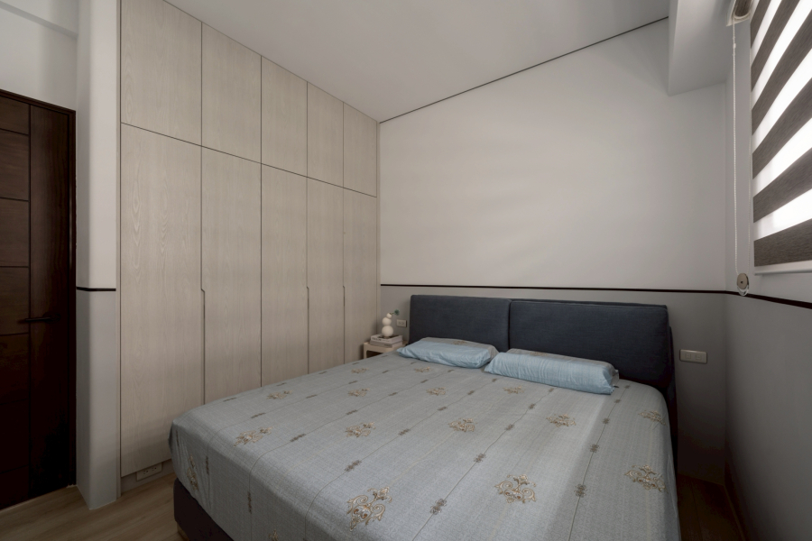臥室延續北歐風明亮及自然調性,局部融入現代風的俐落線條,依照使用習慣為屋主分區規劃收納,讓衣櫃、梳妝櫃與床邊櫃各有獨立機能,確保睡眠區舒適溫馨。床頭牆選用低彩度特殊漆與簡約木格柵修飾,塑造靜謐的休憩氛圍,讓屋主結束了忙碌的一天後能好好放鬆休息。