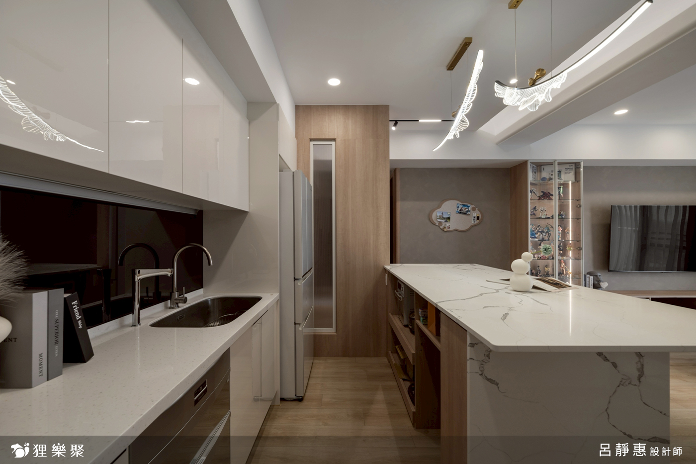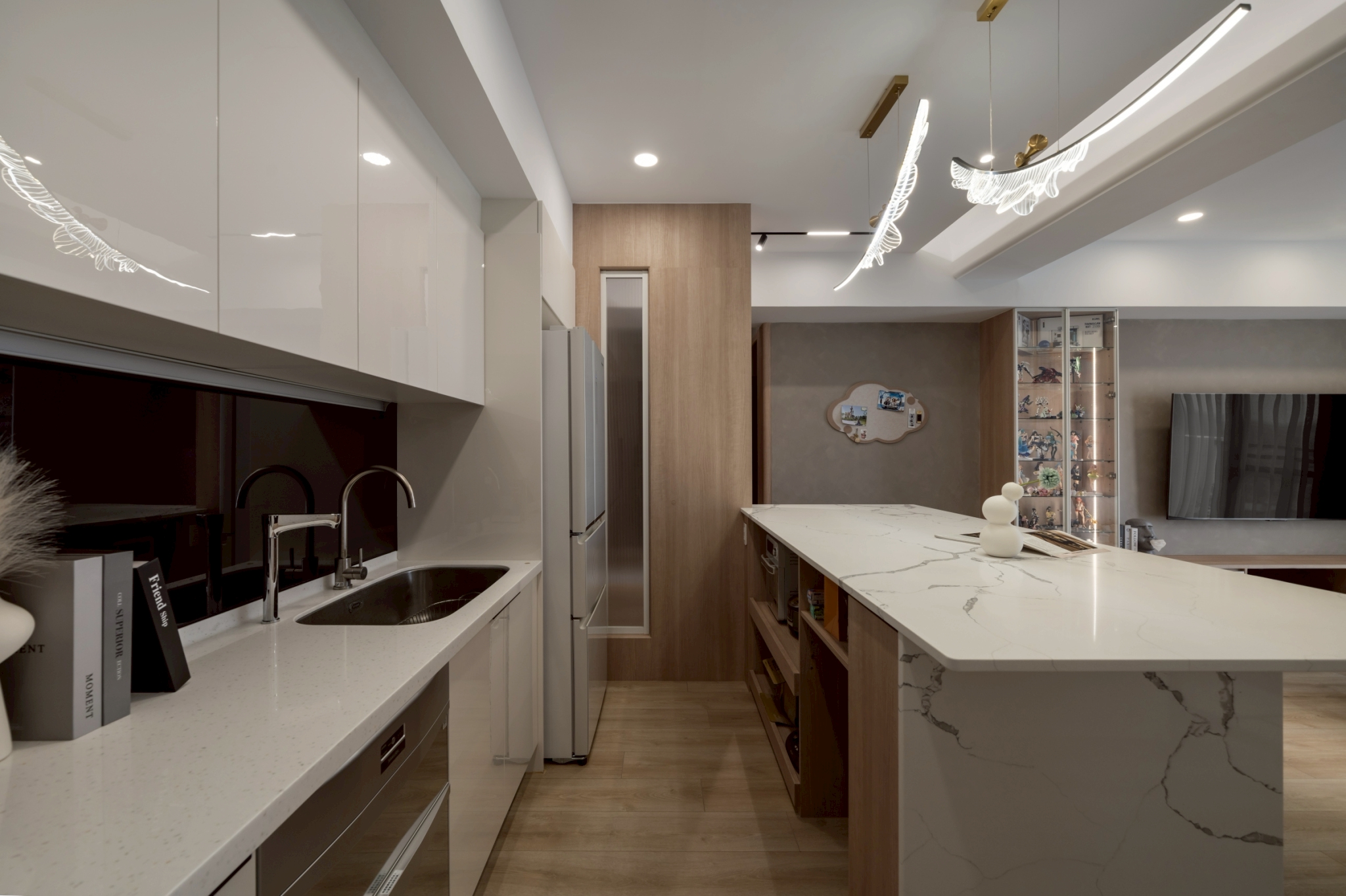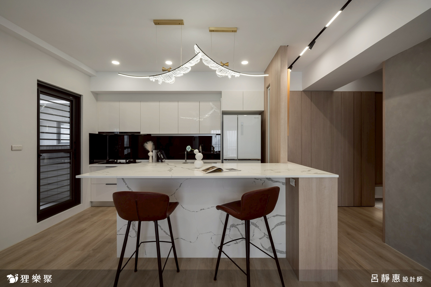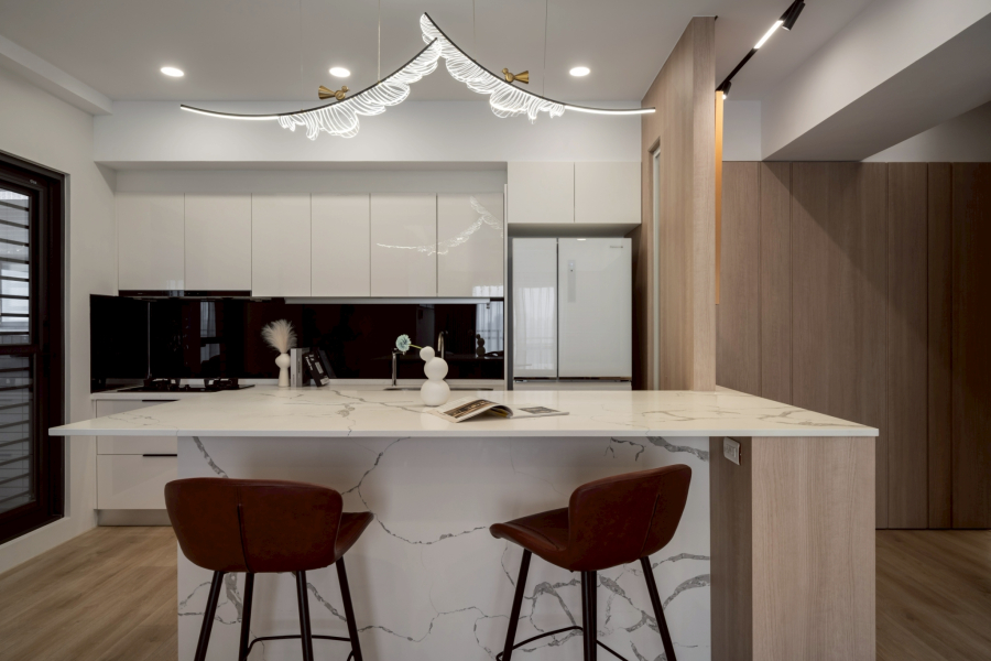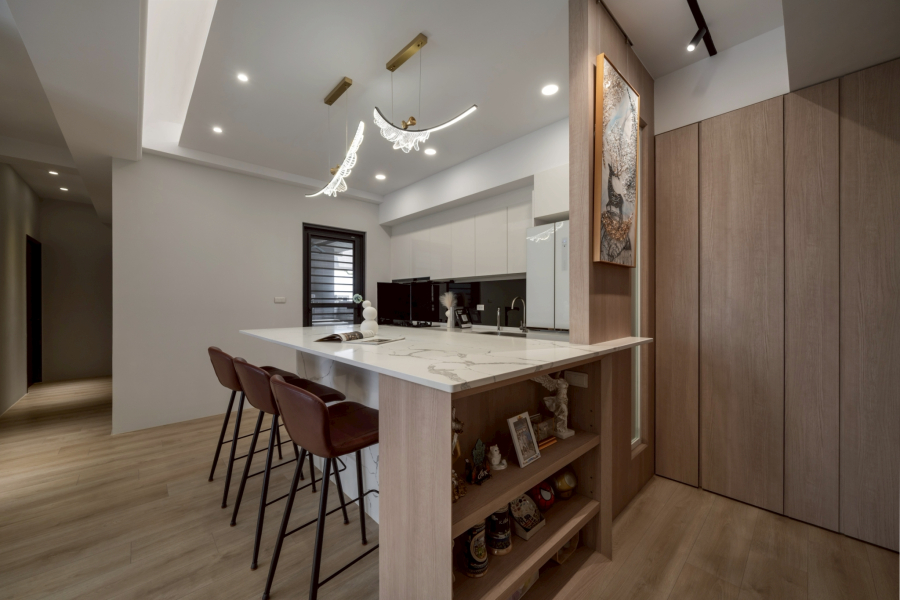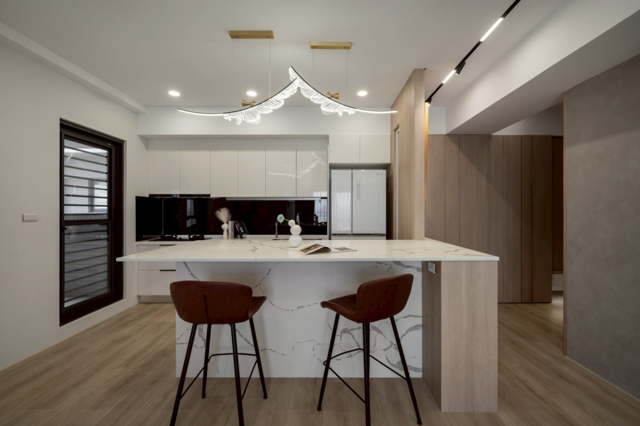 中島餐廚區結合了北歐風咖啡廳氛圍及現代風簡約設計,不僅能備料、用餐、工作,也是居家情感交流的核心。中島選用石英石檯面,紋理質感自然高雅,搭配線條俐落的雙喜鵲吊燈,以及天花有如風吹般的曲線層次設計,展現猶如大自然般的溫馨舒適氛圍。